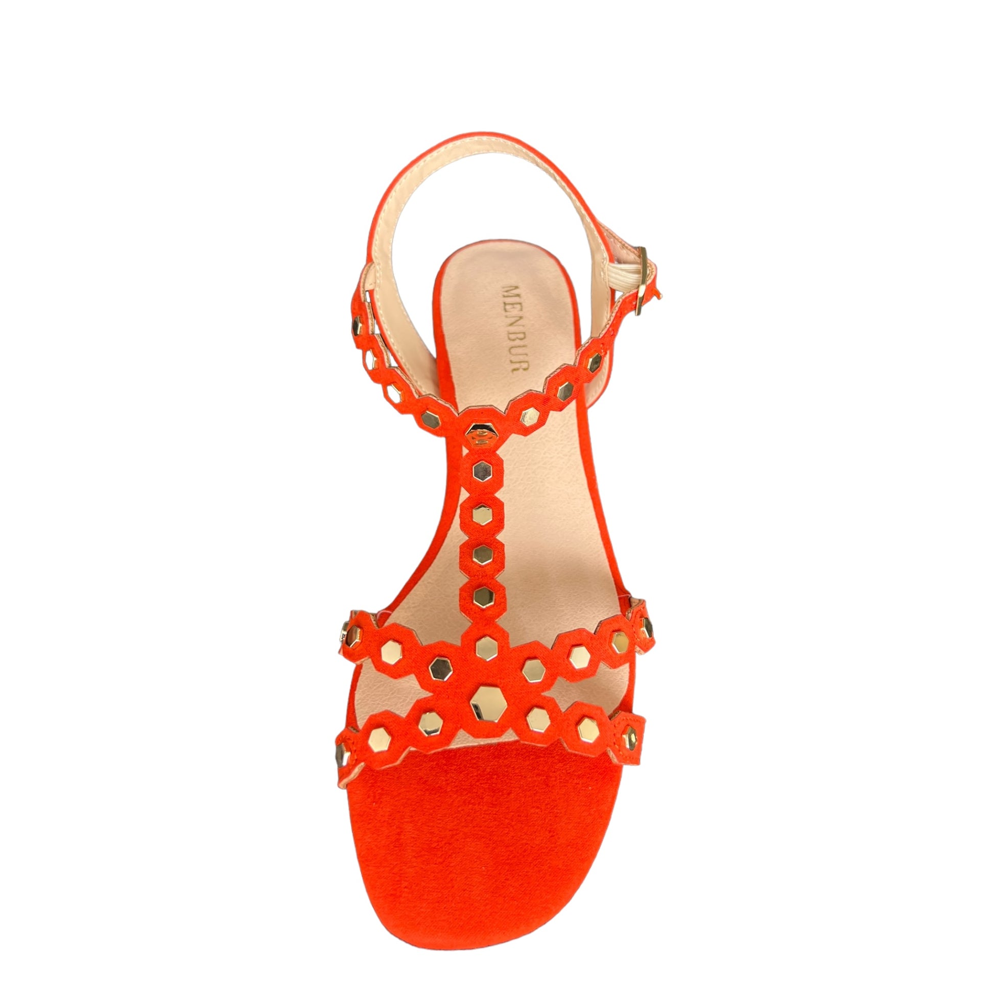 Sandalo arancio corallo scamosciato con dettagli borchie oro sulle fasce .