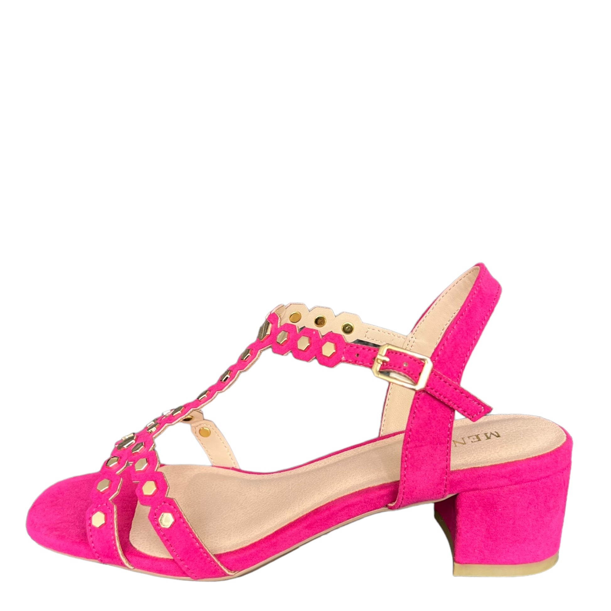 Sandalo arancio fucsia scamosciato con dettagli borchie oro sulle fasce .
