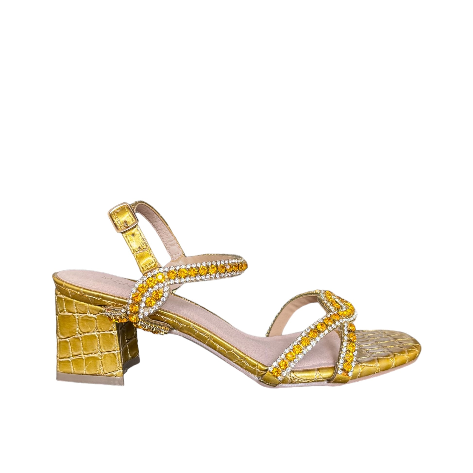 Sandalo In tessuto pitonato oro con gioielli sul davanti