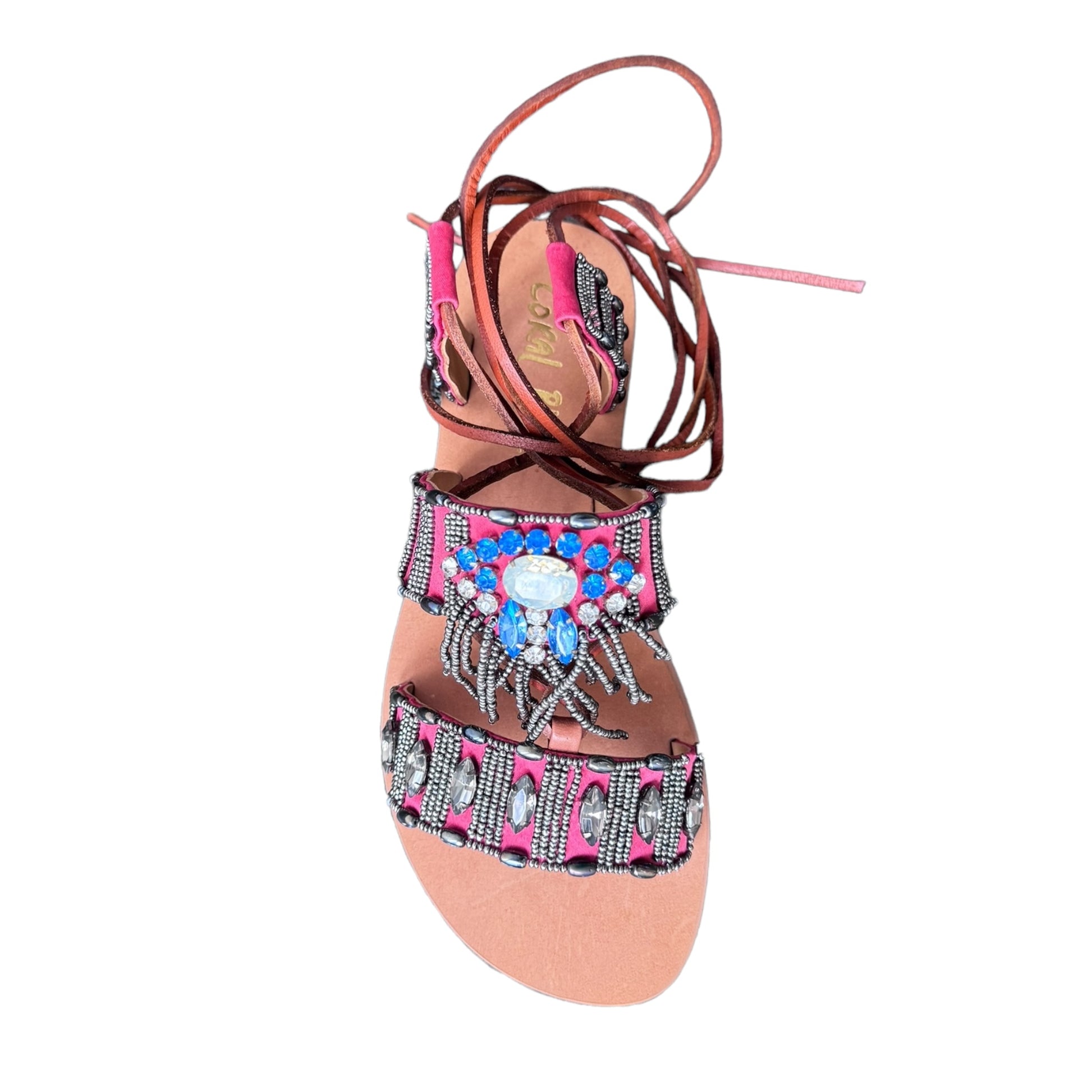Sandalo rosso presenta un design allacciato, con cinturini che possono essere allacciati attorno alla caviglia o al polpaccio. Ha un mix di perline e pietre nere e turchesi incastonate sulla parte superiore del sandalo.