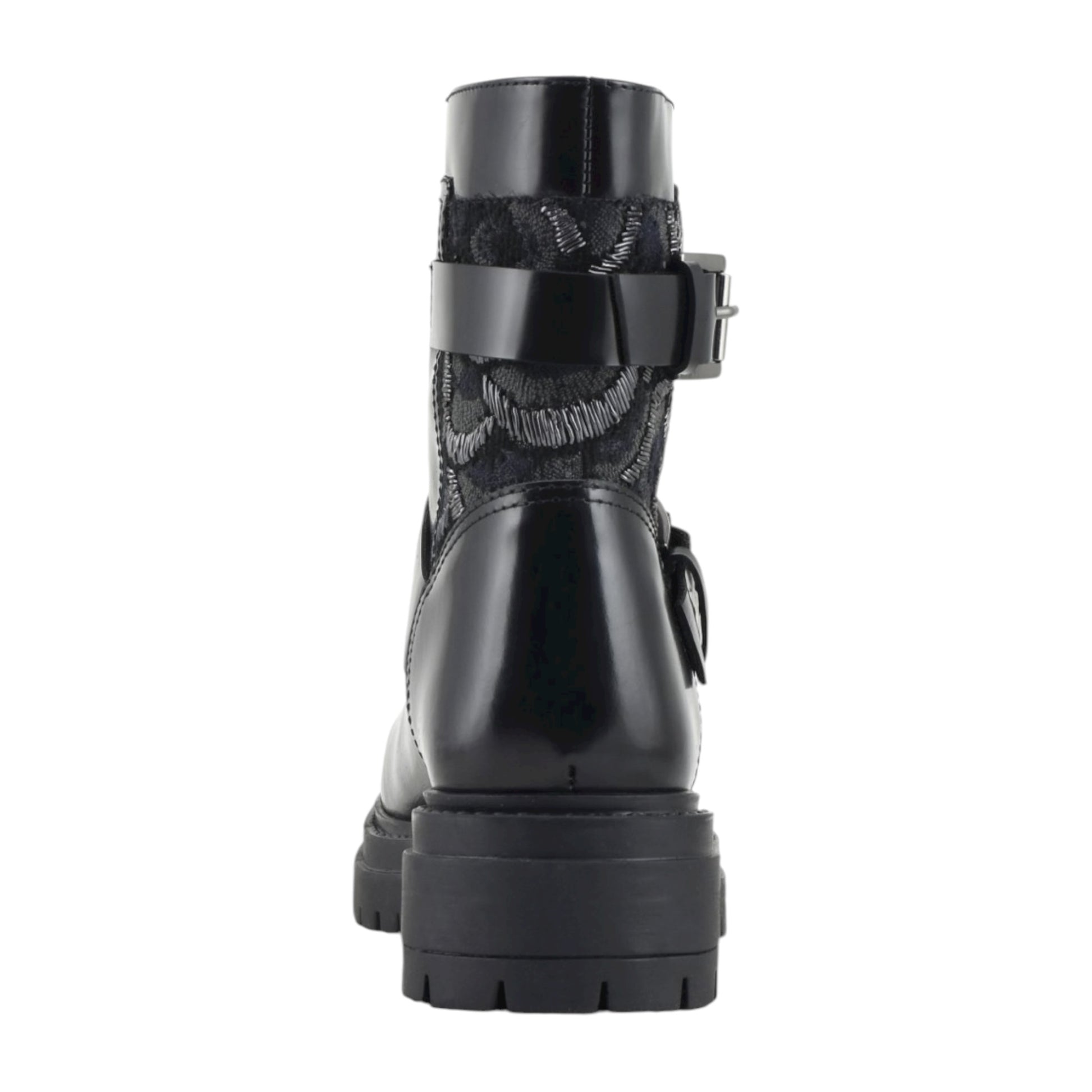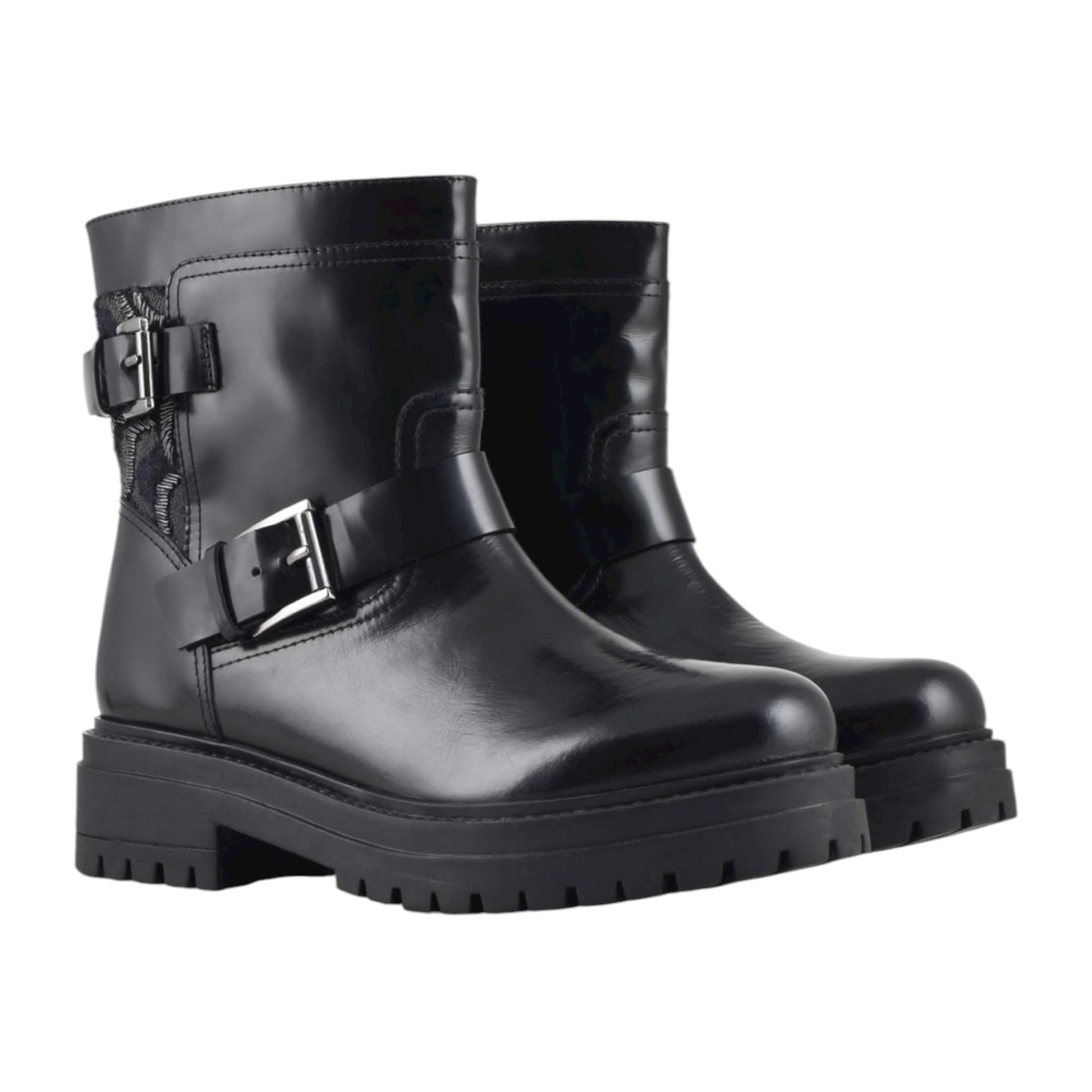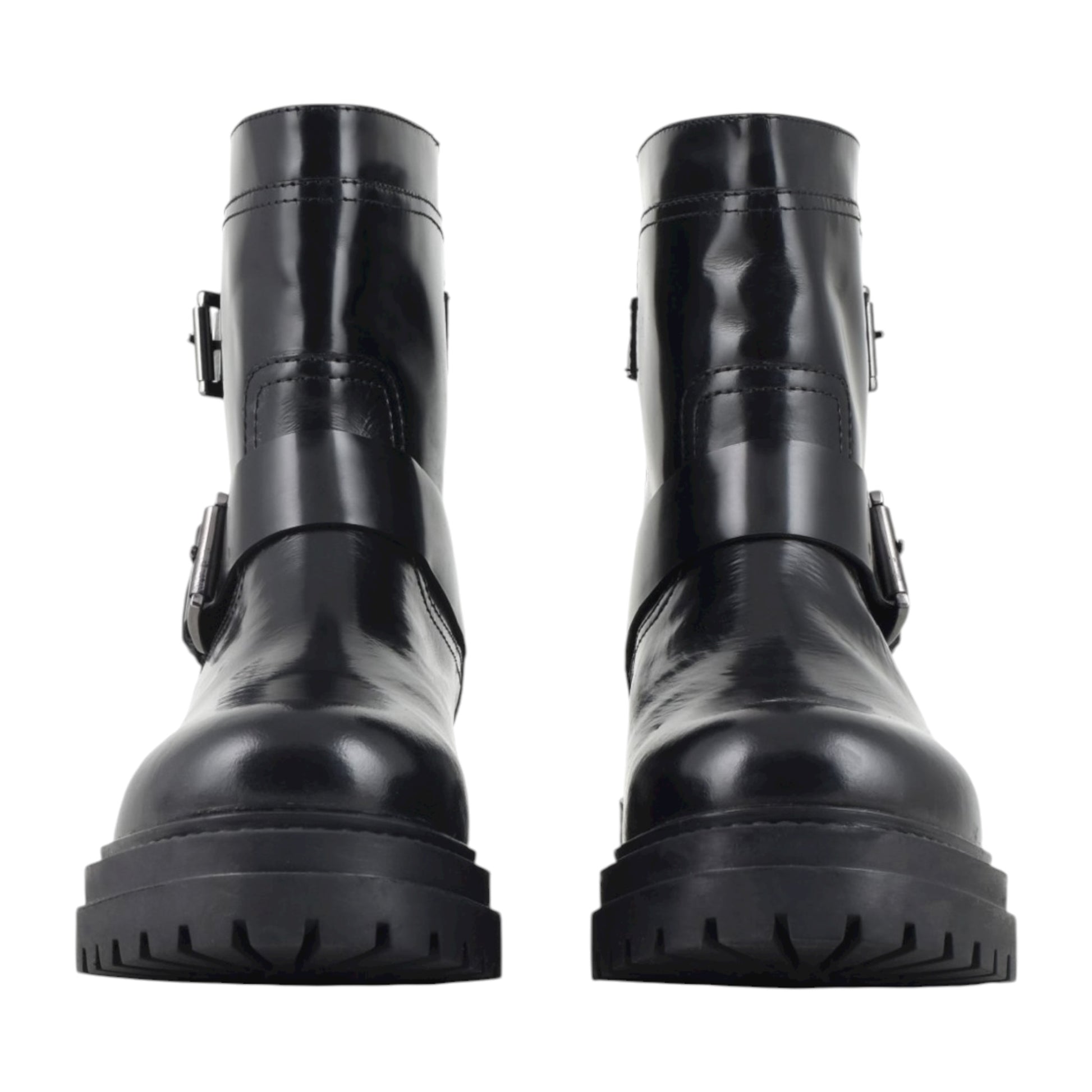 Stivaletto in pelle, doppia fibbia, tinta unita, interno in pelle e punta tonda.