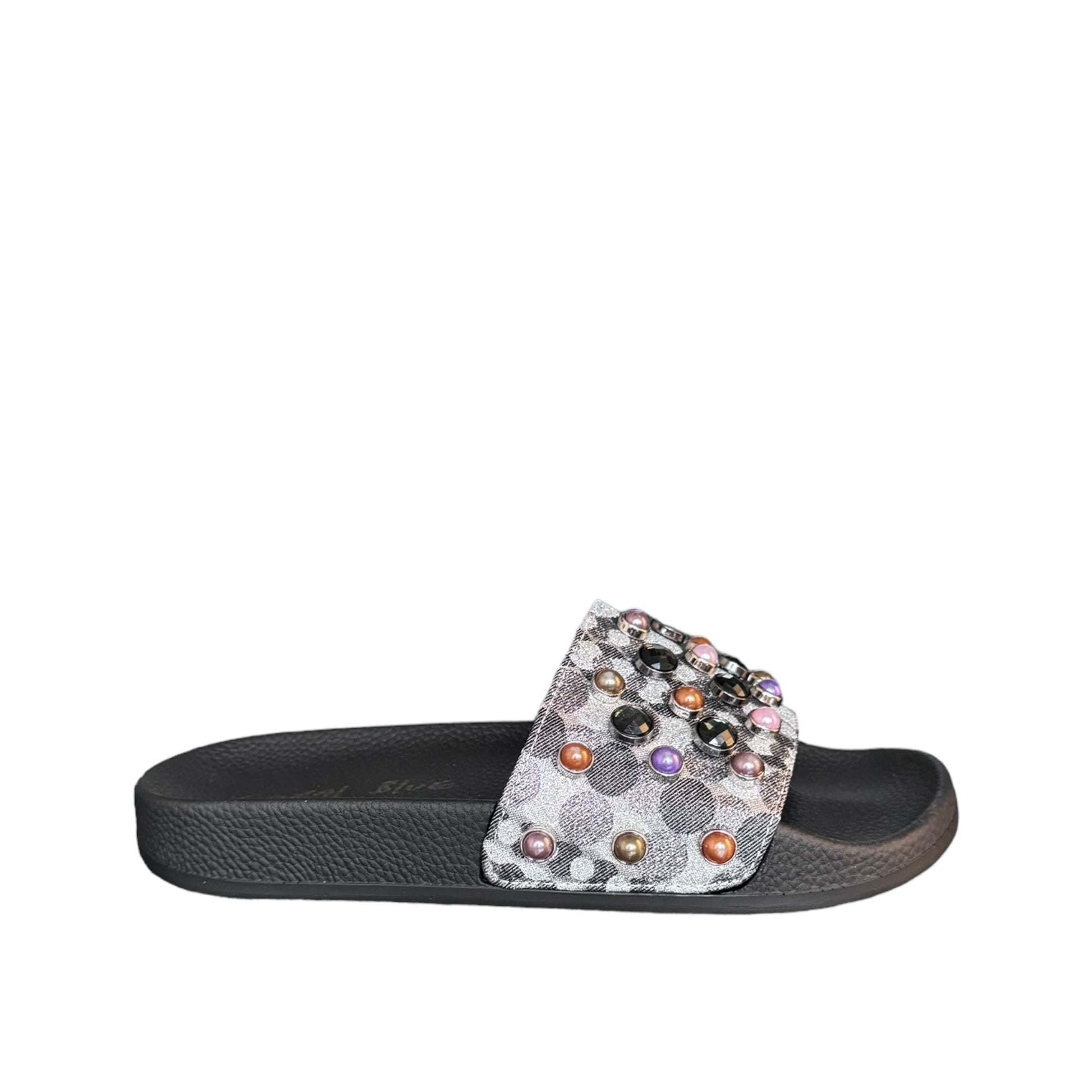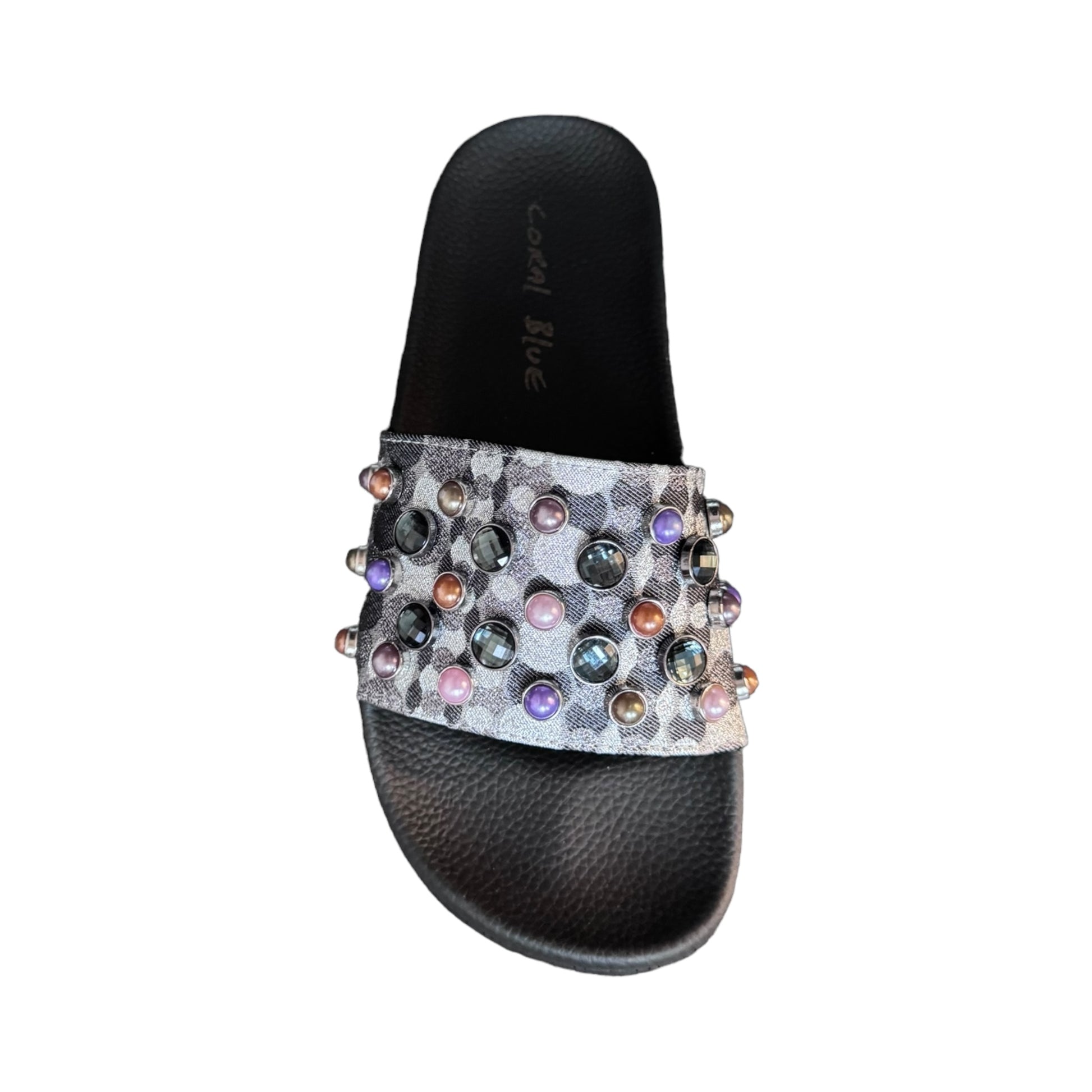 Ciabatta In gomma nera con cinturino in tessuto laminato argento e perline multi color sul davanti