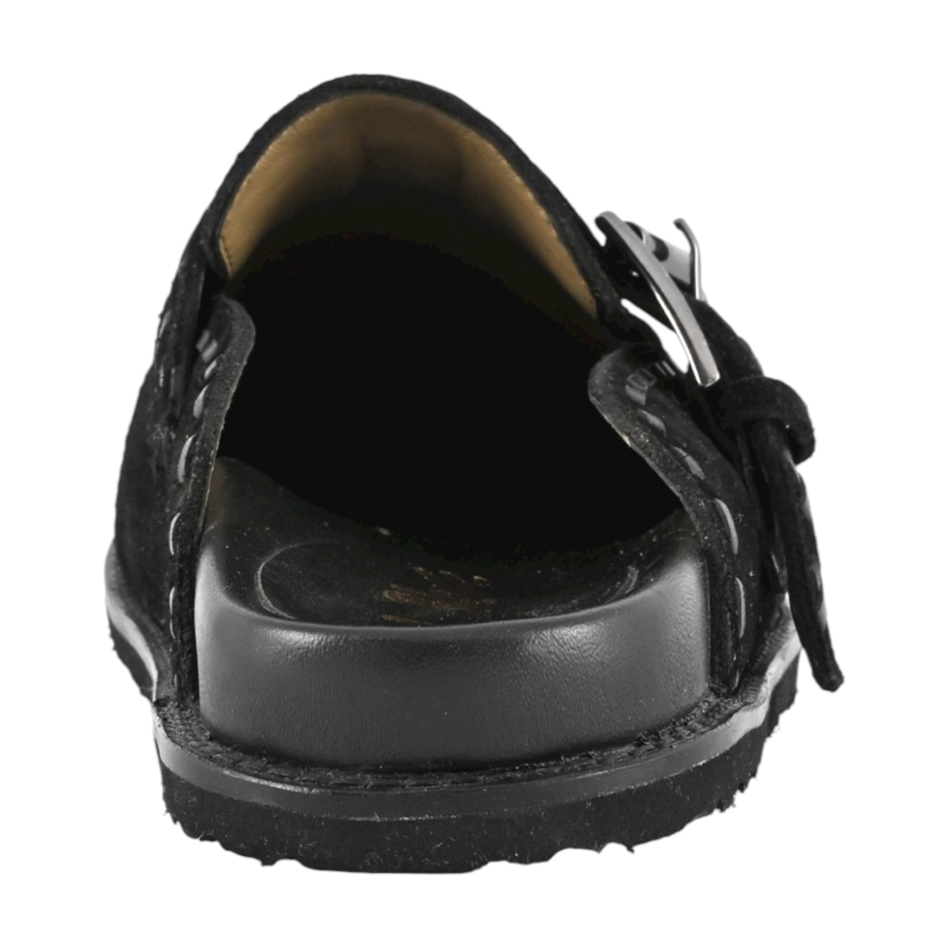 Ha il soletto, la tomaia e la fodera interamente in pelle con cuciture etniche il sabot di ispirazione navajo.