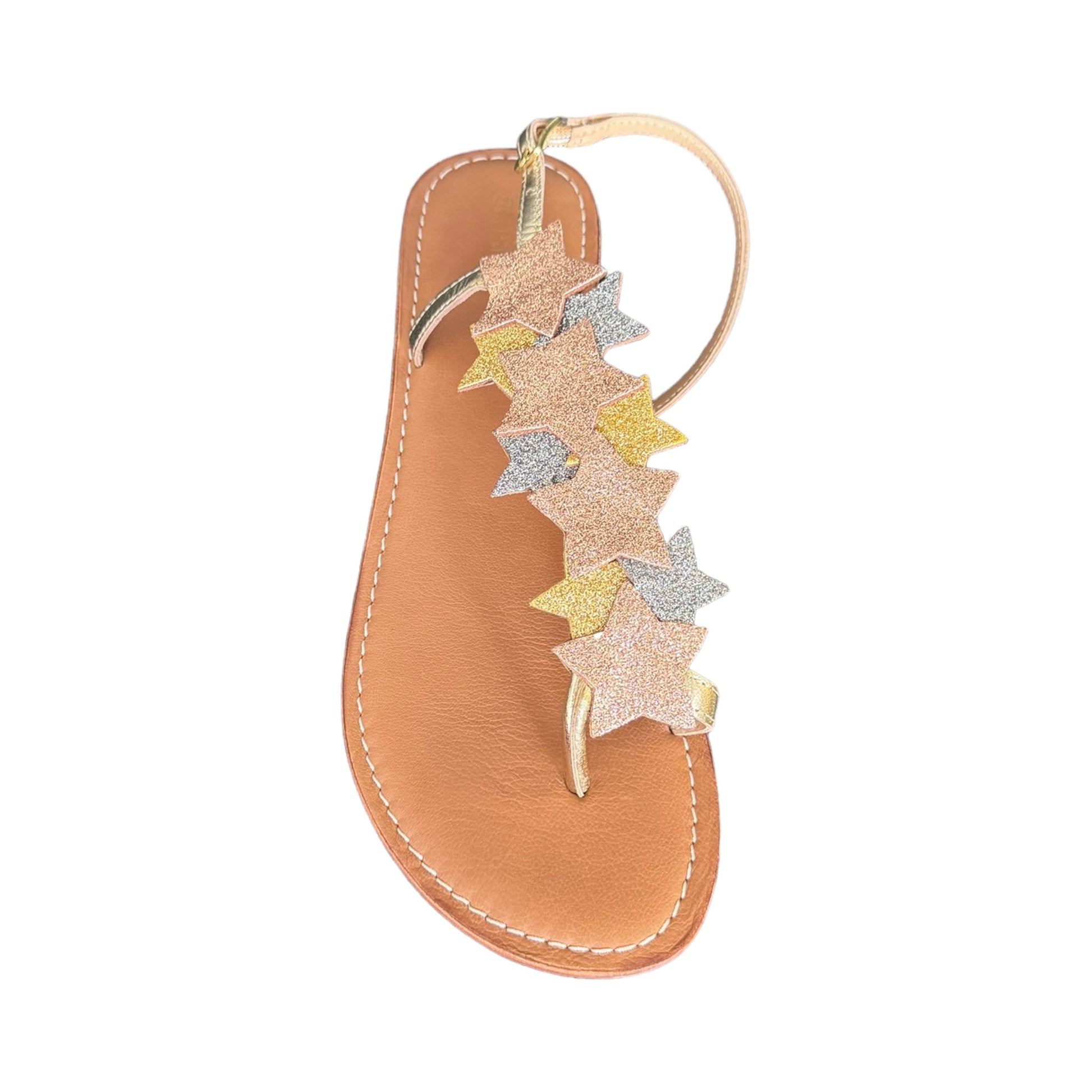 sandalo basso infradito con cinturini in oro e stelle multi color brillantinate sul davanti