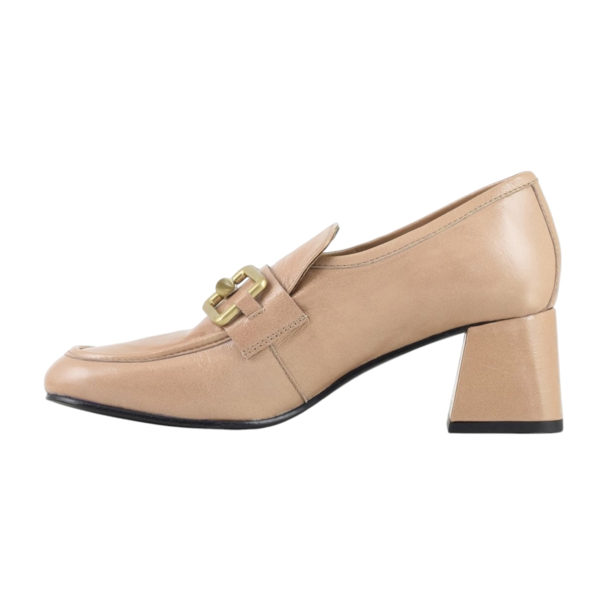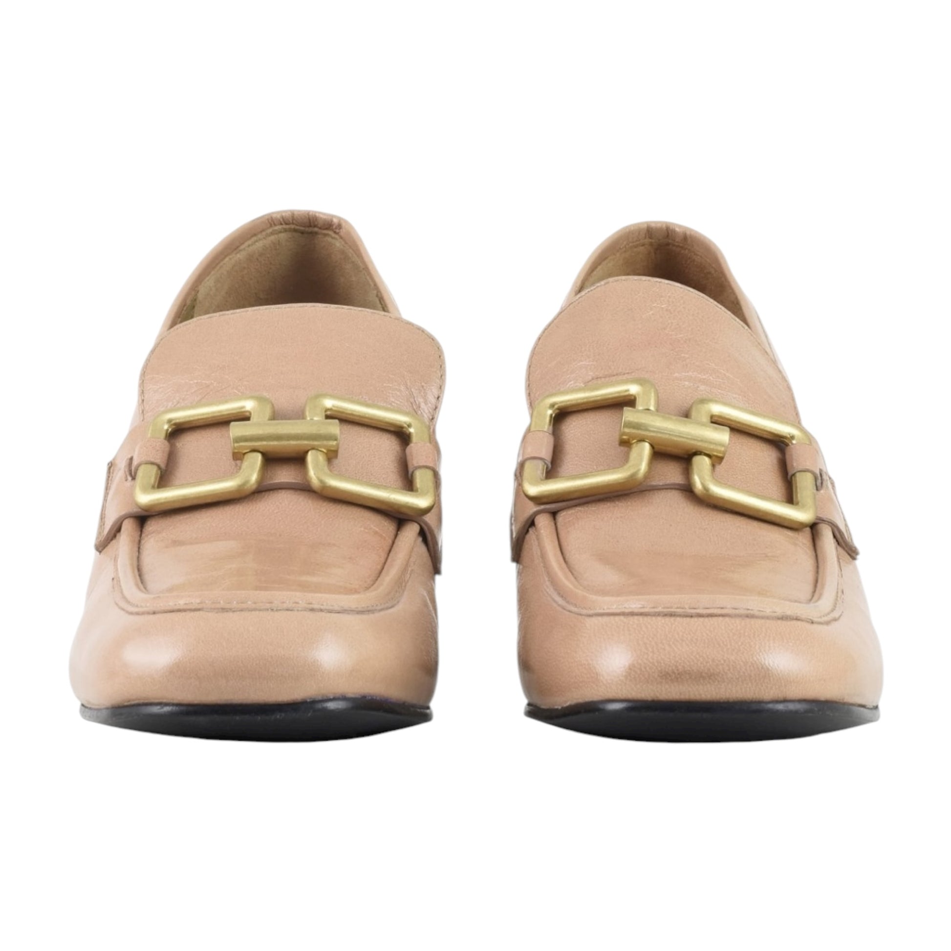mocassino in naplack si presenta con punta e tacco squadrati, linee eleganti e un raffinato morsetto in metallo dorato.