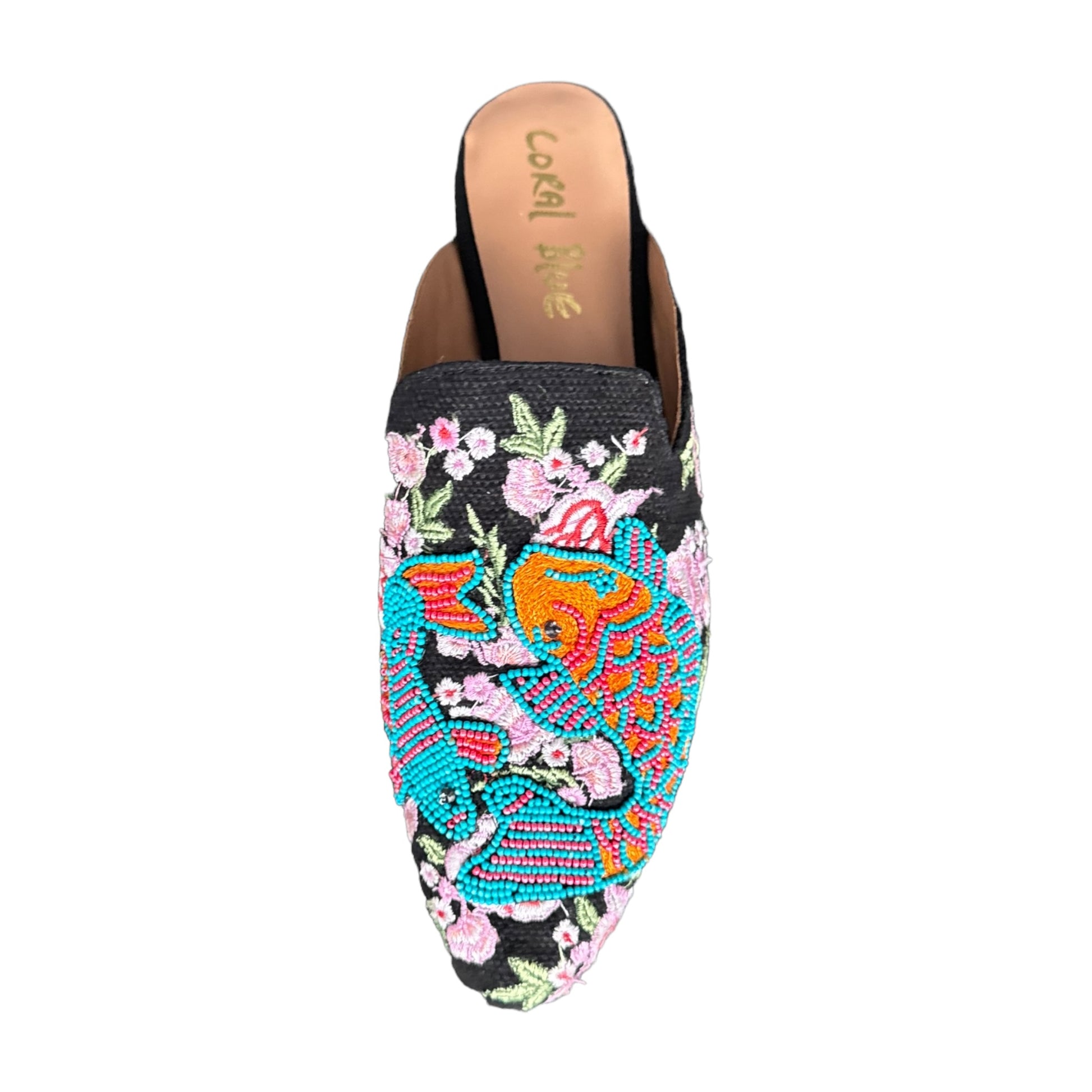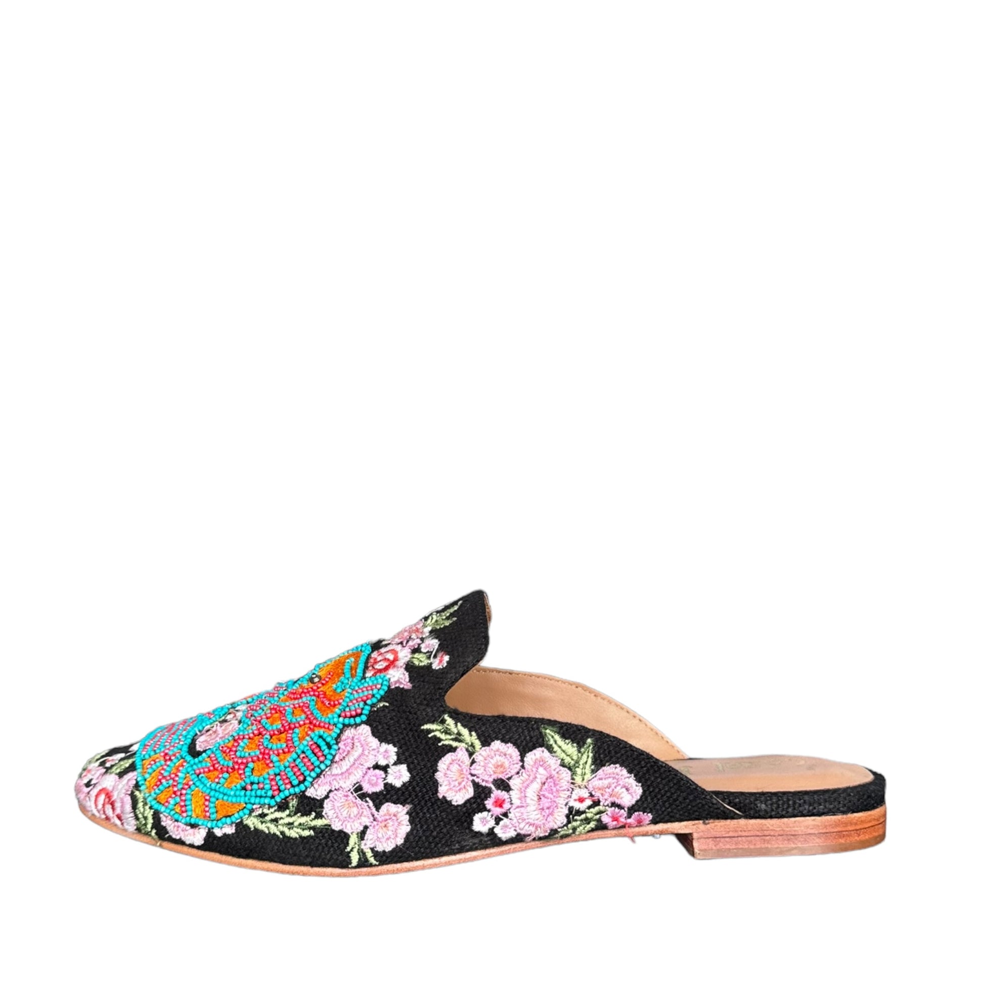 Sabot in tessuto nero con decorazioni cinesi in perline e ricami