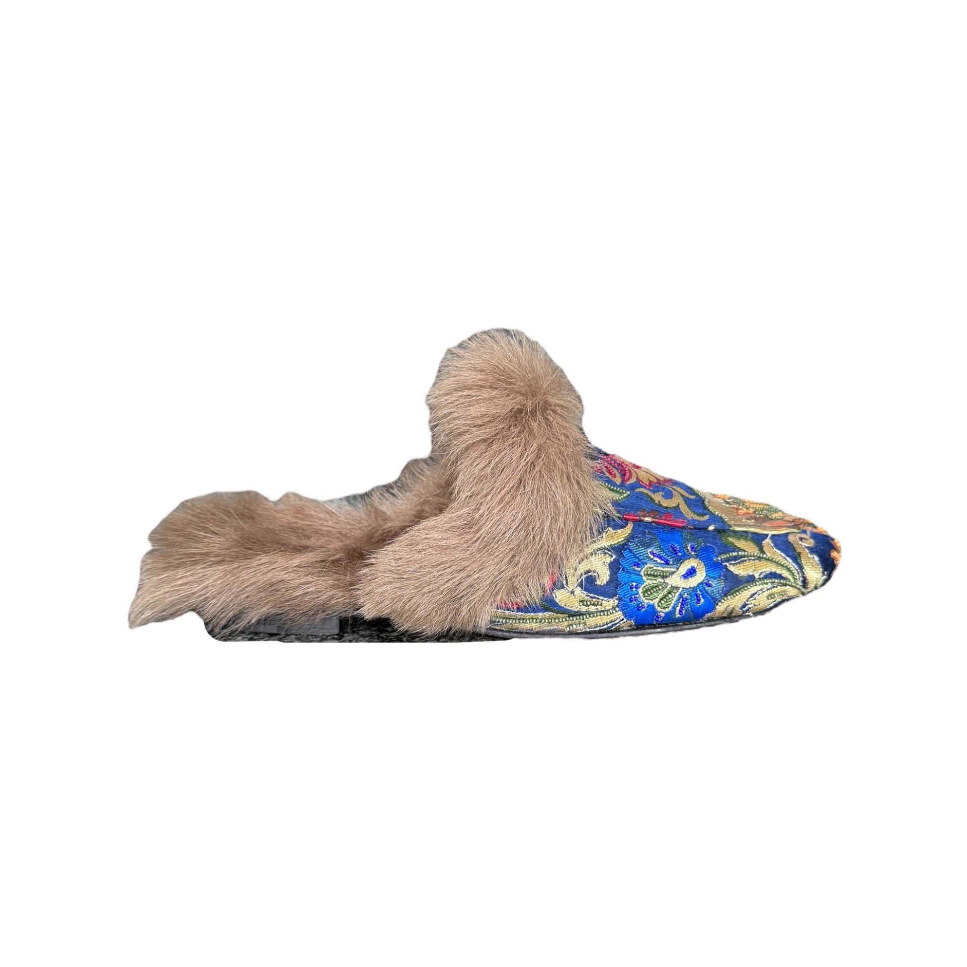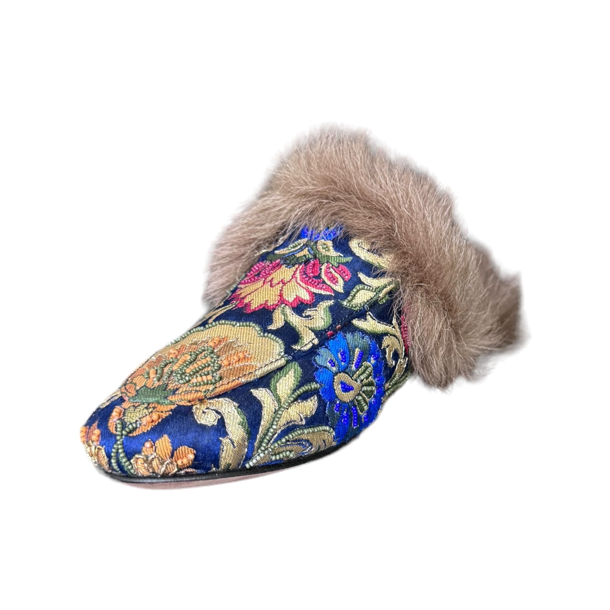 Sabot tomaia in broccato stampato blu multi color, punta a mandorla e interno in pelliccia