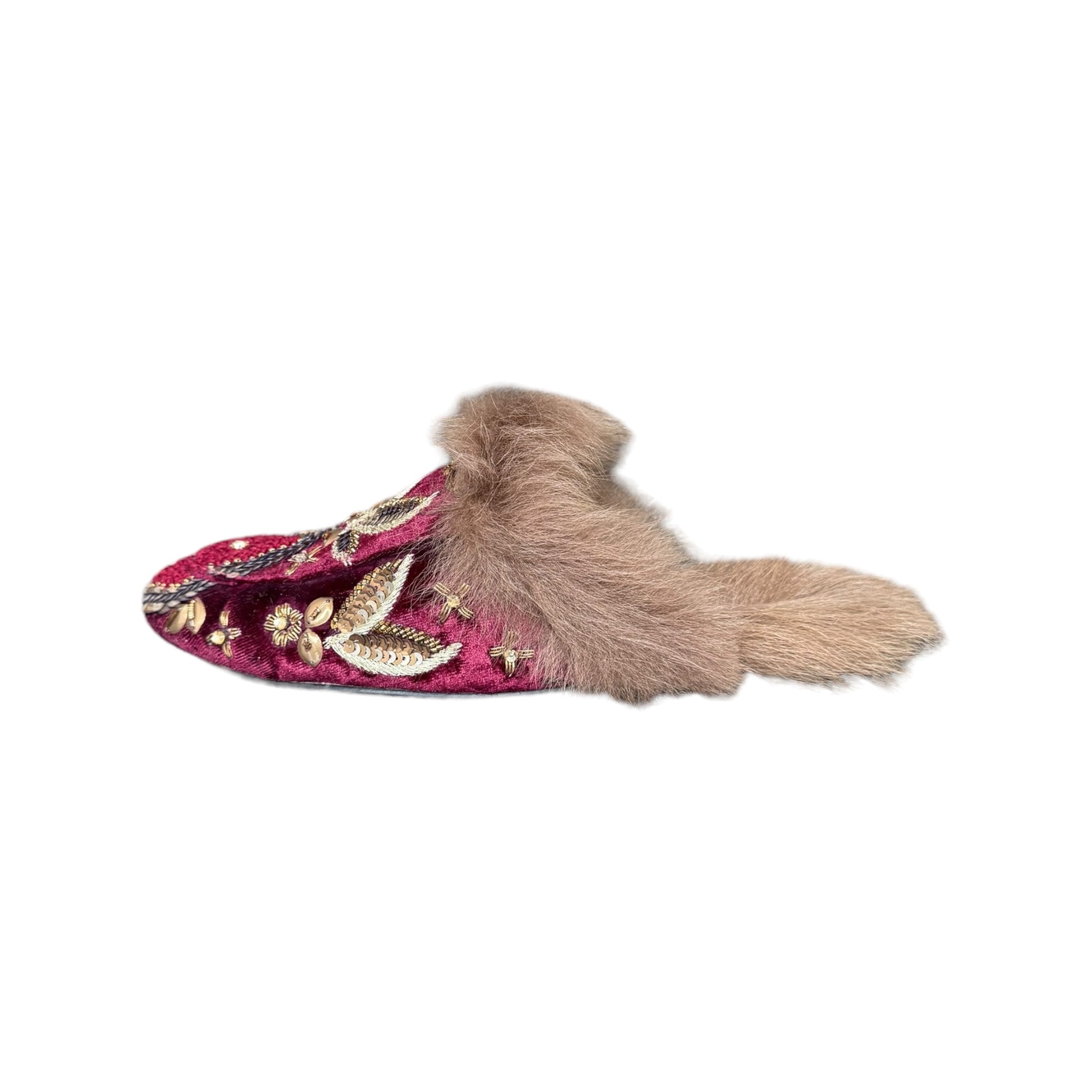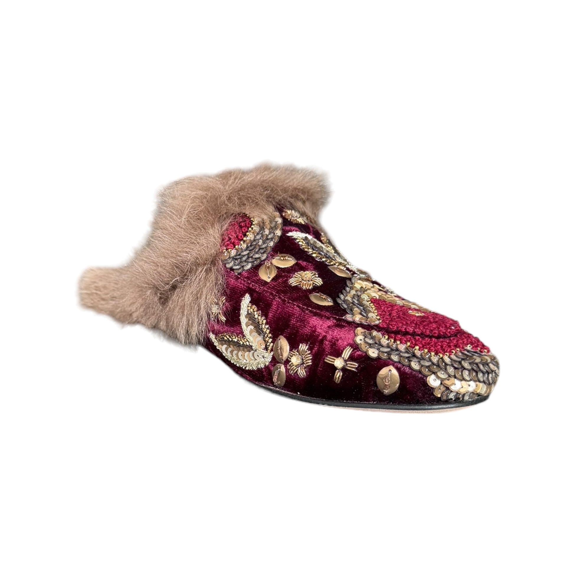Sabot tomaia in broccato stampato bordeaux e oro, punta a mandorla e interno in pelliccia