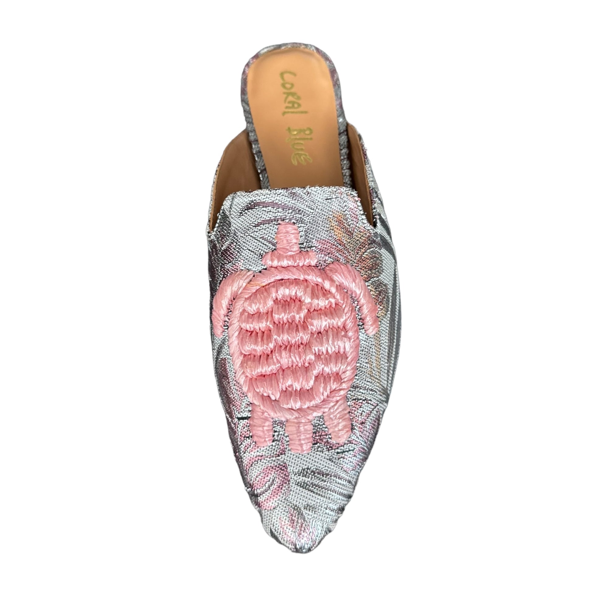 Sabot in argento laminato con tartaruga rosa sul davanti