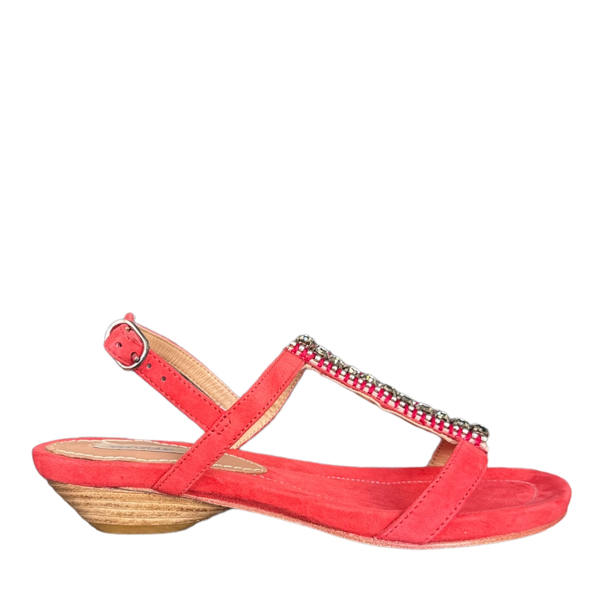 Sandalo rosso in tessuto con tacco basso in legno e decorazioni sul davanti