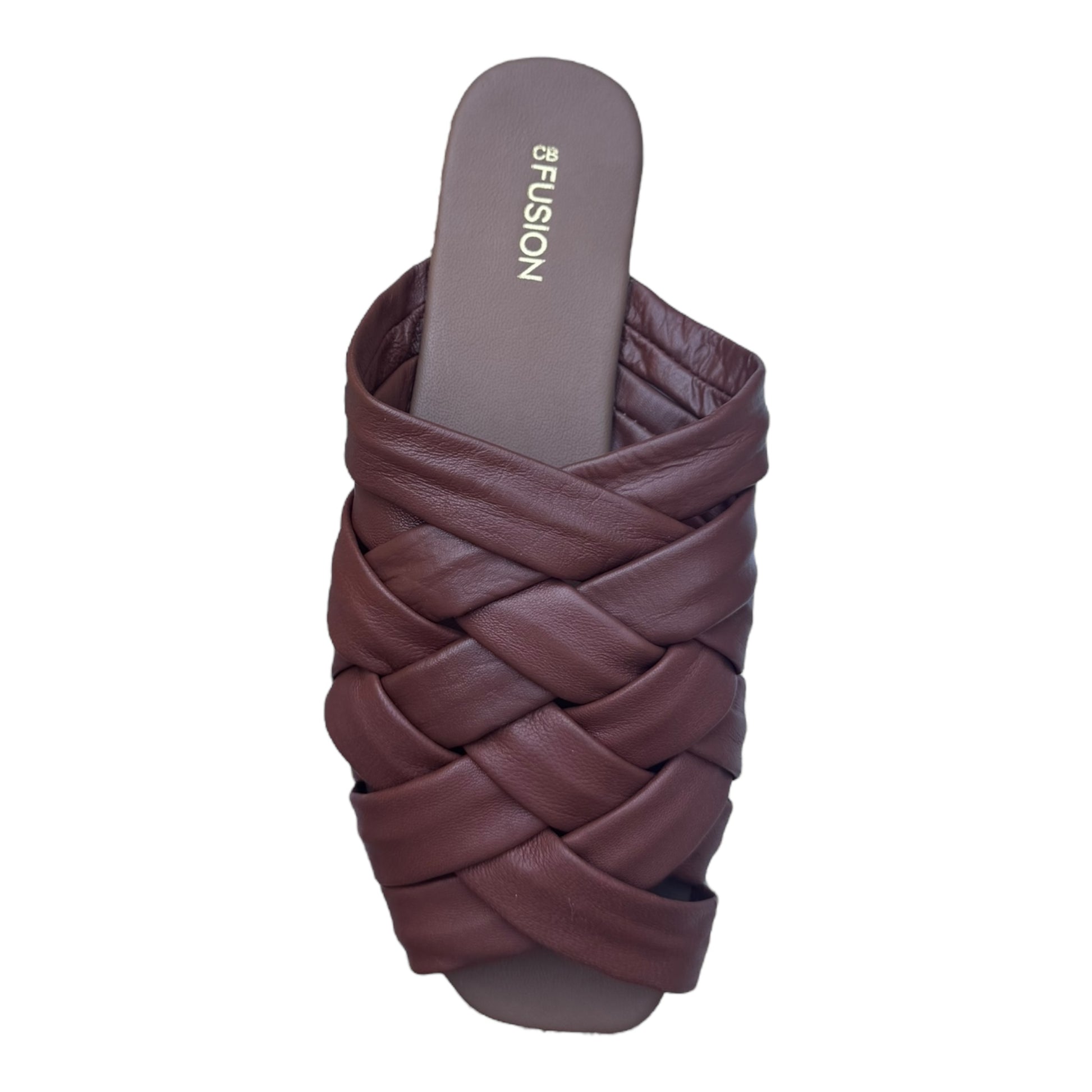 slipper marrone tre fasce di pelle intrecciata e suola ultra flat di cuoio.