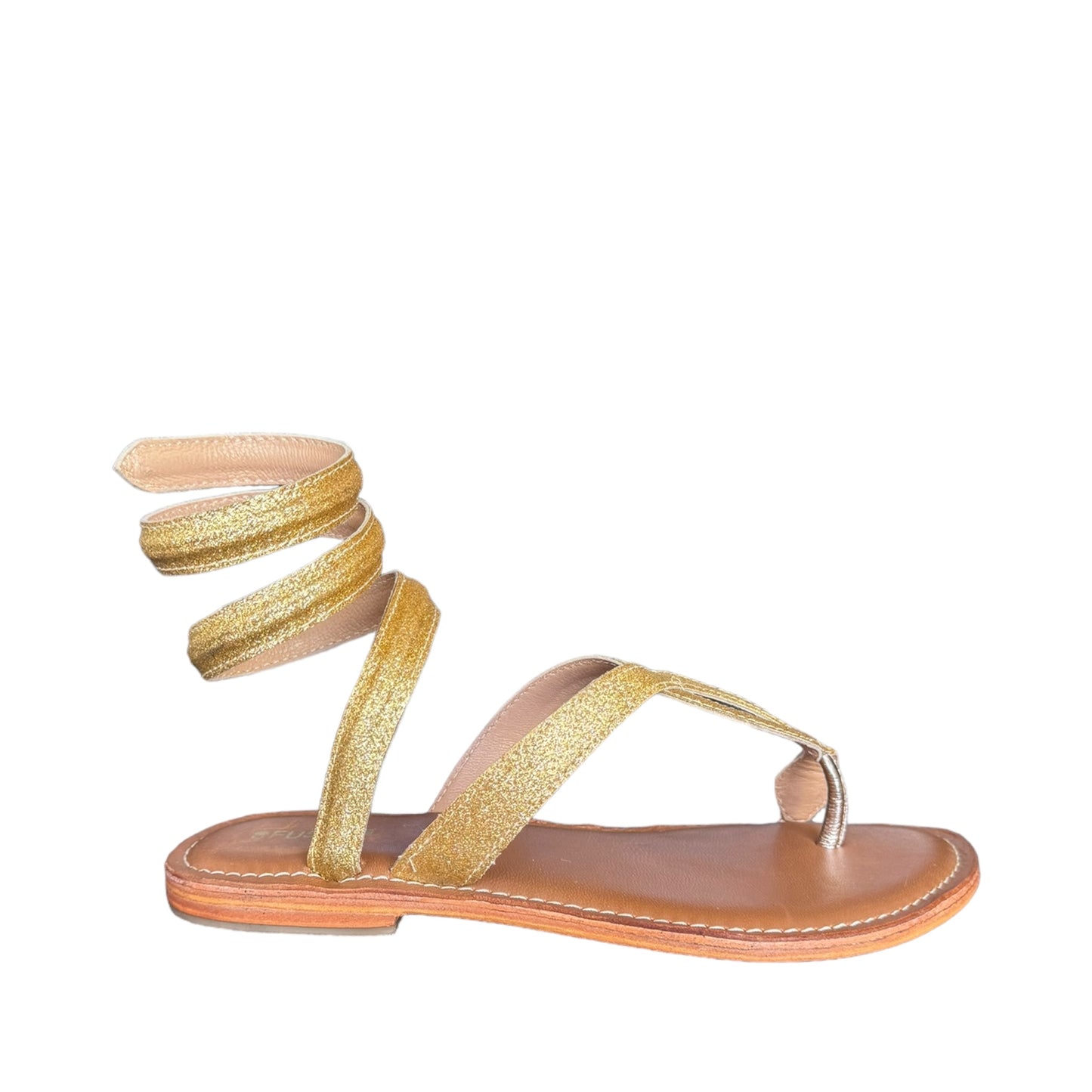 Sandales basses dorées à brides rigides enveloppant la cheville et semelle en cuir véritable