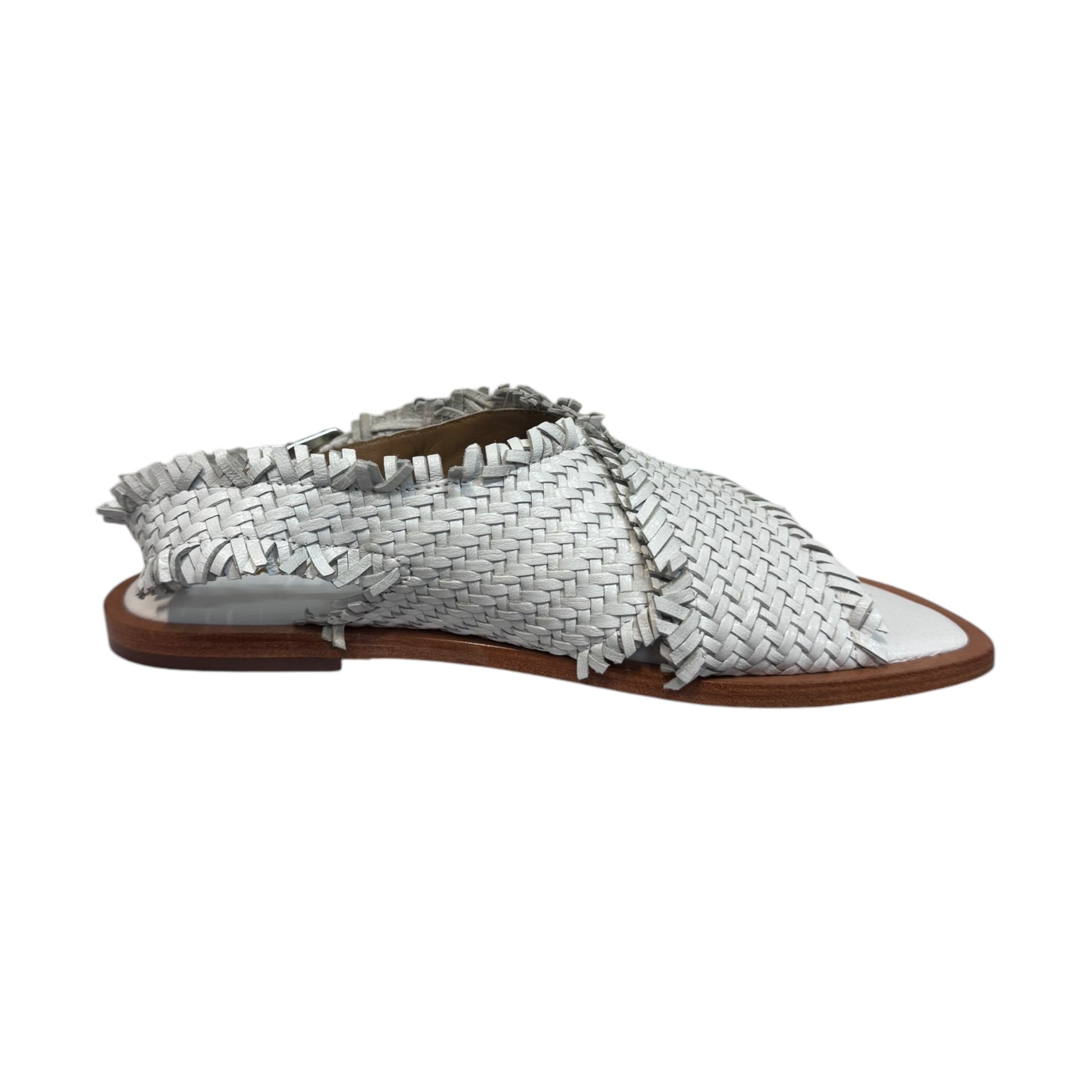 Sandali bianchi con tomaia con doppia fascia in pelle intrecciata e cinturino regolabile sul tallone e la suola ultra flat di cuoio.