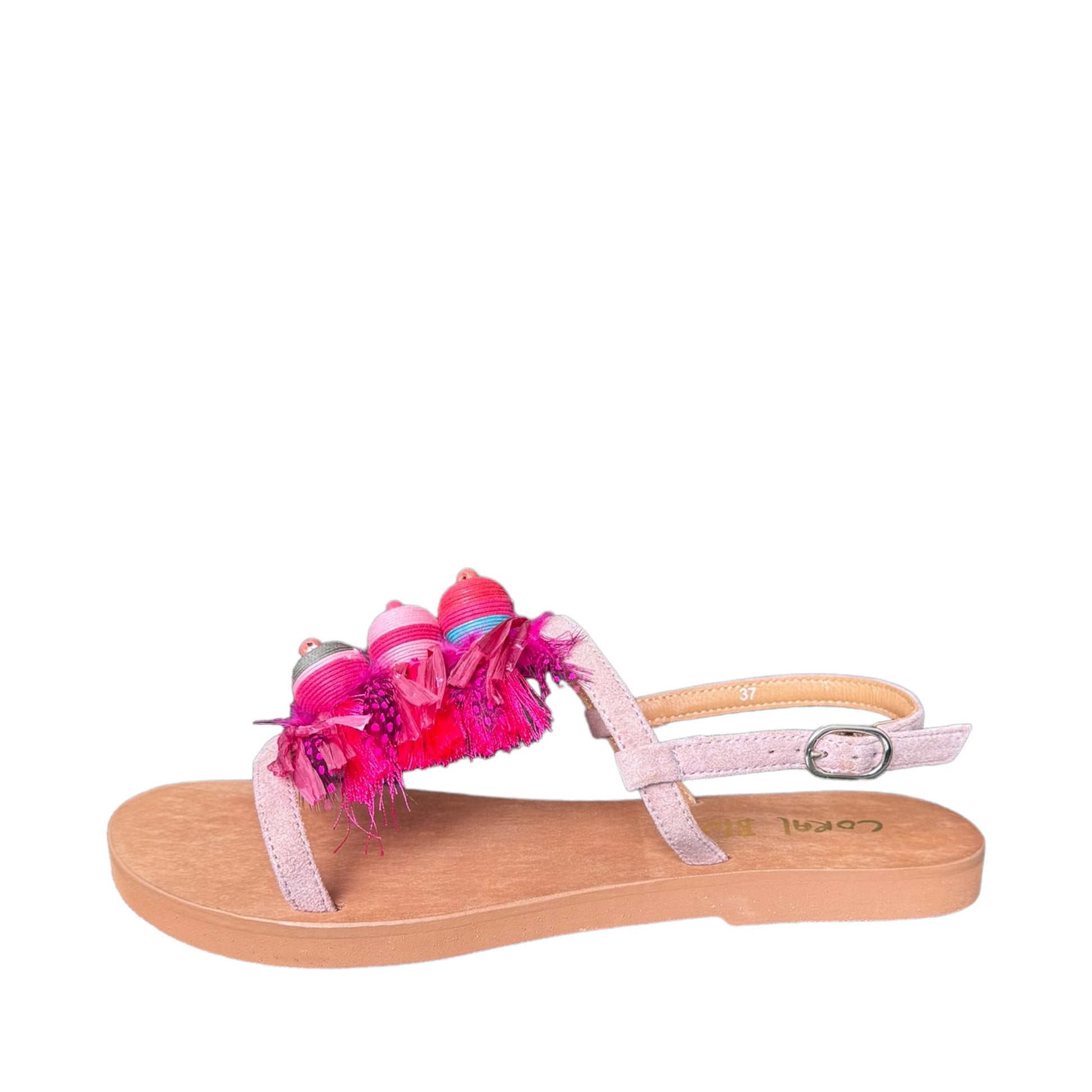 Gli abbellimenti includono nappine fucsia con cinturino in tessuto