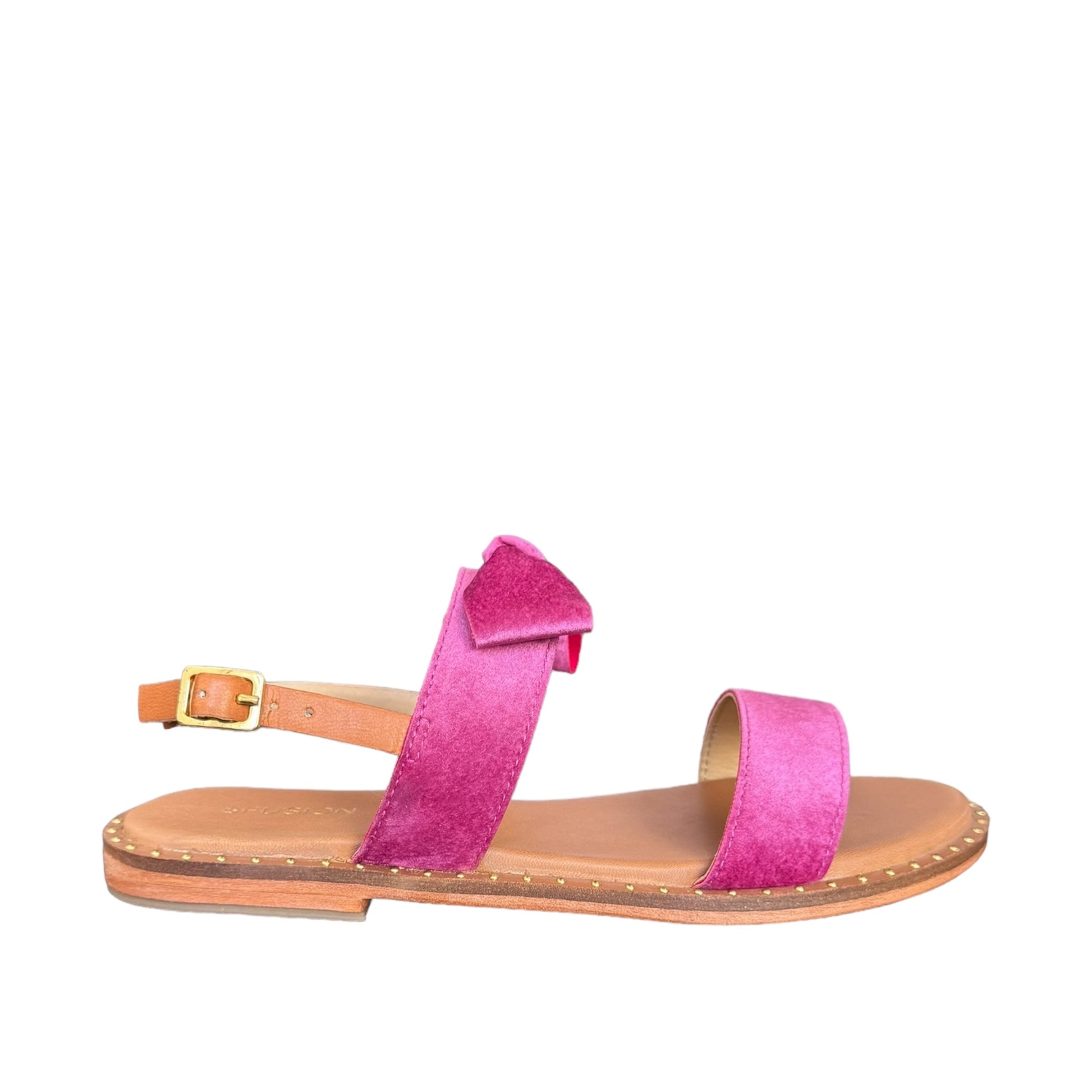 Sandalo Basso con suola nera in vero cuoio e fasce in tessuto fucsia Con fiocco sul davanti