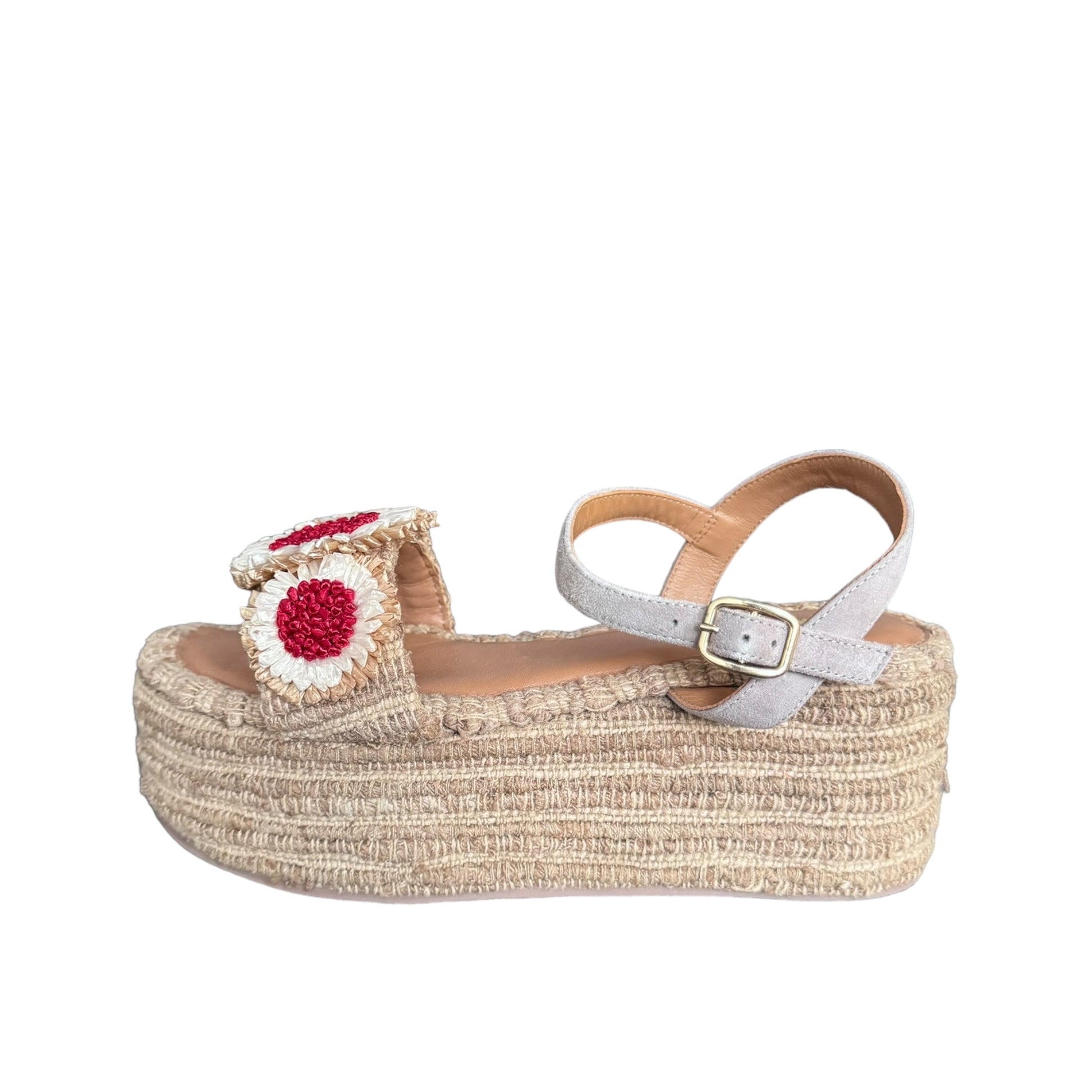 sandalo zeppa in rafia con Girasoli bianchi e rossi sulla fascia frontale