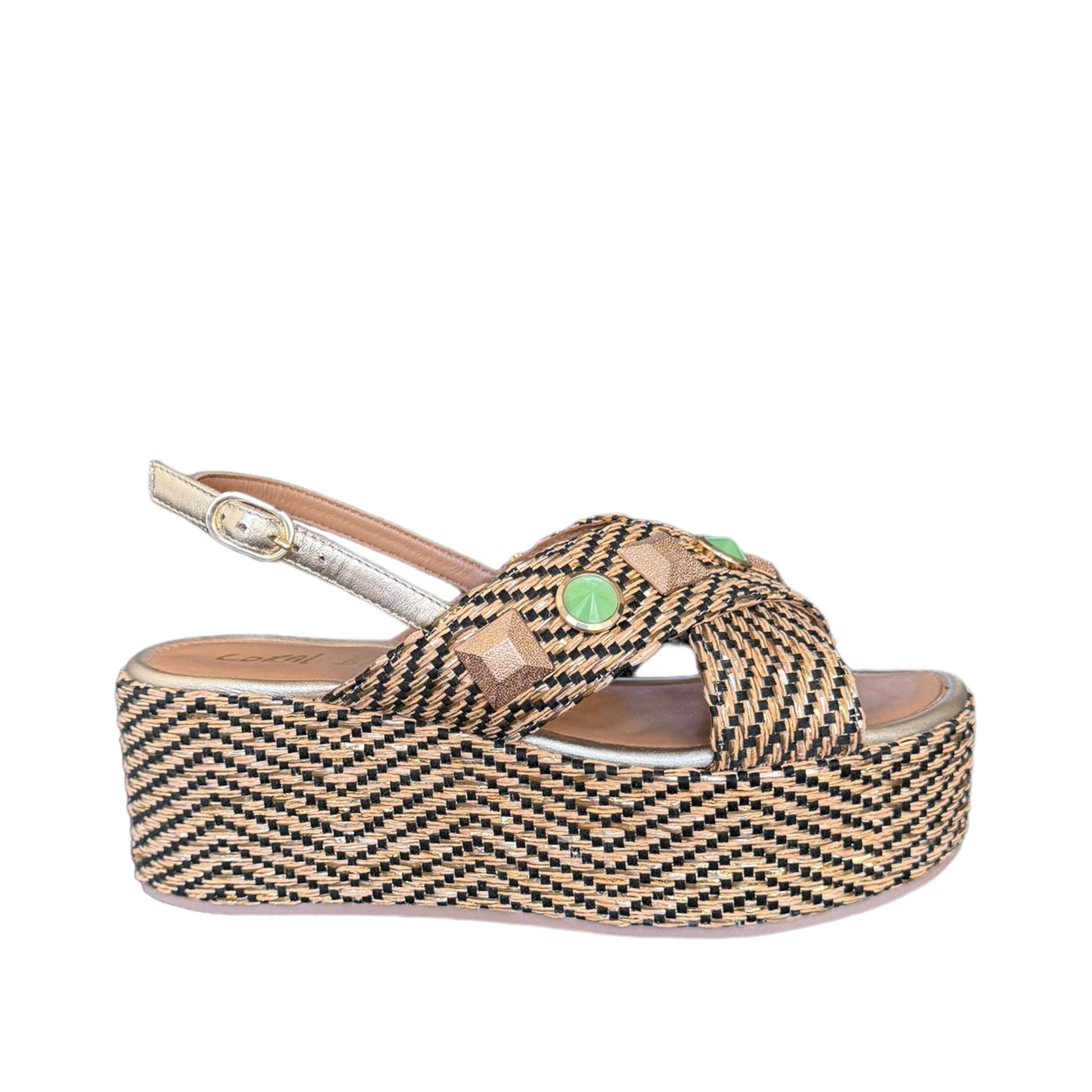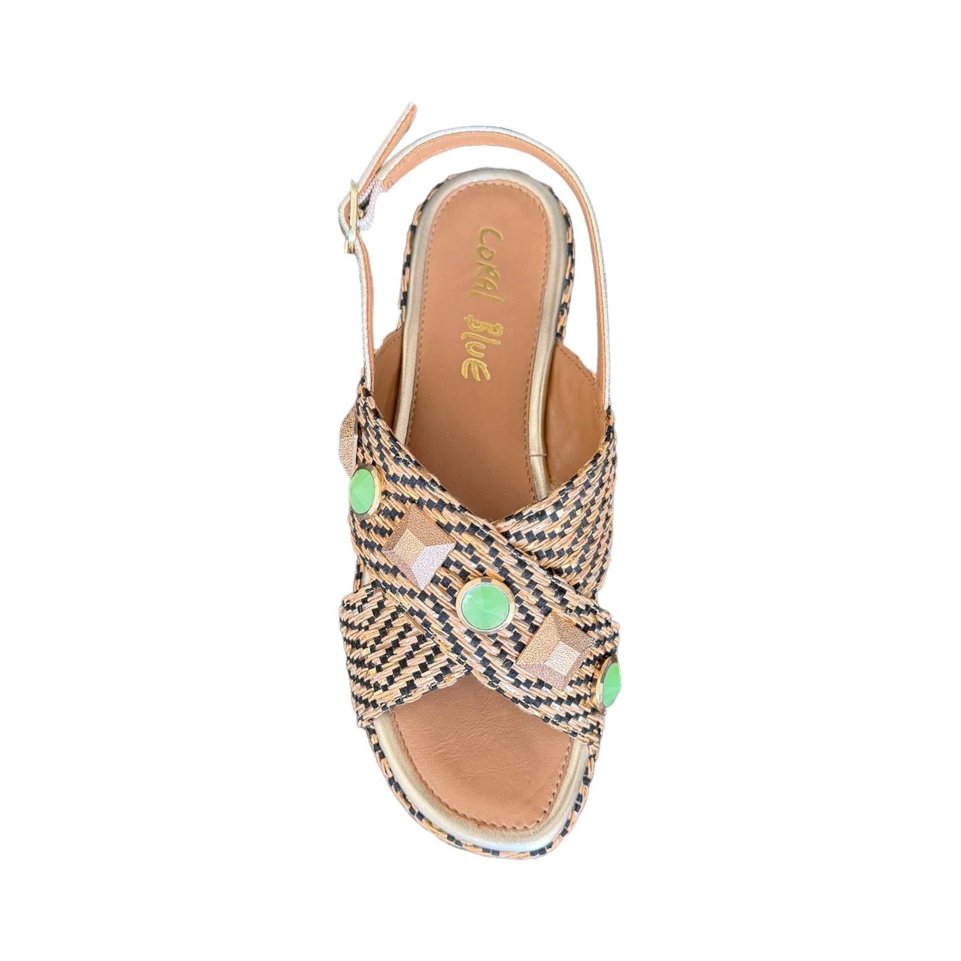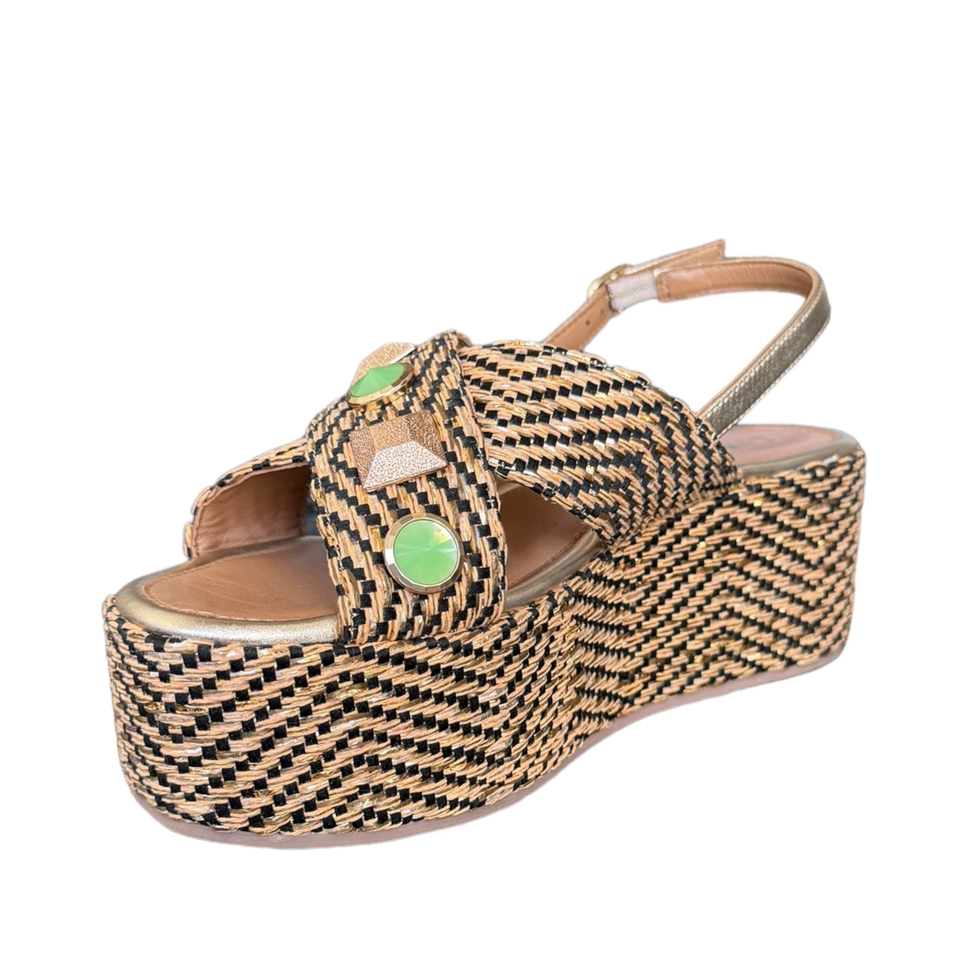 sandalo zeppa in rafia Oro e nera con fasce intrecciate e gioielli sul davanti