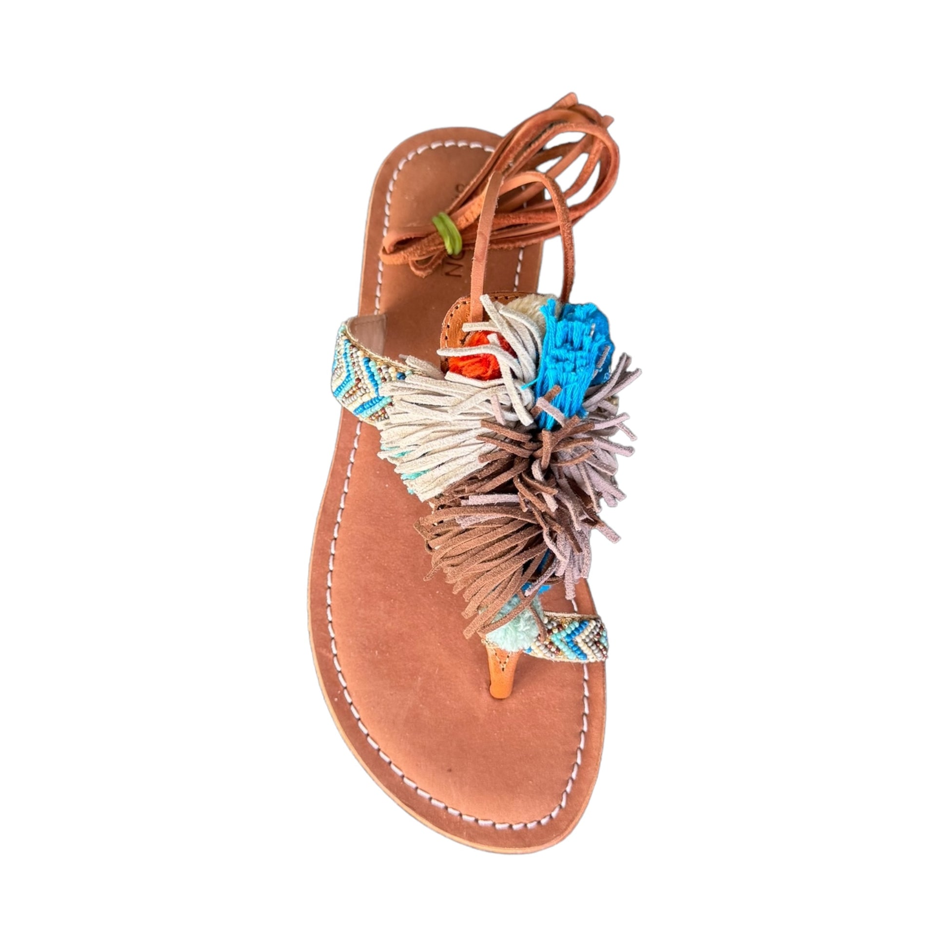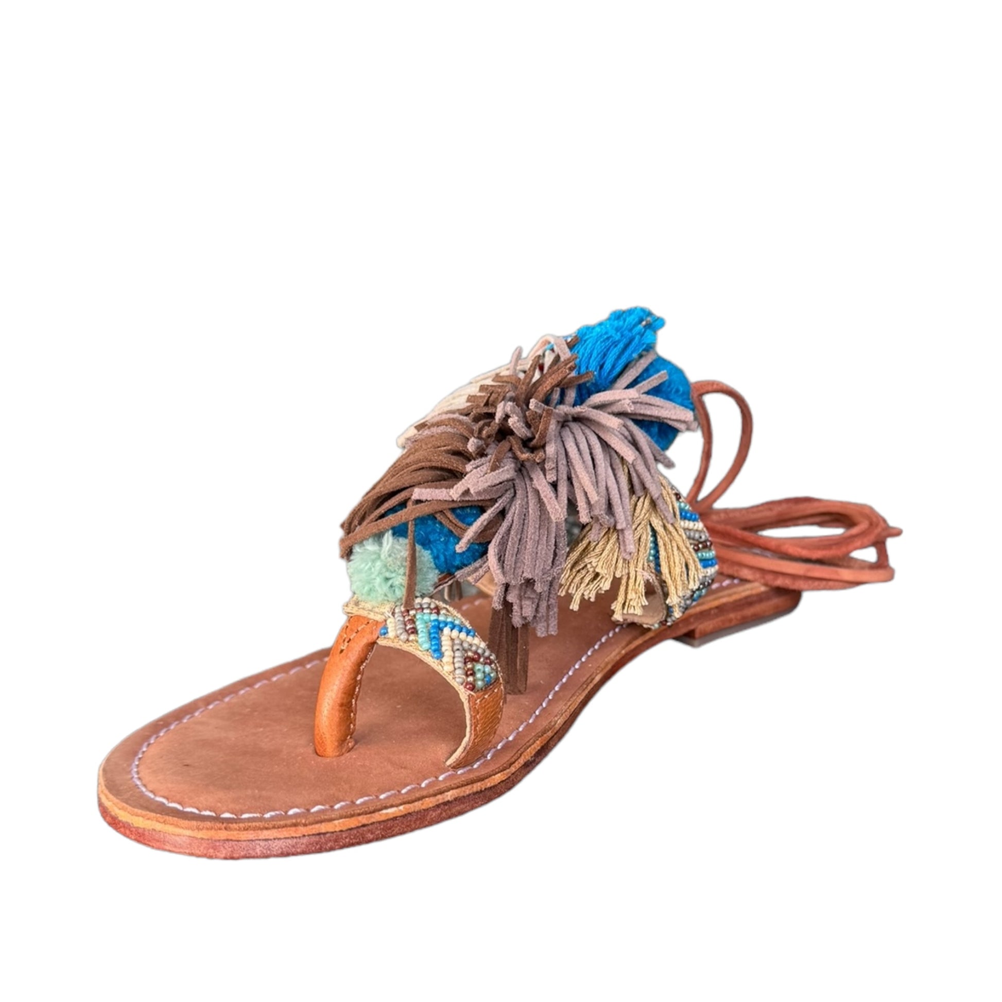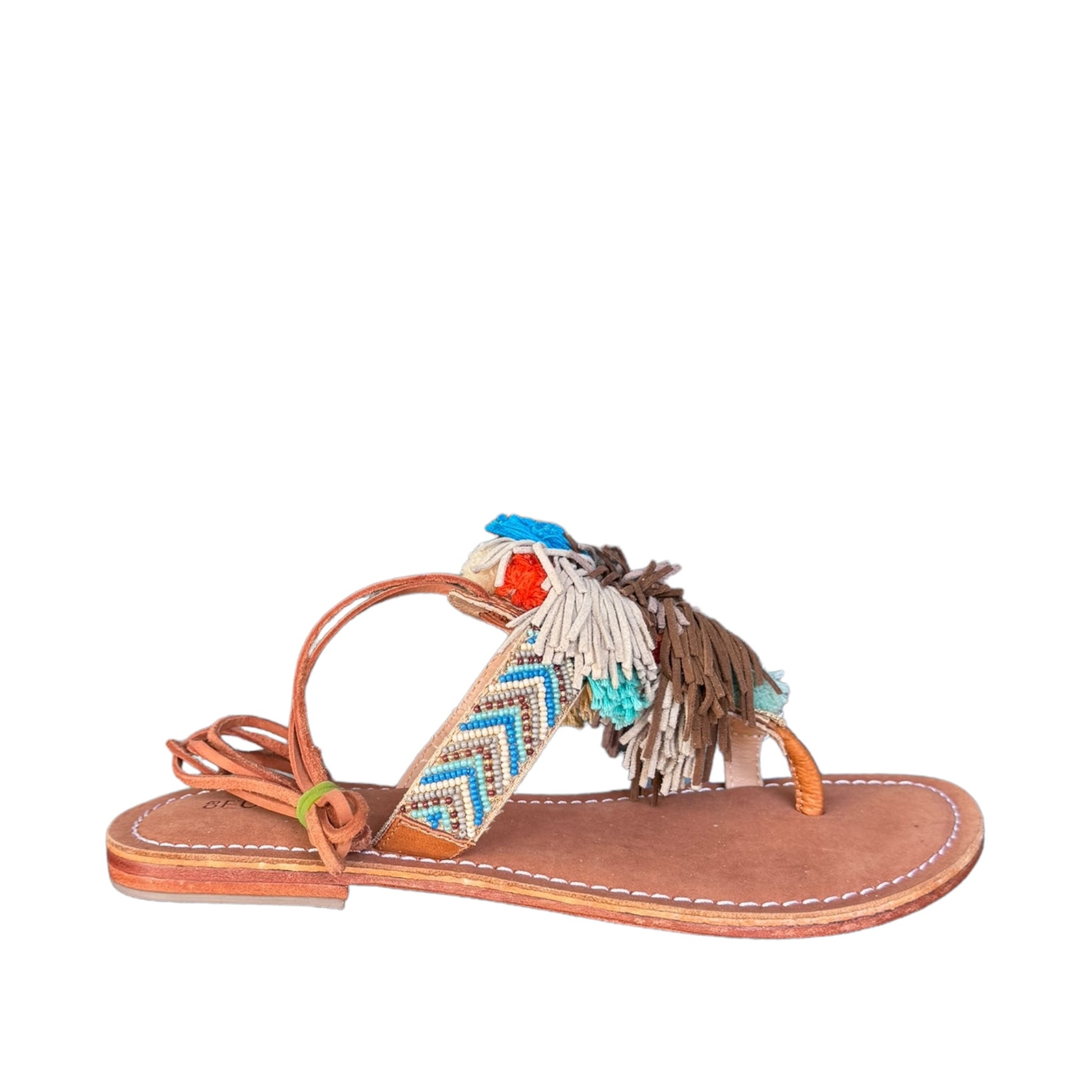 sandalo infradito in cuoio presenta un design allacciato, con cinturini che possono essere allacciati attorno alla caviglia o al polpaccio. Ha un mix di perline e nappine sul davanti