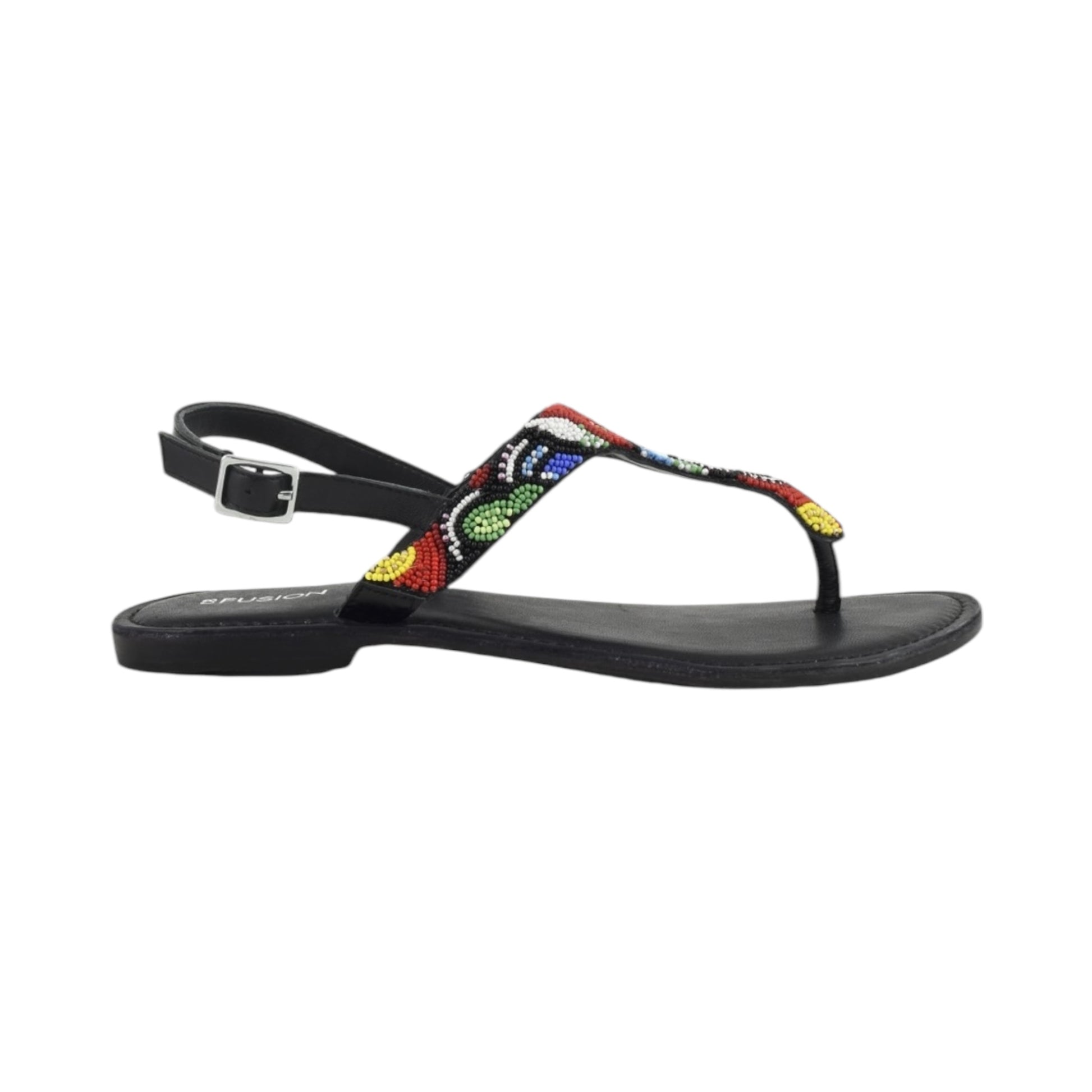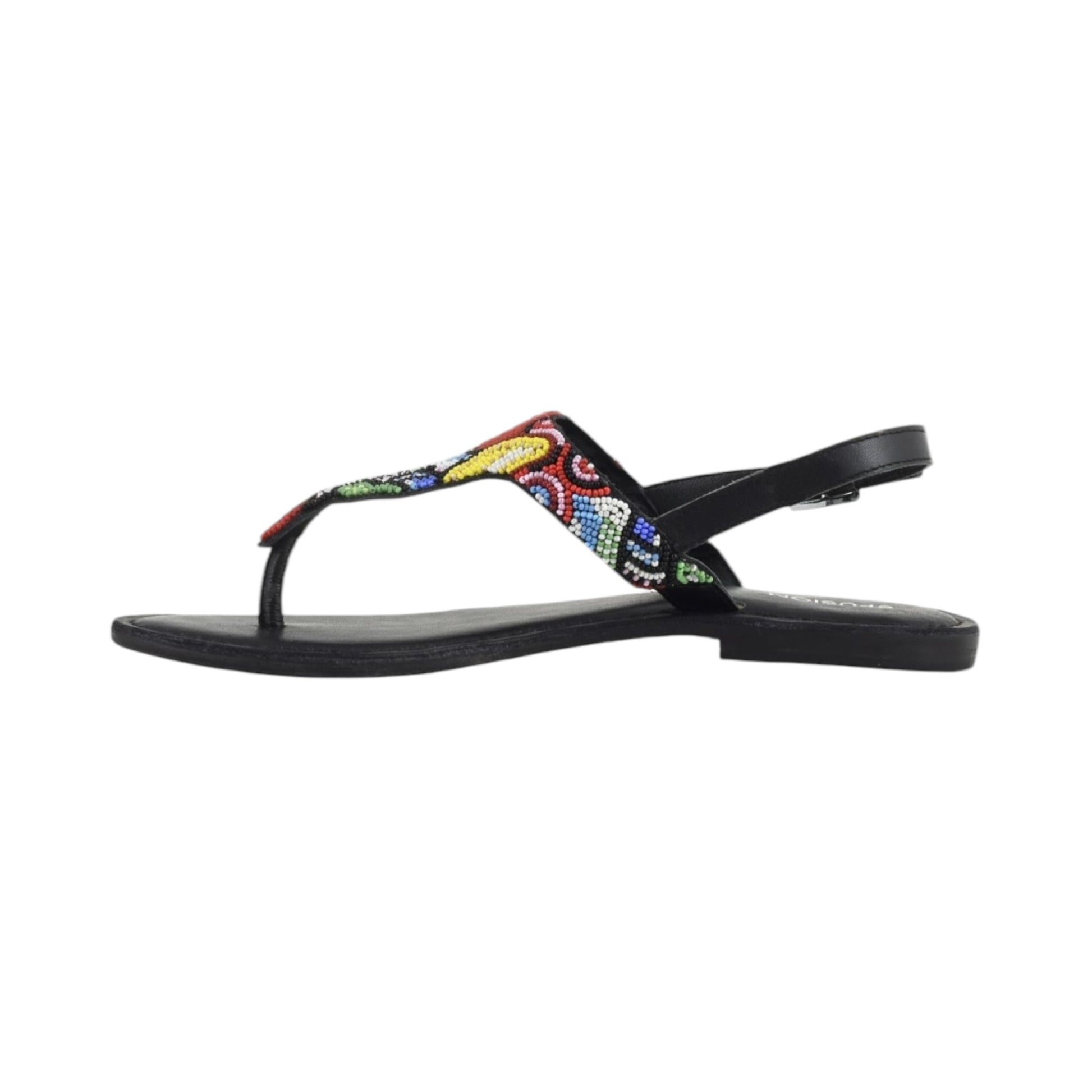 sandali infradito tomaia di tessuto ricamata, un pratico cinturino regolabile e un confortevole soletto di pelle.