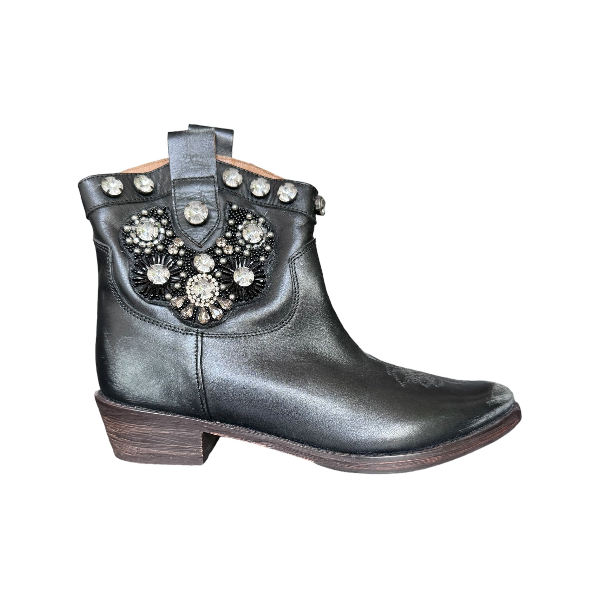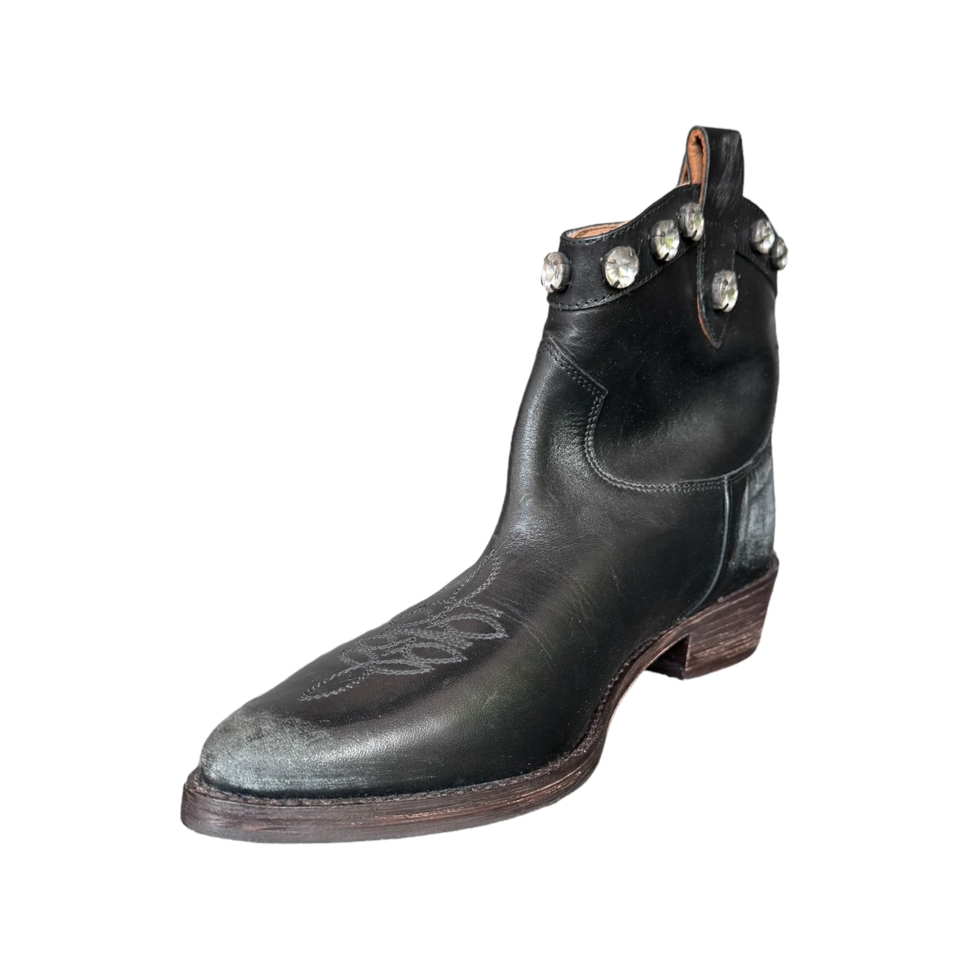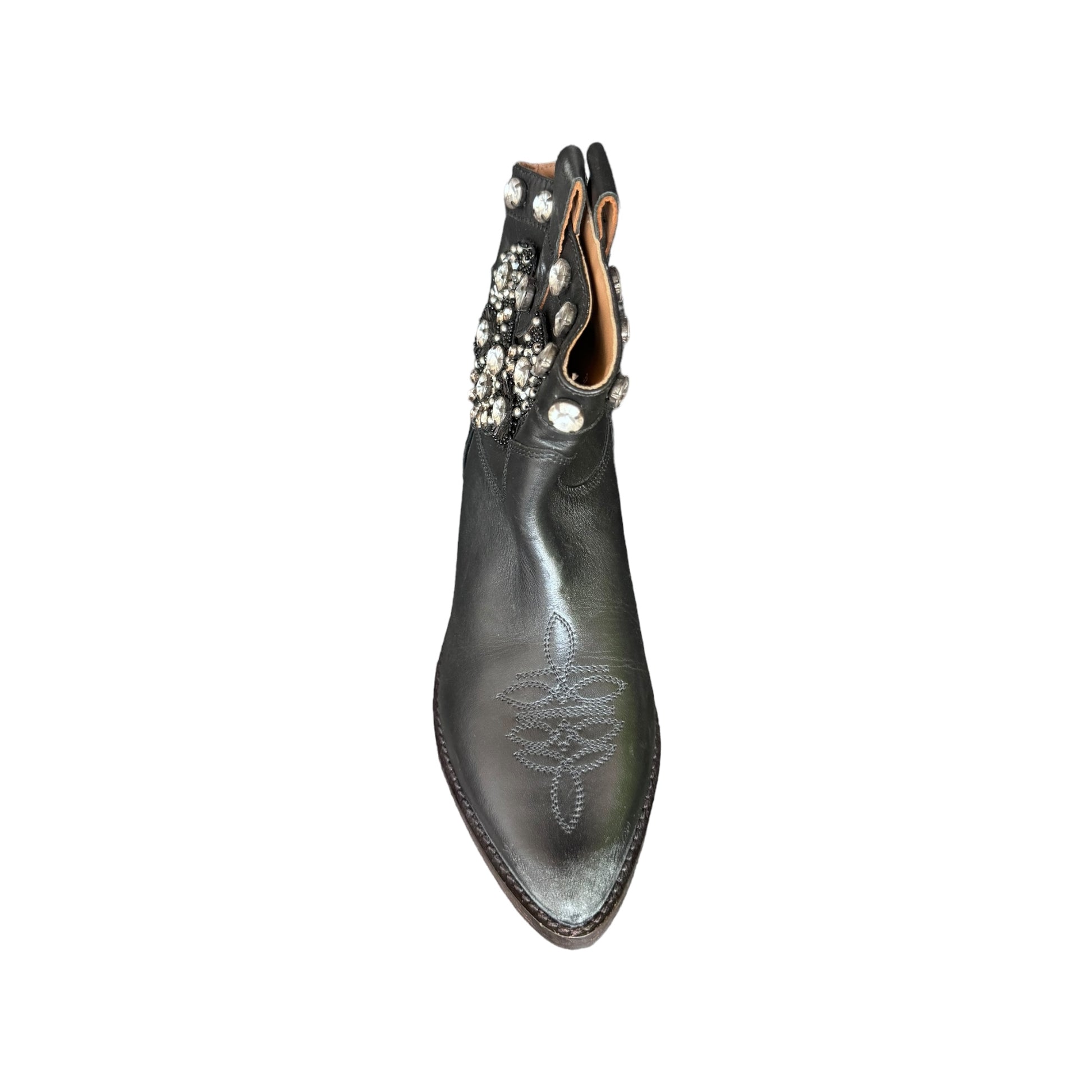Texano nero effetto consumato con decorazione gioiello sul lato esterno del piede e maxi strass sul lato interno.
