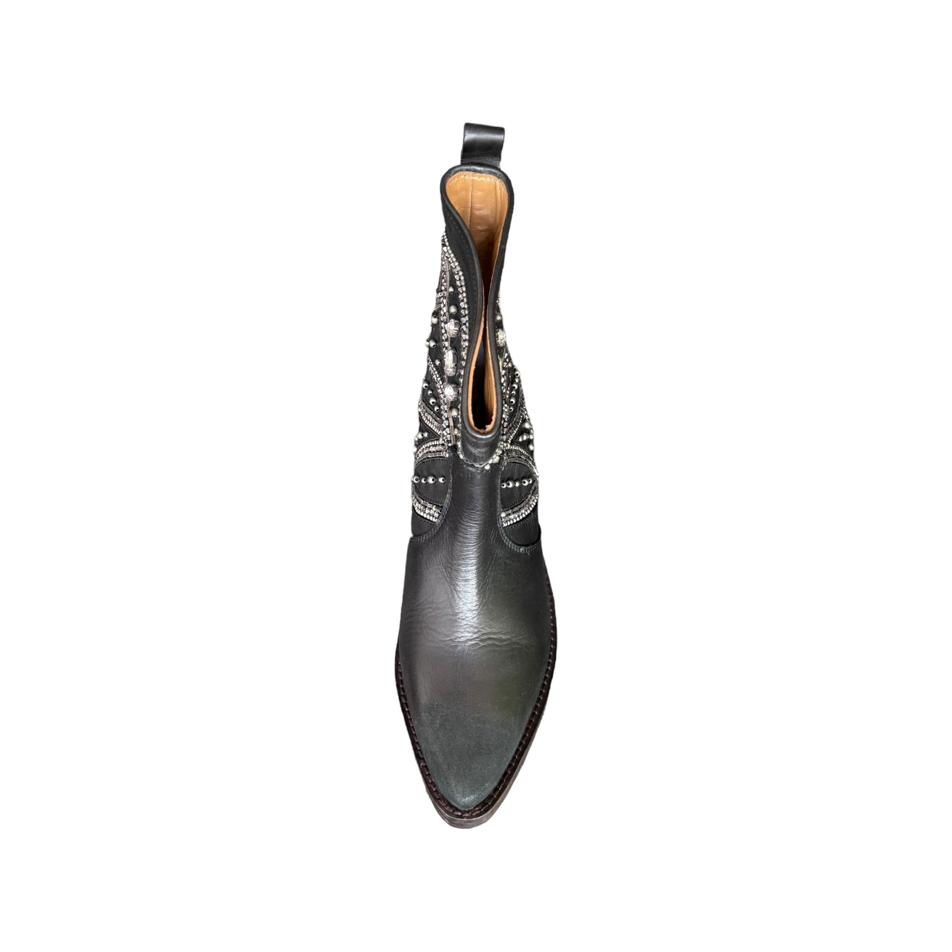 stivaletto texano in vera pelle con ricami asimmetrici e gioielli sulla parte laterale