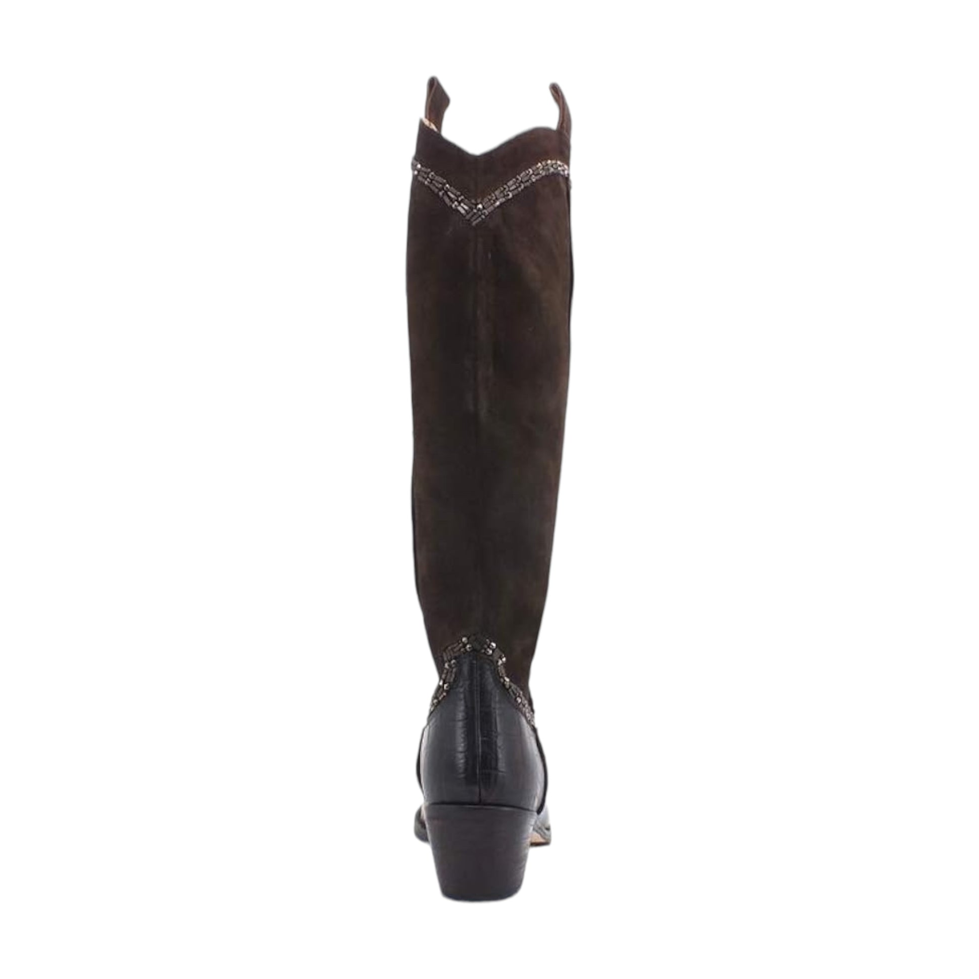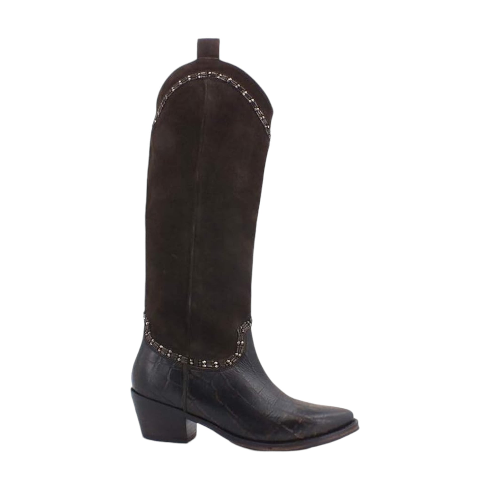 Vi presentiamo il vincente mix tra vera pelle scamosciata e stampa coccodrillo nato dalle menti creative dei nostri designer. Uno stivale con un chiaro richiamo Western che non vi farà certo passare inosservate. I dettagli cuciti a mano aggiungono un toco glamour che fa di questo stivale la scelta ottimale se siete alla ricerca di uno stivale sexy e incredibilmente versatile. Irresistibili con minigonne, vestiti midi o jeans, e quale occasione migliore per indossare la tua giacca con le nappe?