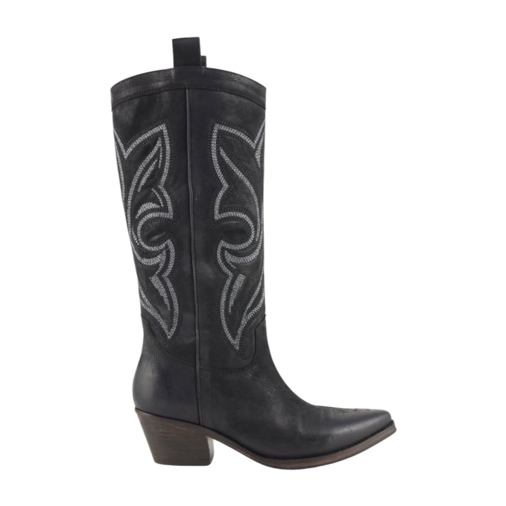 Texano alto nero mix tra vera pelle e camoscio, dettagli cuciti a mano.