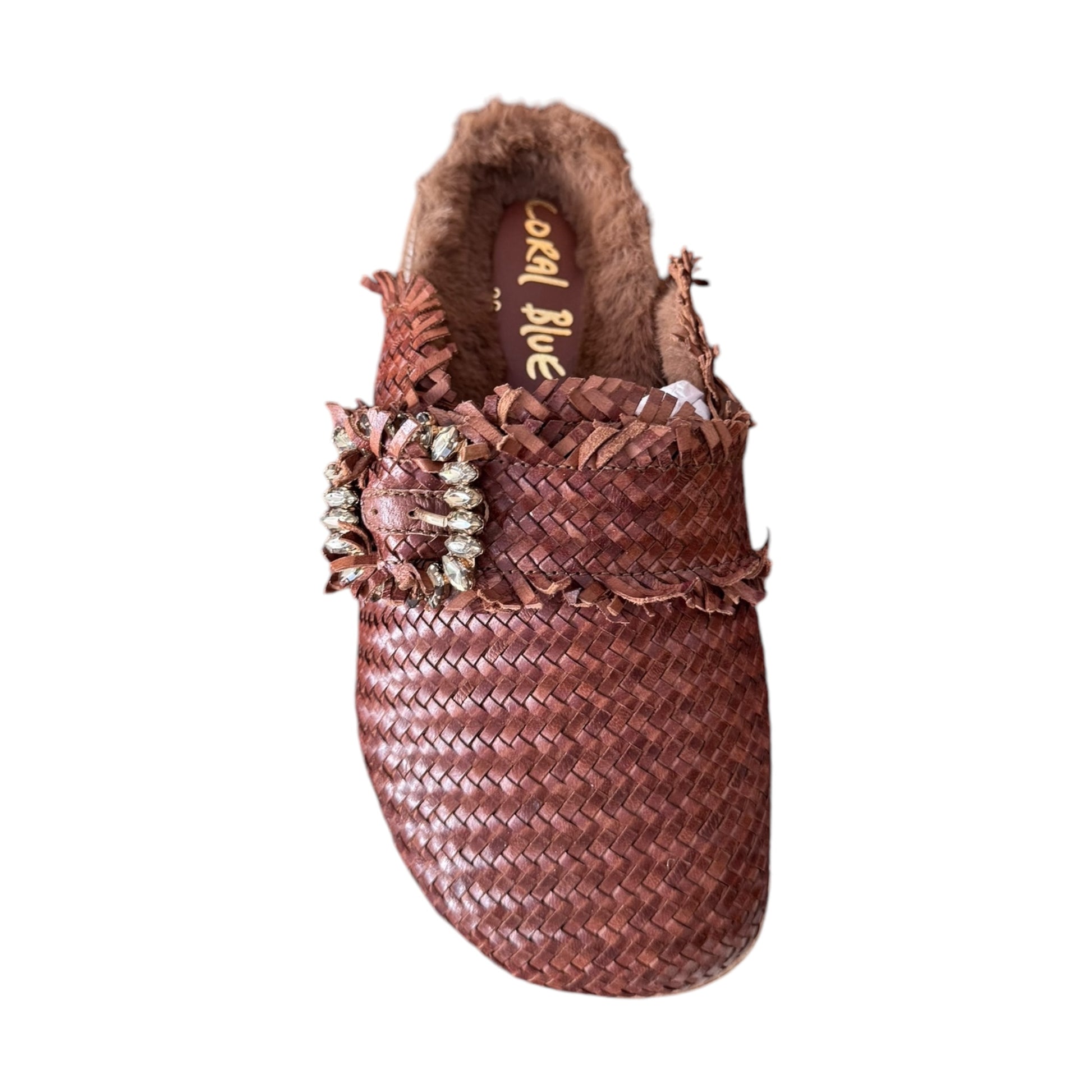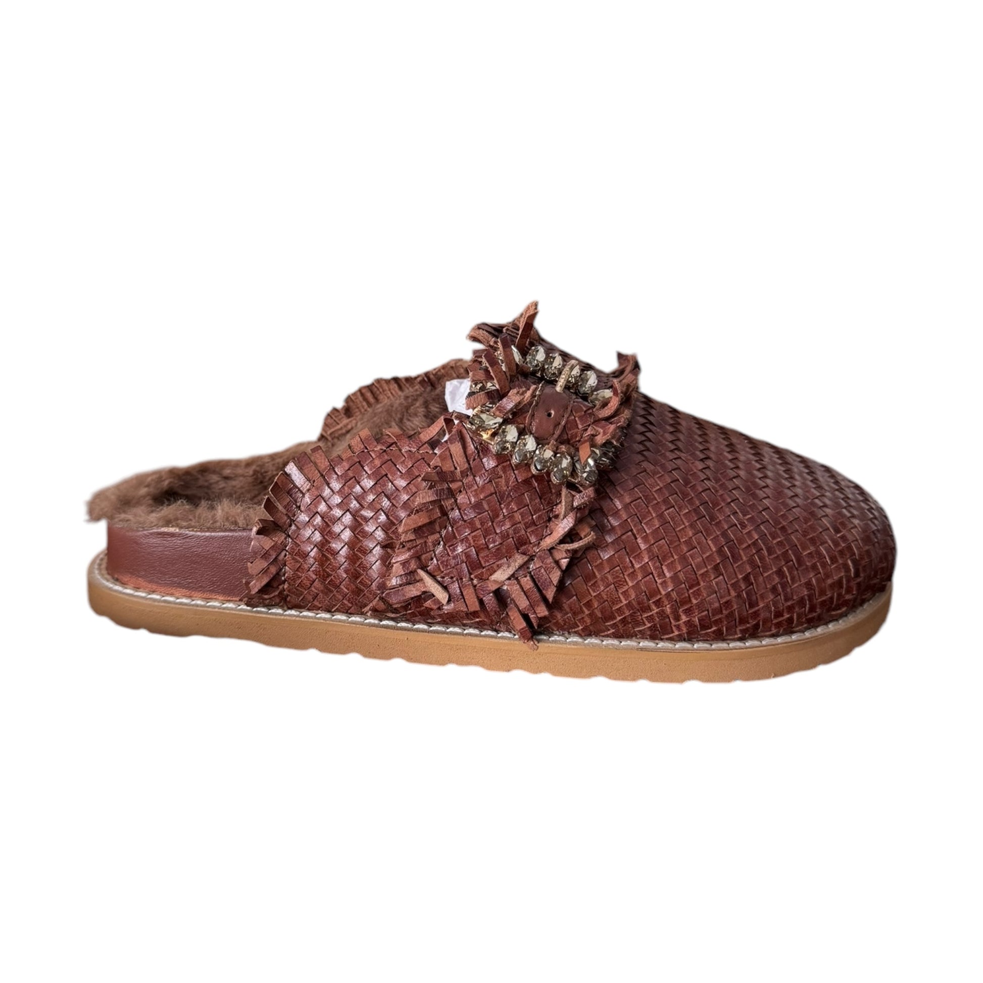 Ciabatta marrone chiusa con pelliccia interna, soletto in pelle e fibbia gioiello
