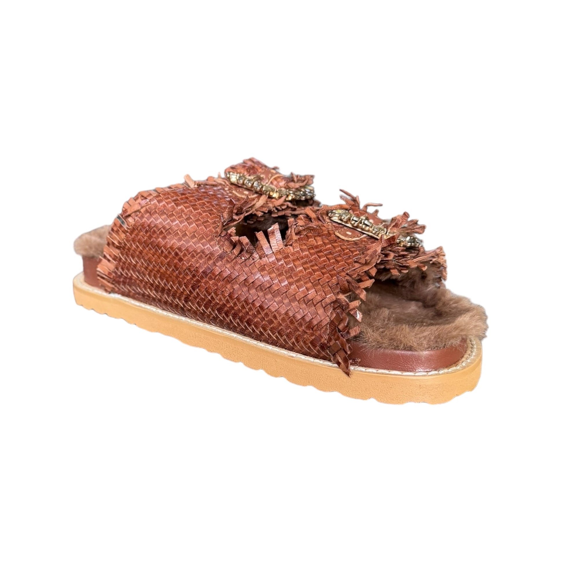 Ciabatta marrone con pelliccia interna, soletto in pelle e le fibbie gioiello con doppia fascia in pelle intrecciata