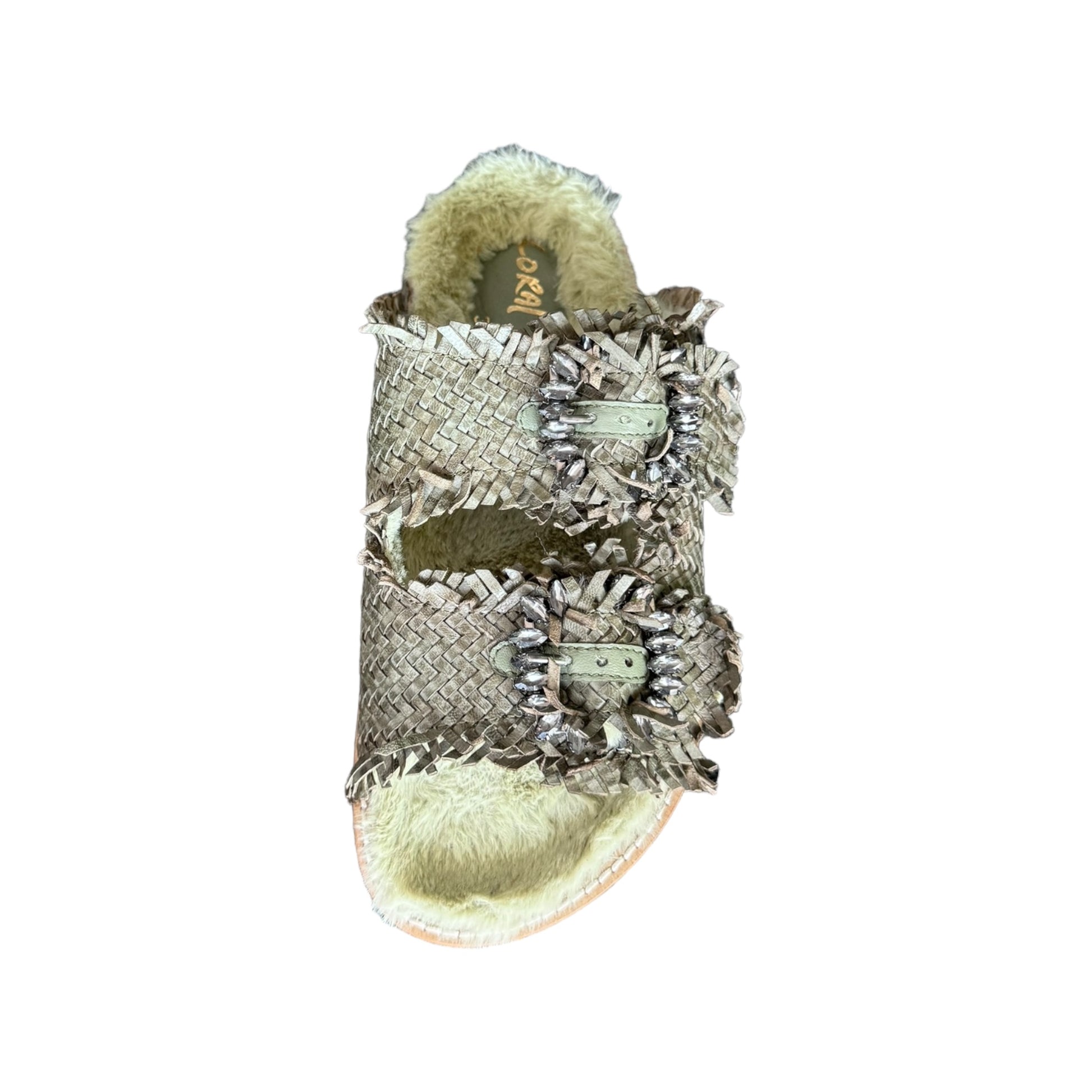 Ciabatta verde con pelliccia interna, soletto in pelle e le fibbie gioiello con doppia fascia in pelle intrecciata