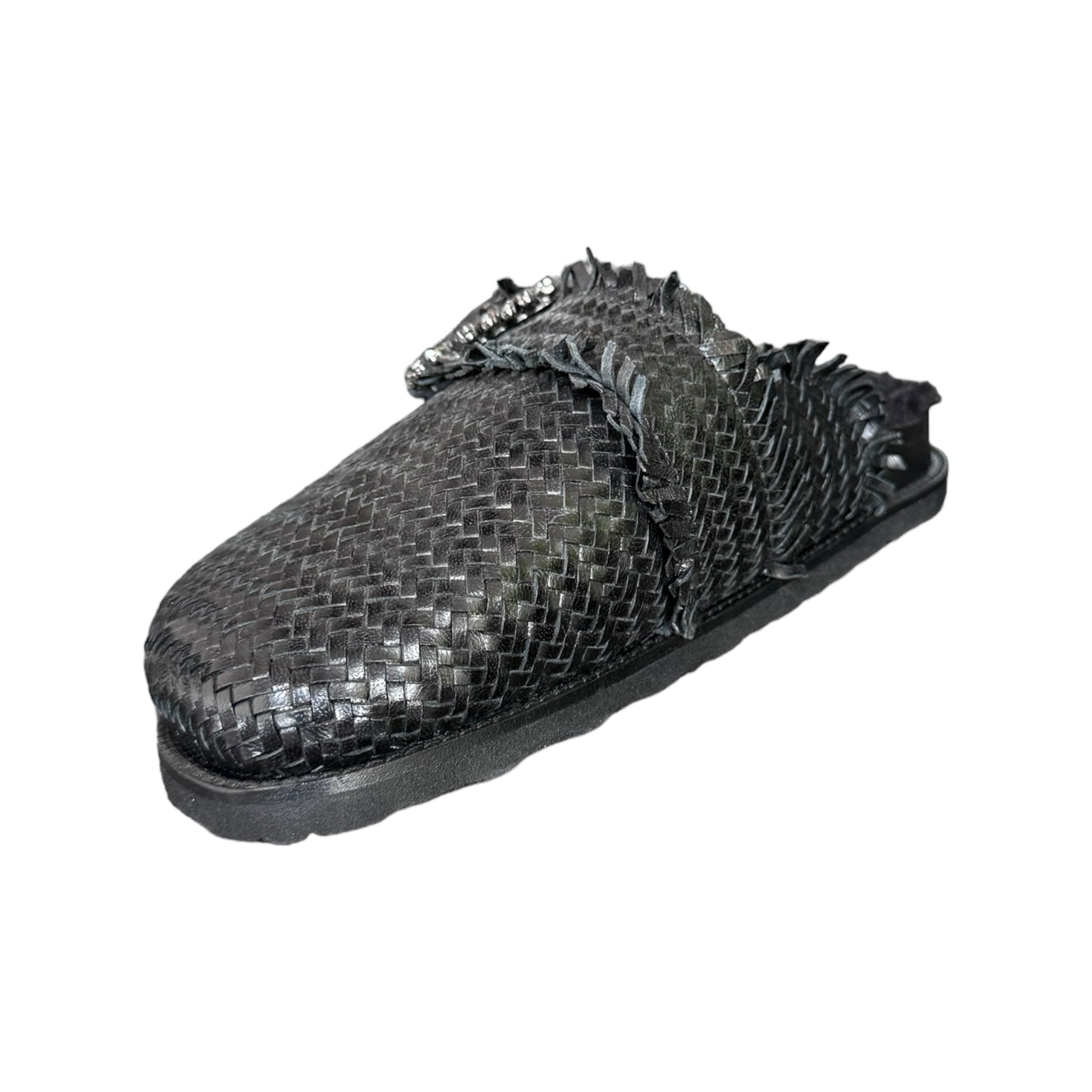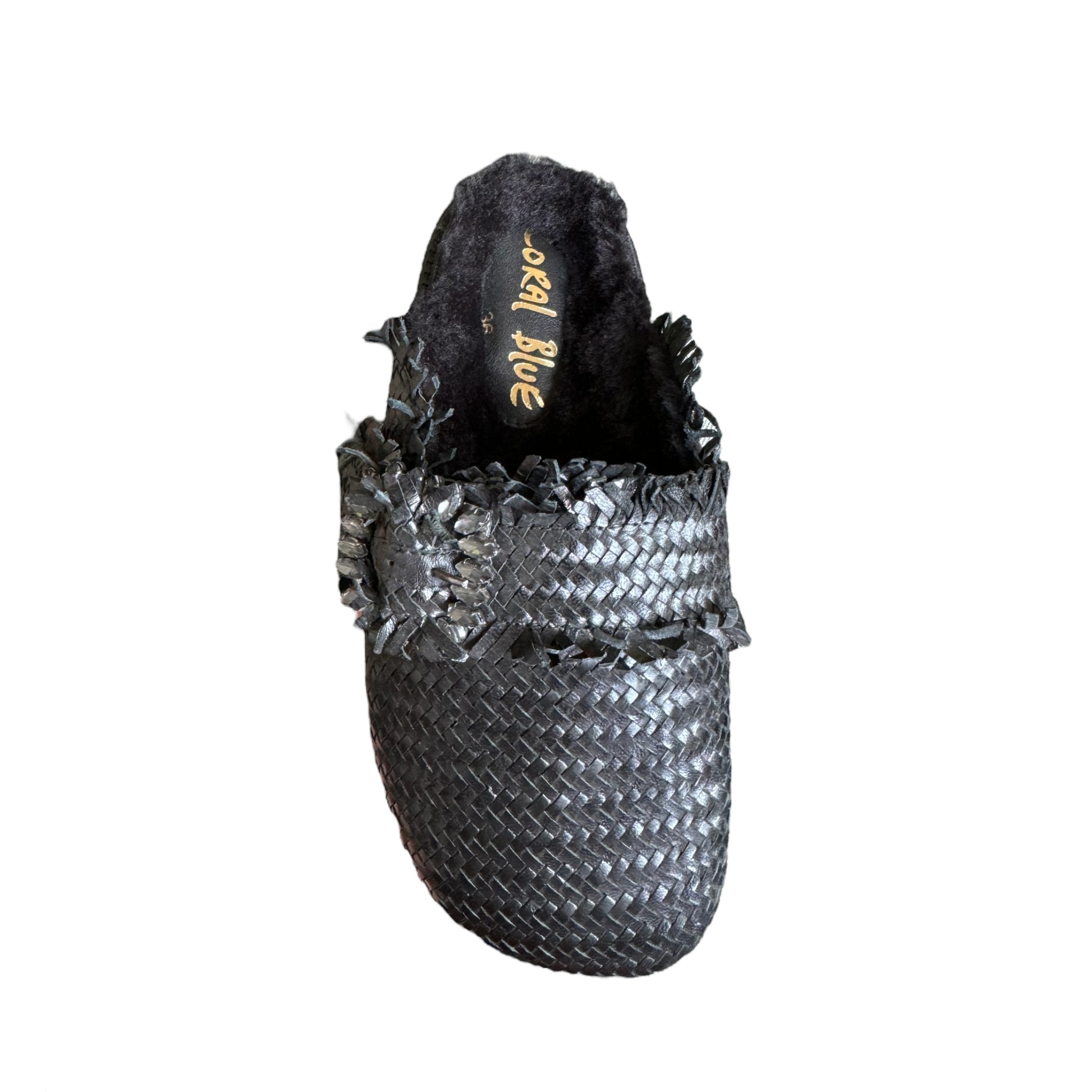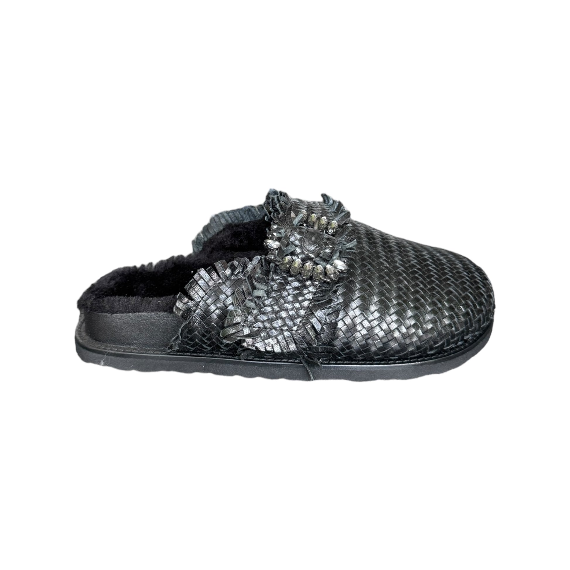 Ciabatta nera chiusa con pelliccia interna, soletto in pelle e fibbia gioiello