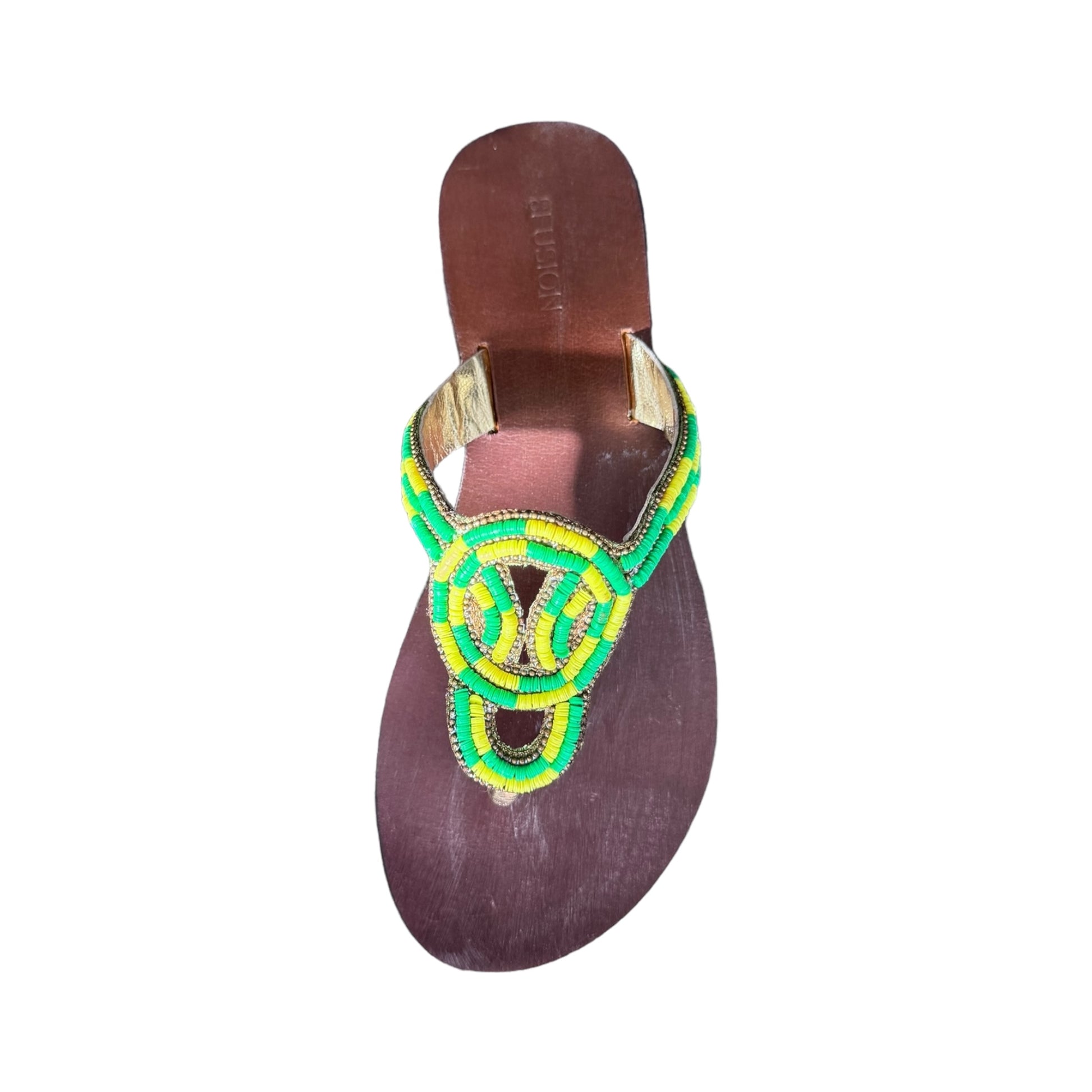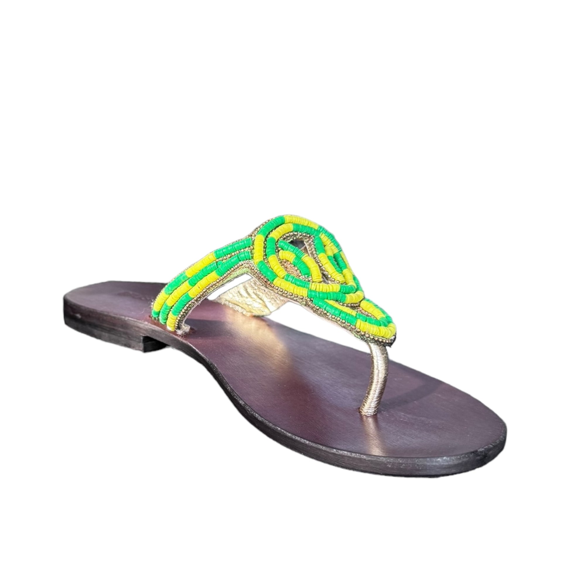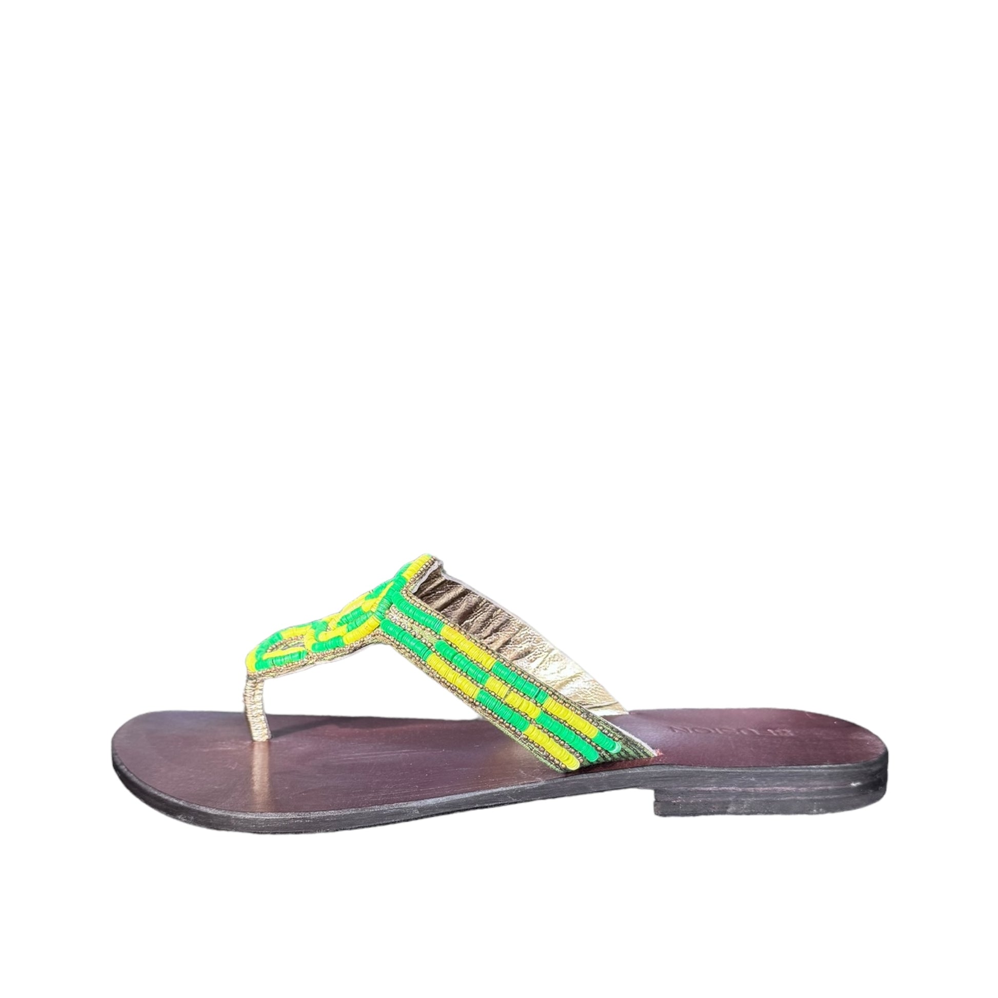 infradito con cinturino ricoperto di perline verdi e gialle e suola in vero cuoio