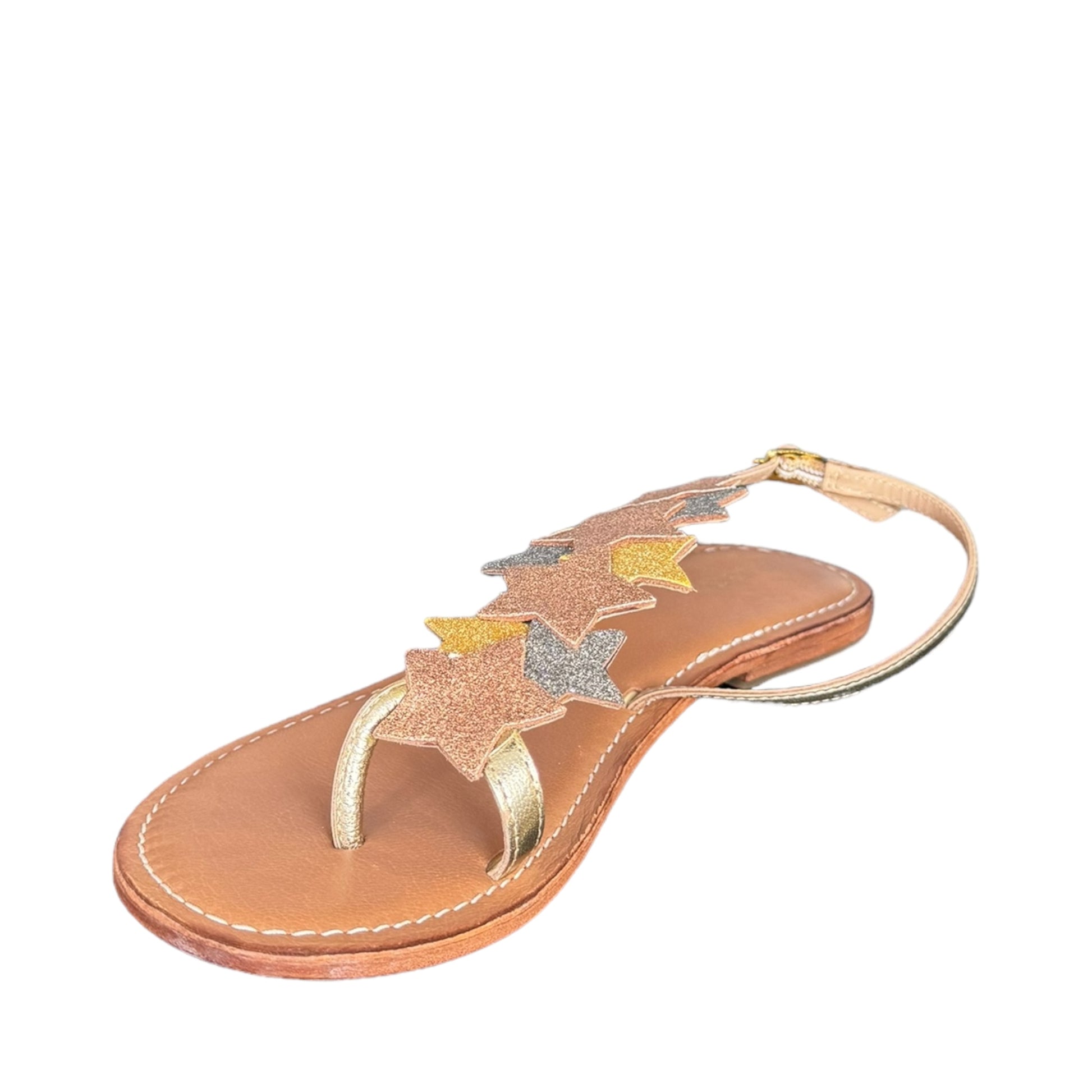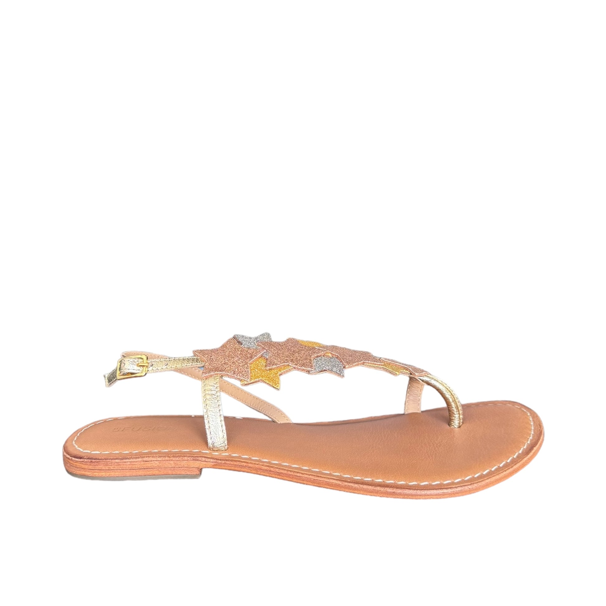 sandalo basso infradito con cinturini in oro e stelle multi color brillantinate sul davanti