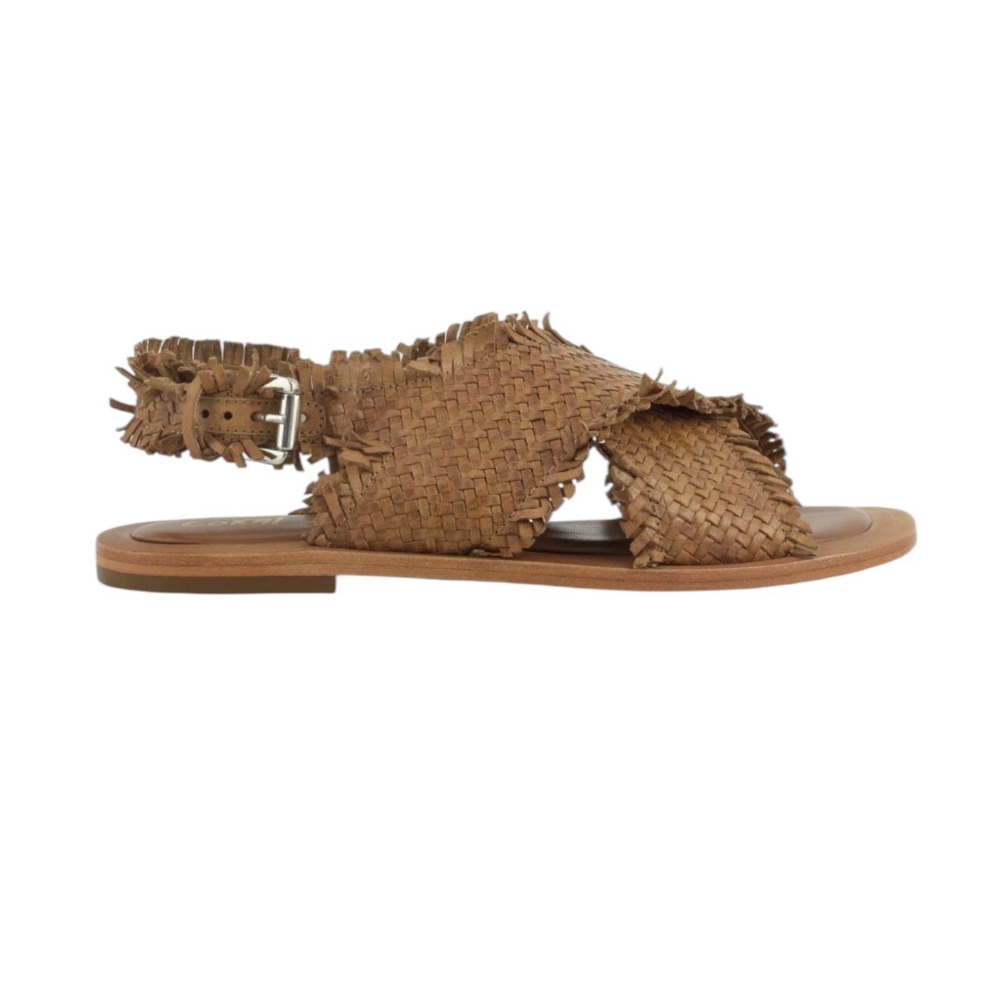 Sandali con tomaia con doppia fascia in pelle intrecciata e cinturino regolabile sul tallone e la suola ultra flat di cuoio.