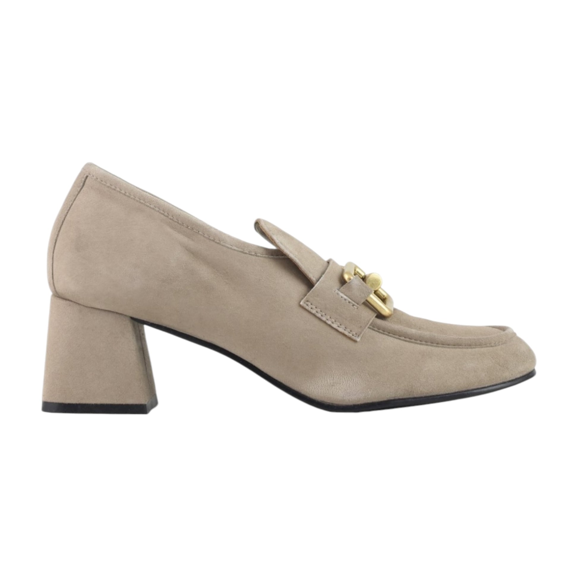 mocassino in camoscio si presenta con punta e tacco squadrati, linee eleganti e un raffinato morsetto in metallo dorato.