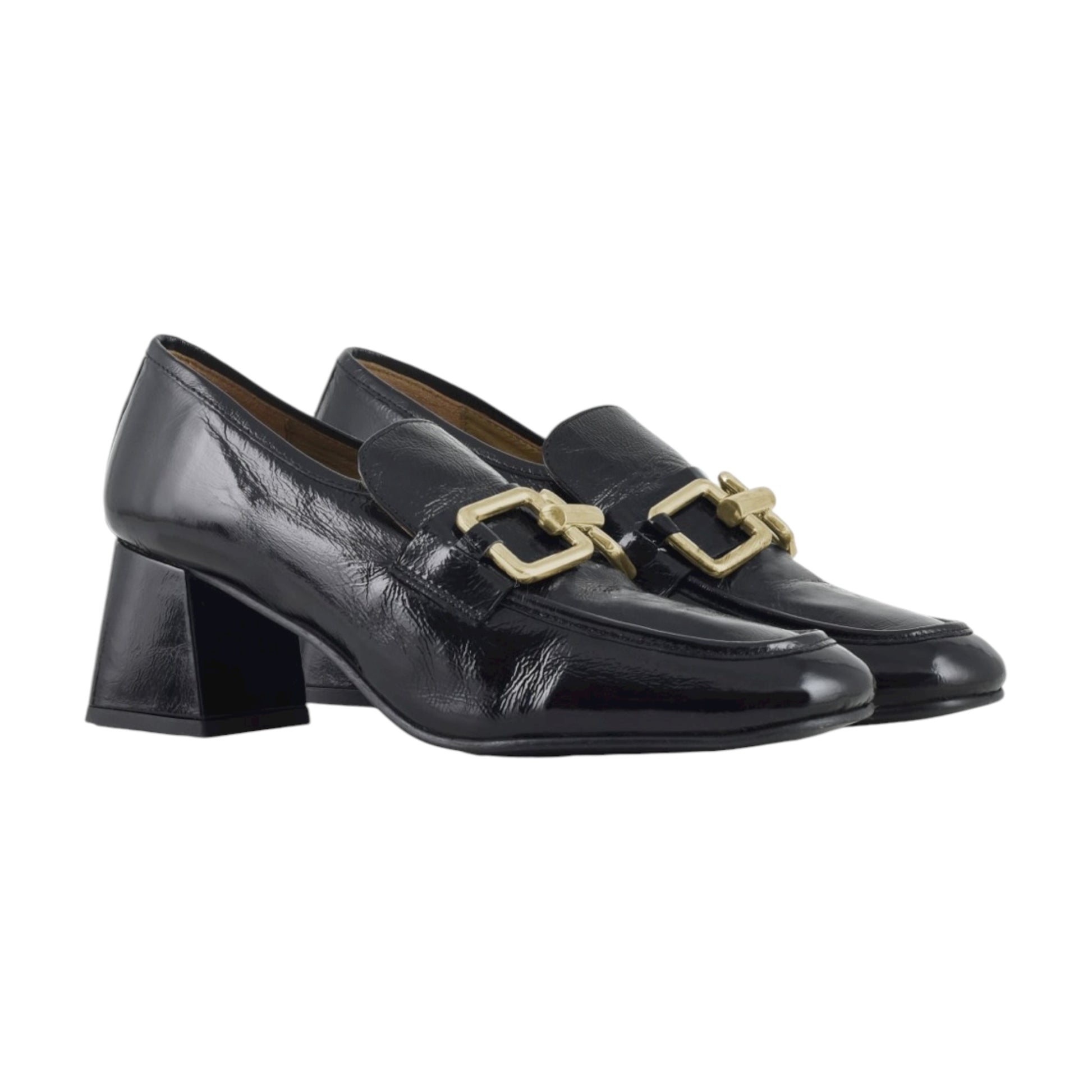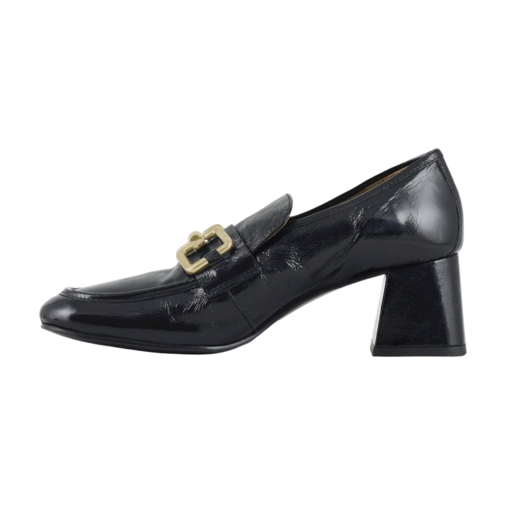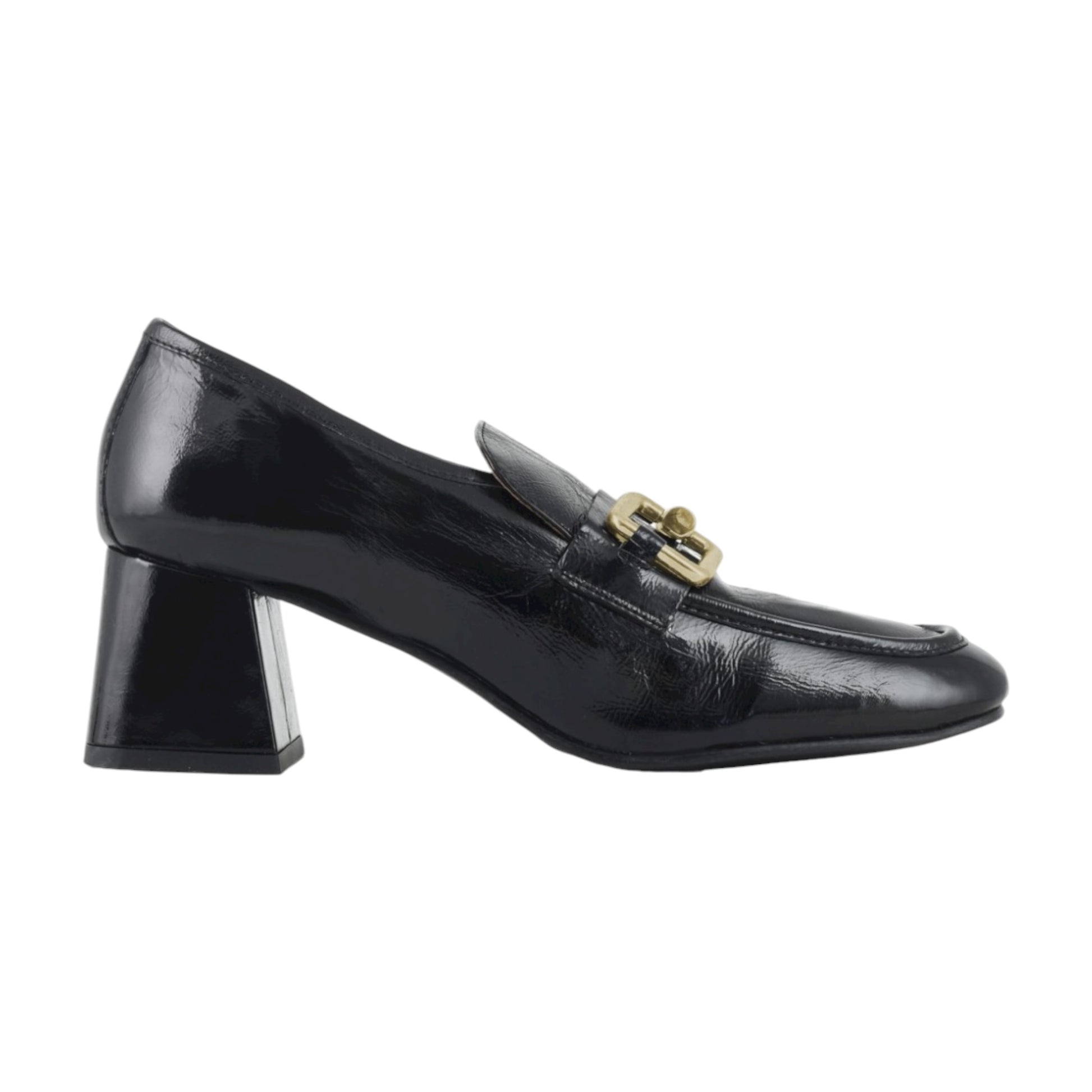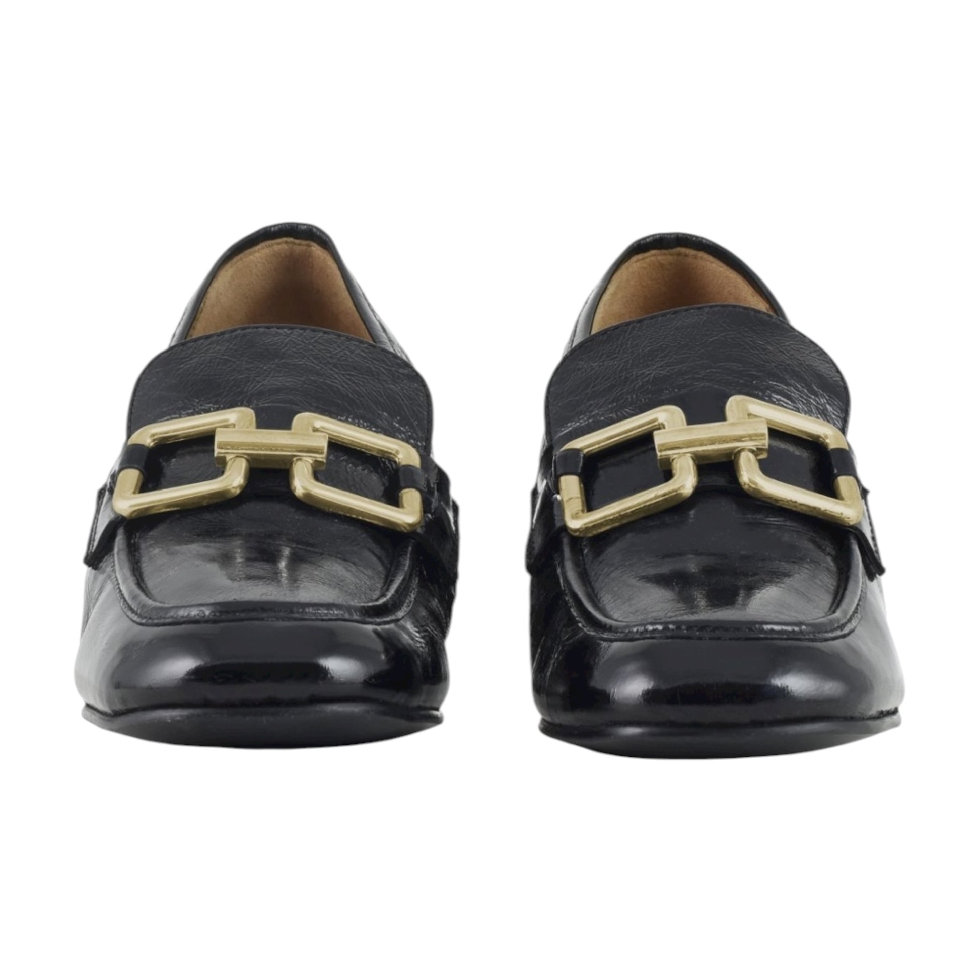 mocassino in naplack si presenta con punta e tacco squadrati, linee eleganti e un raffinato morsetto in metallo dorato.