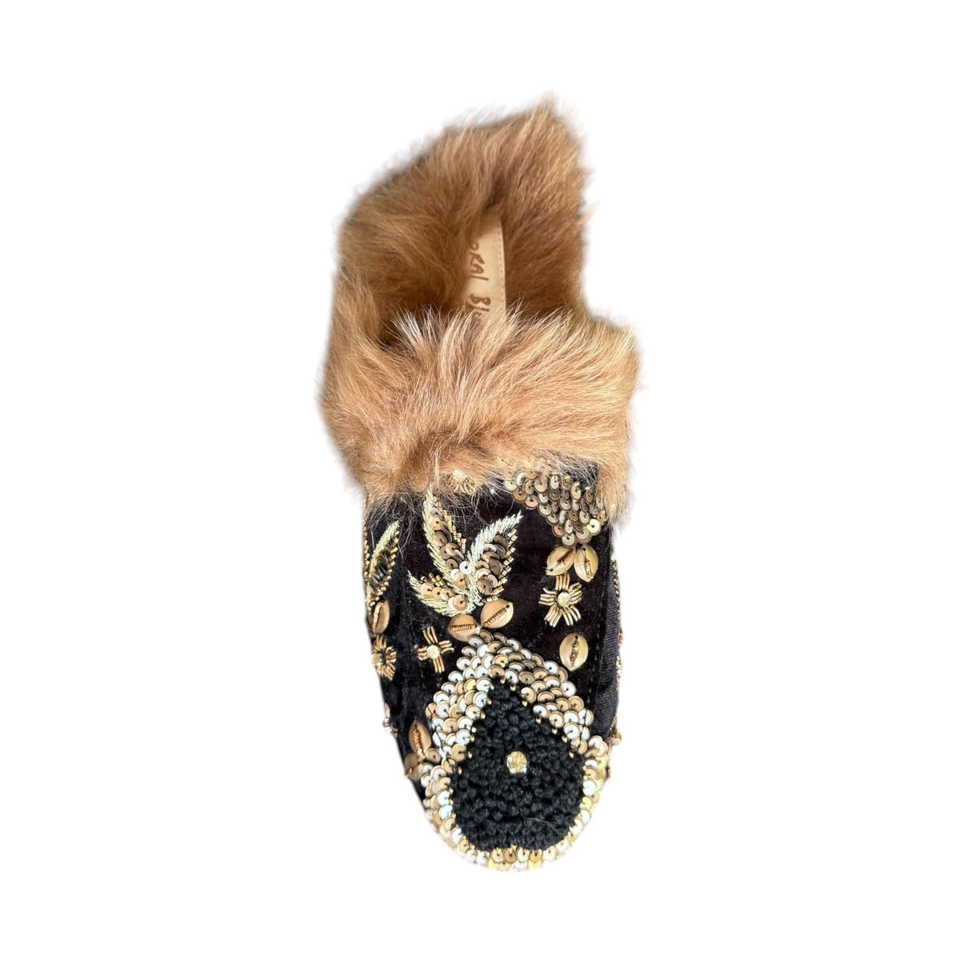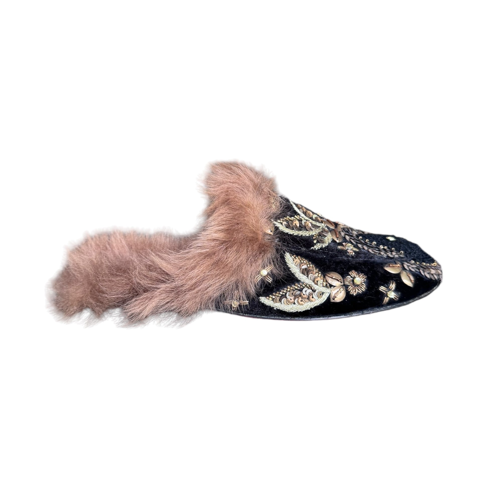 Sabot tomaia in broccato stampato nero multi color, punta a mandorla e interno in pelliccia