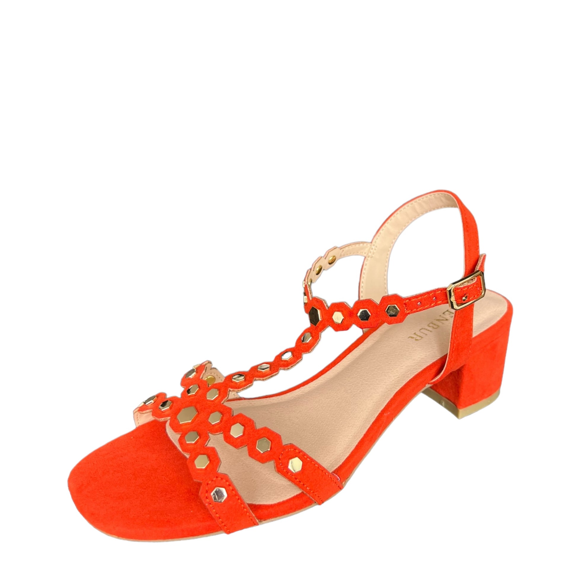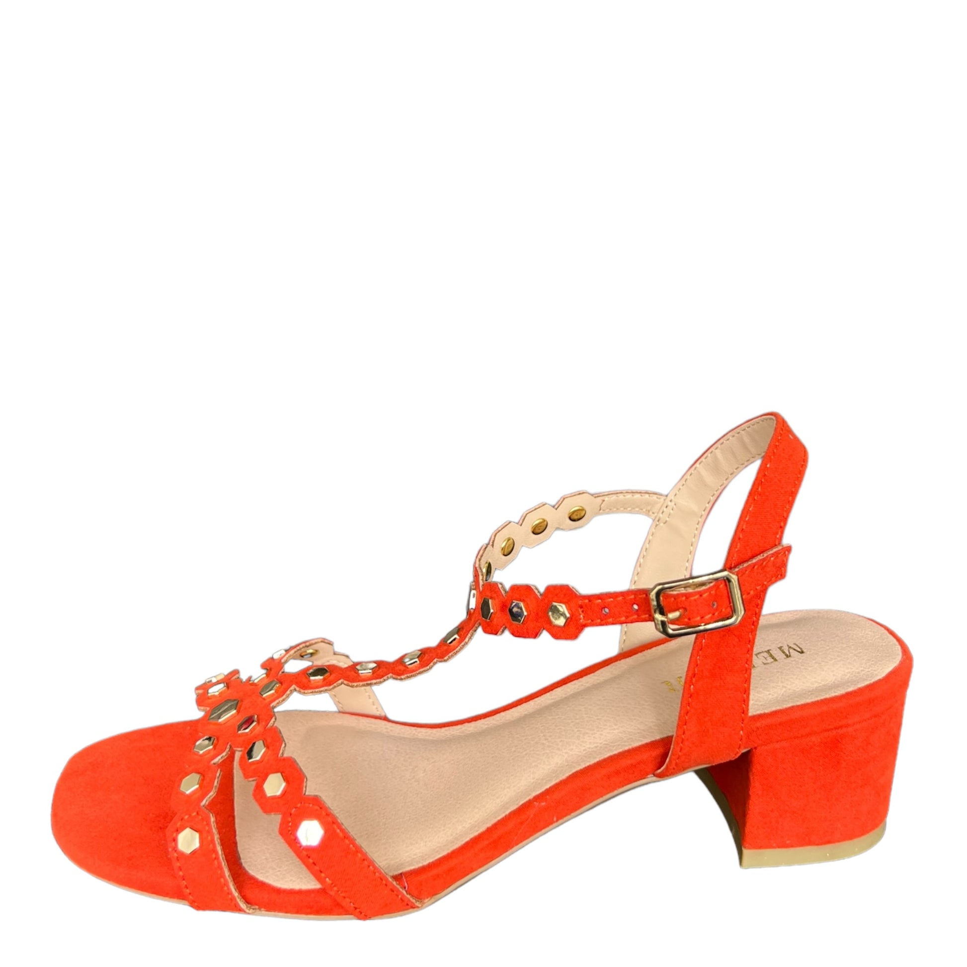Sandalo arancio corallo scamosciato con dettagli borchie oro sulle fasce .