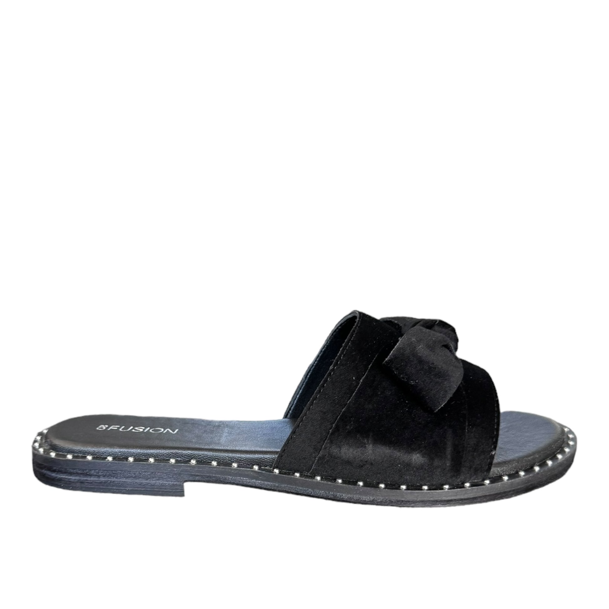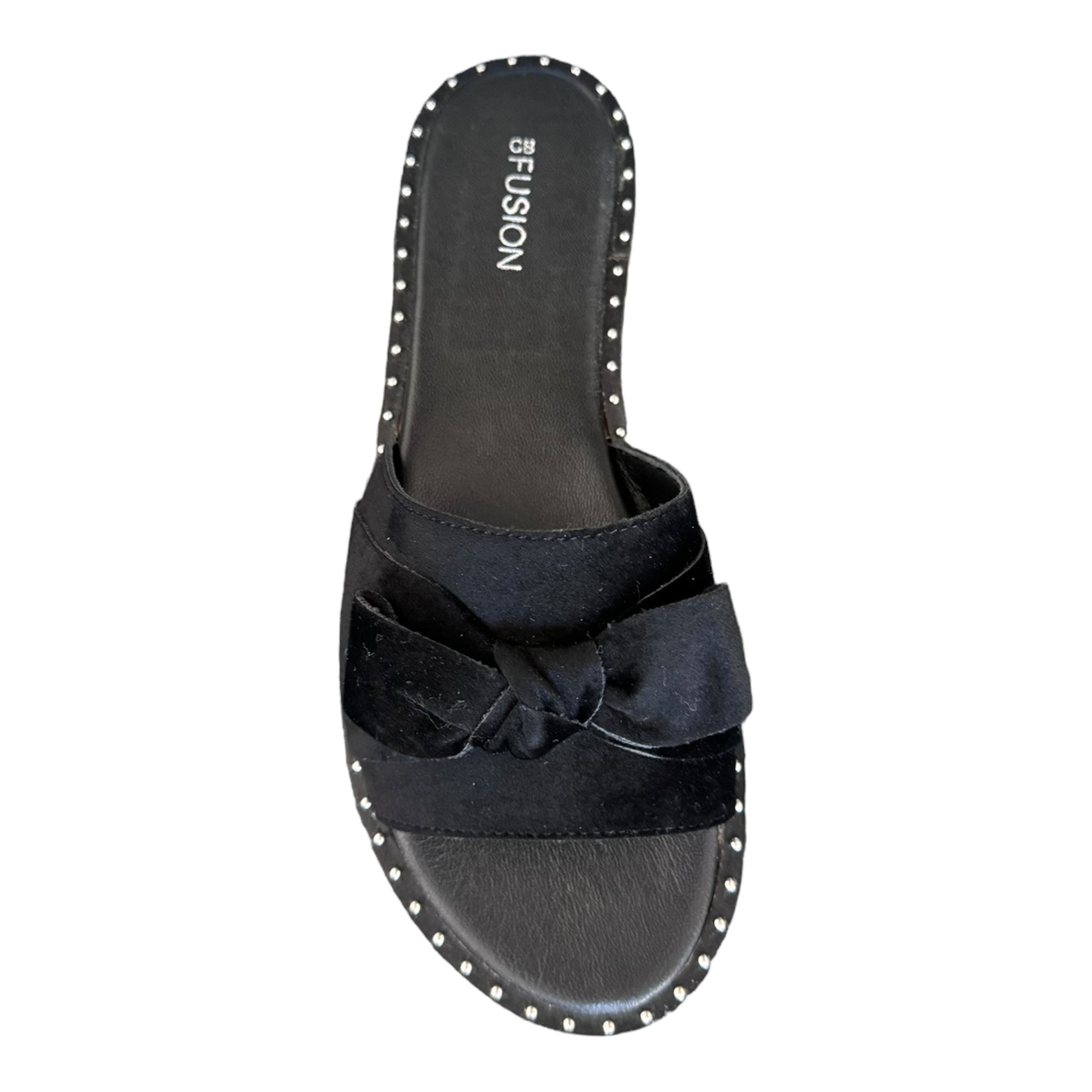 Ciabatta nero con fascia in tessuto, fiocco sul davanti e suola in vero cuoio