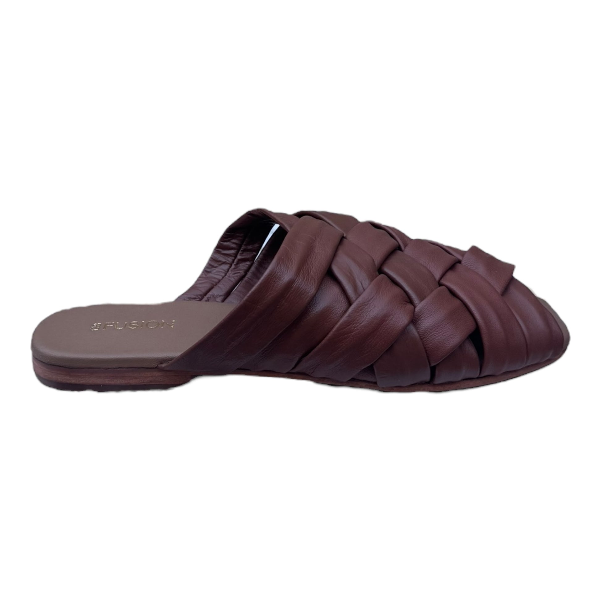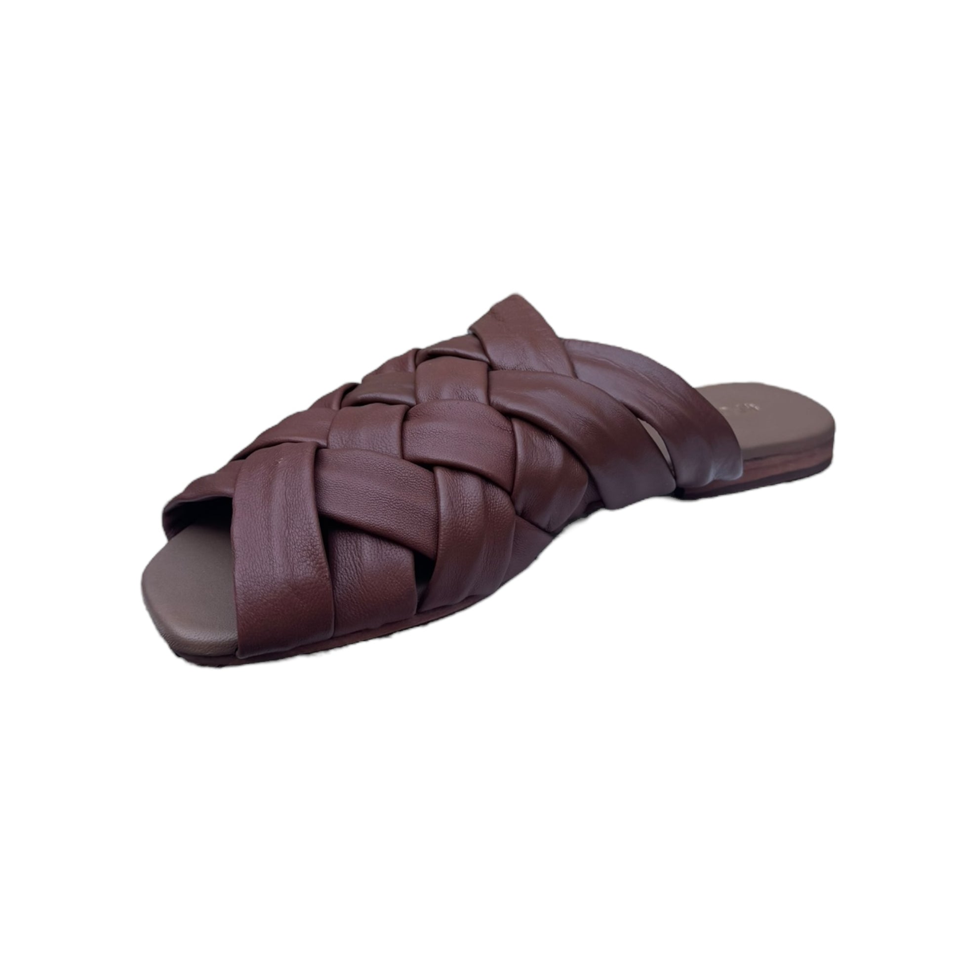 slipper marrone tre fasce di pelle intrecciata e suola ultra flat di cuoio.