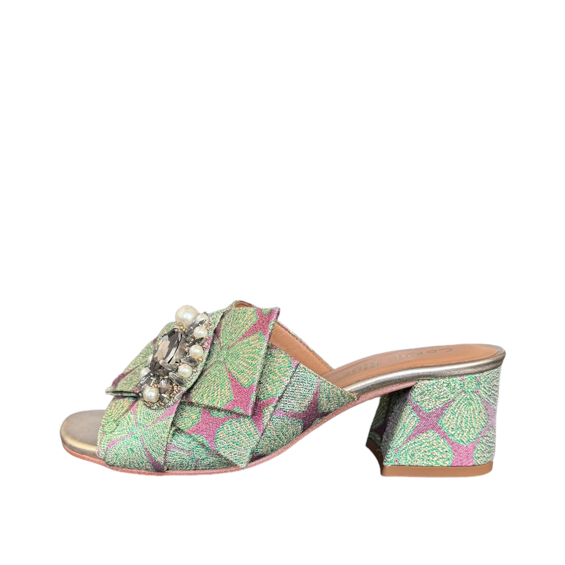 sandalo fucsia e fiori verdi con fiocco e cinturino in tessuto laminato