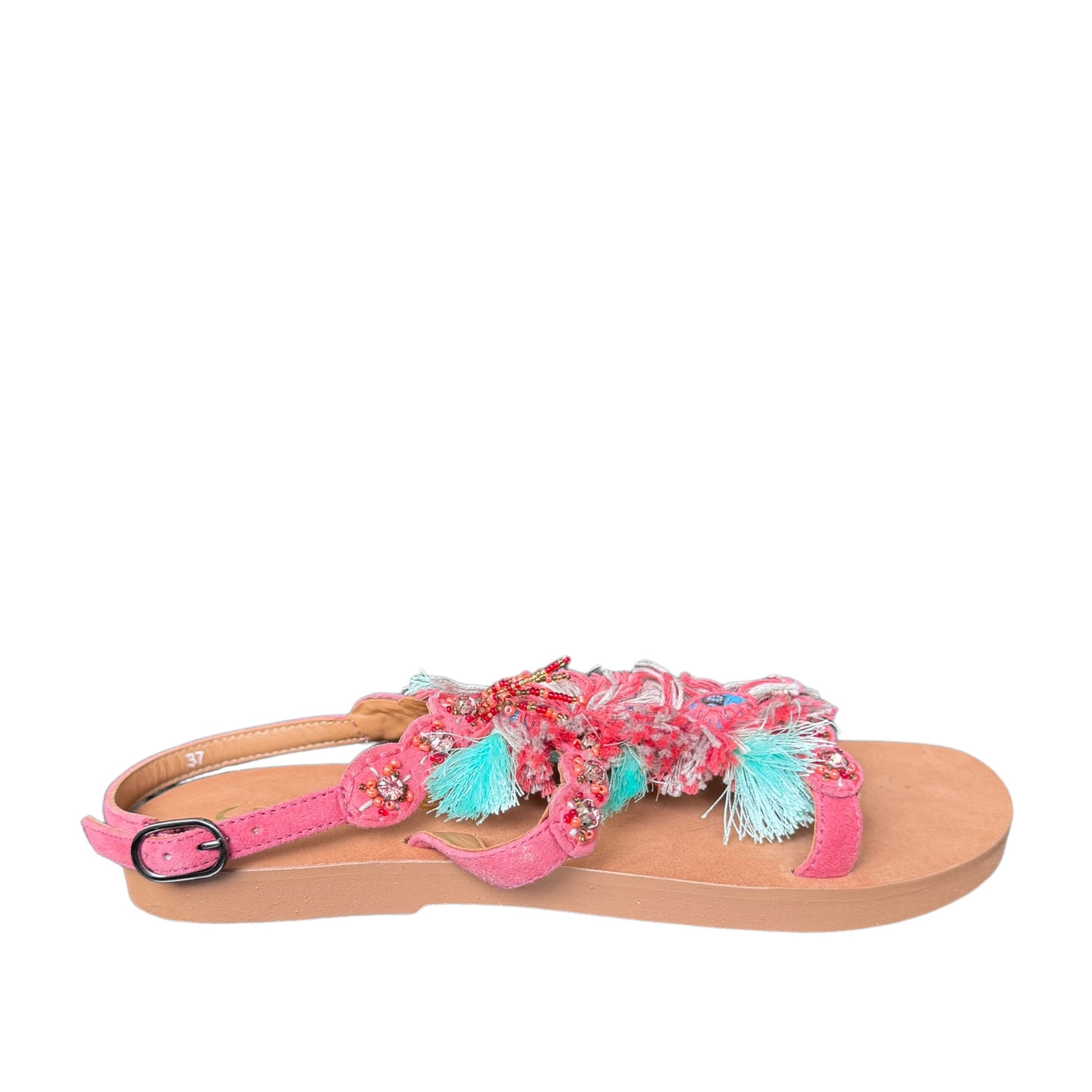 Gli abbellimenti includono nappine verde acqua e rosa e strass multi colore con cinturino in tessuto