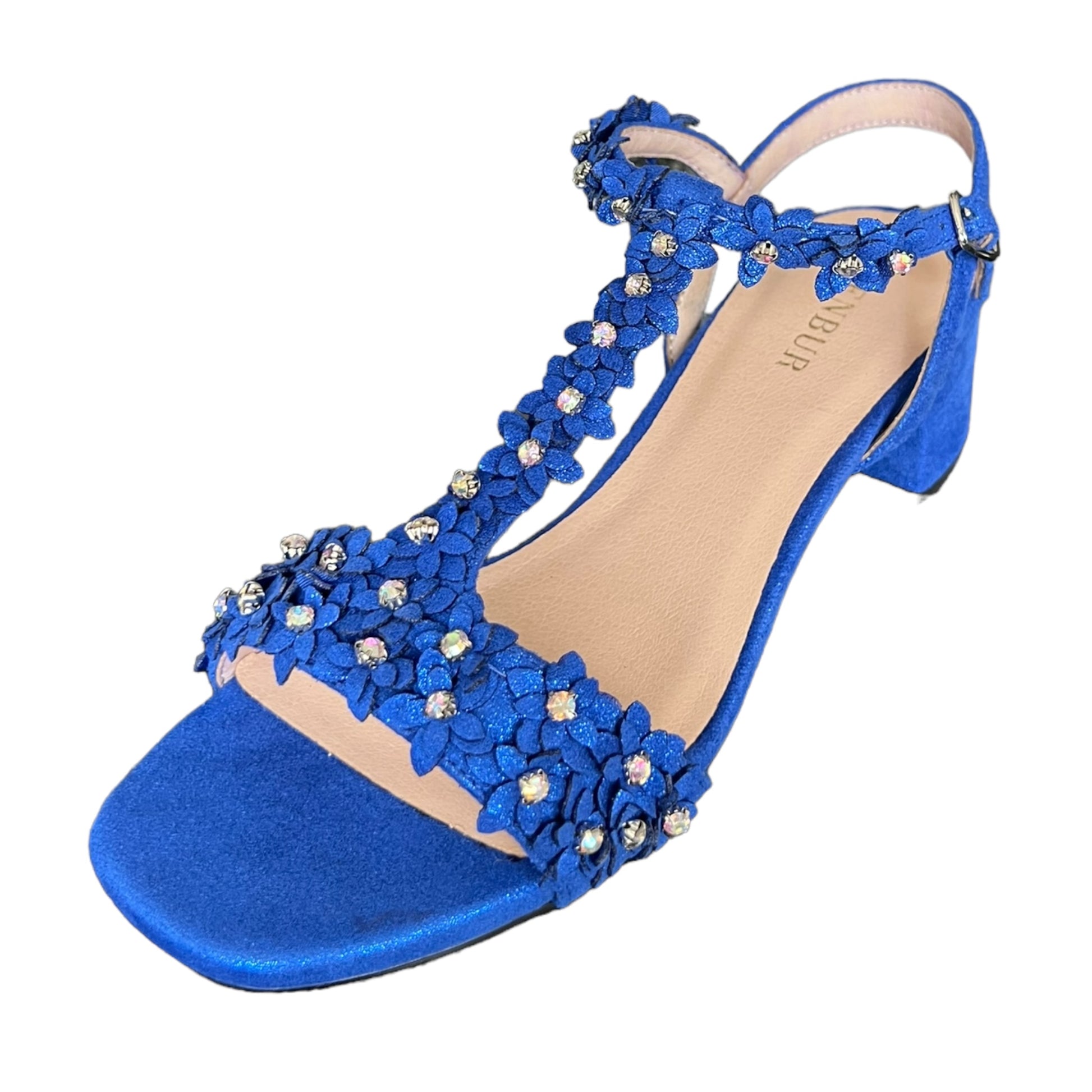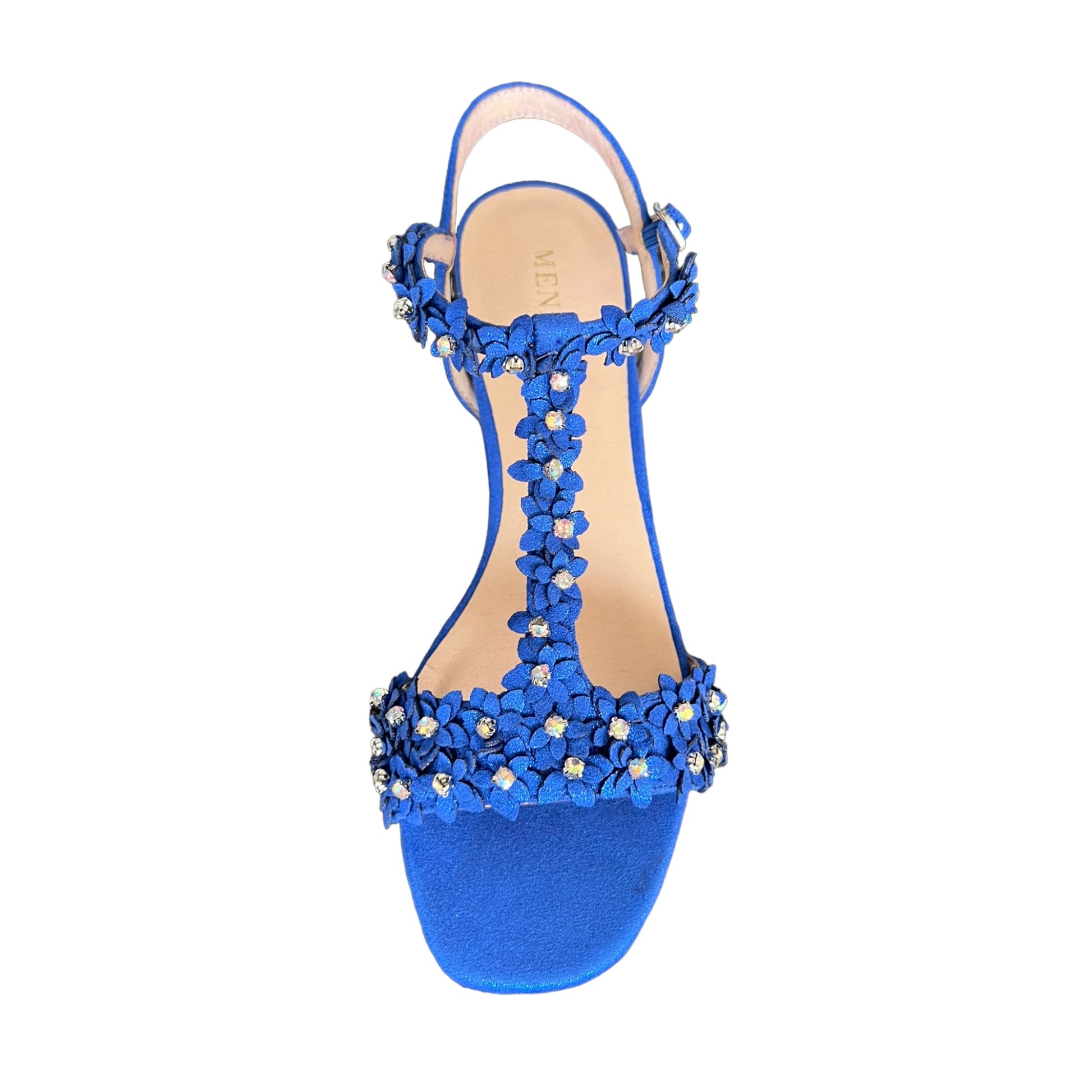 Sandalo blu scamosciato con fiorellini e brillantini sulle fasce, tacco basso 5cm