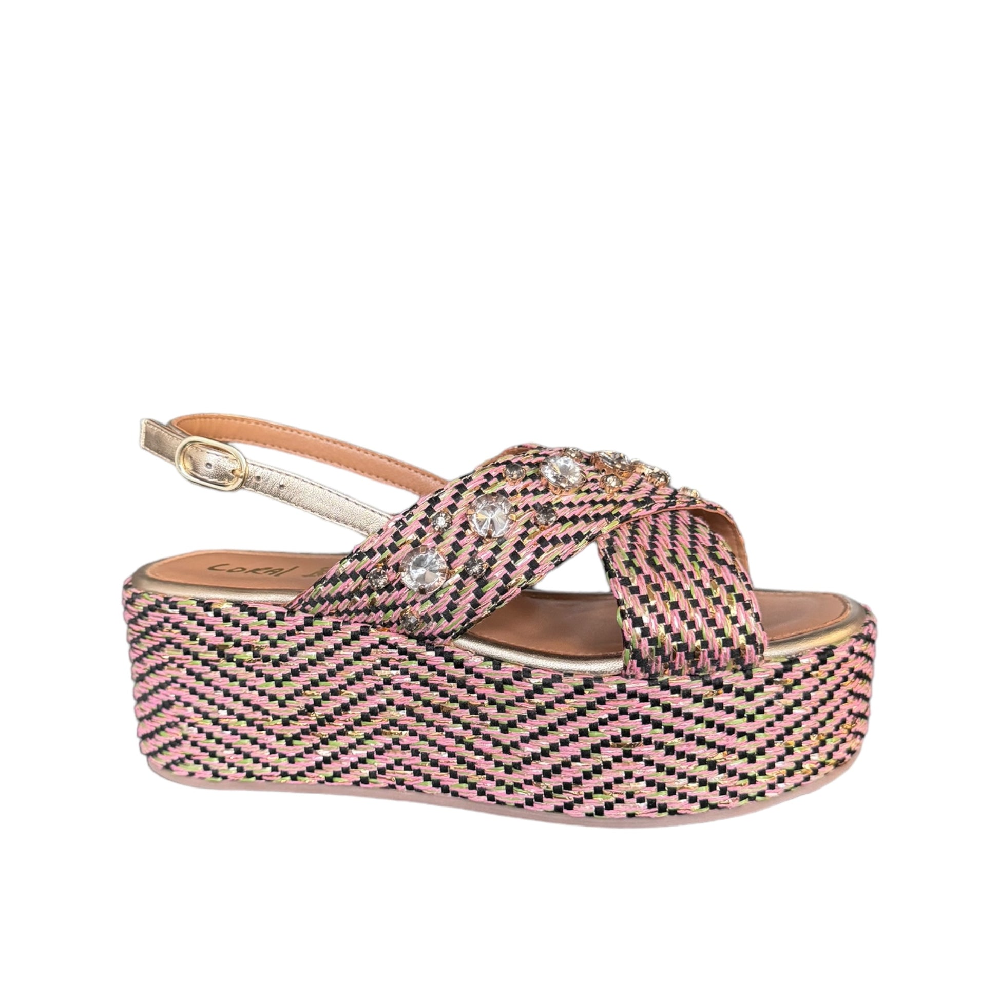 sandalo zeppa in rafia rosa e nera con fasce intrecciate e gioielli sul davanti
