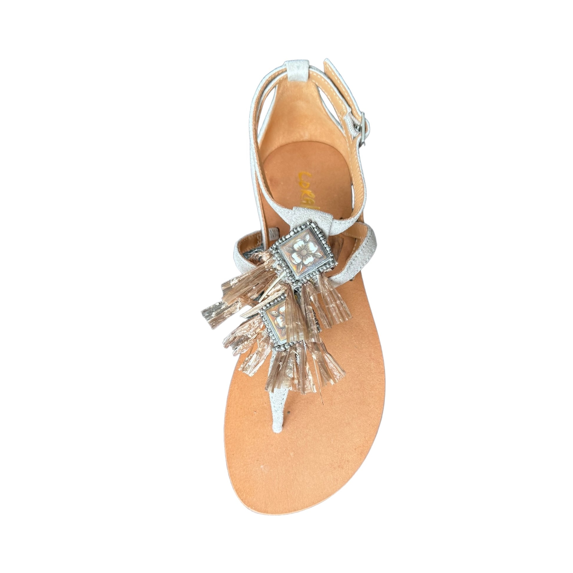 Si tratta di un sandalo caratterizzato da un design infradito con abbellimenti decorativi sul cinturino.