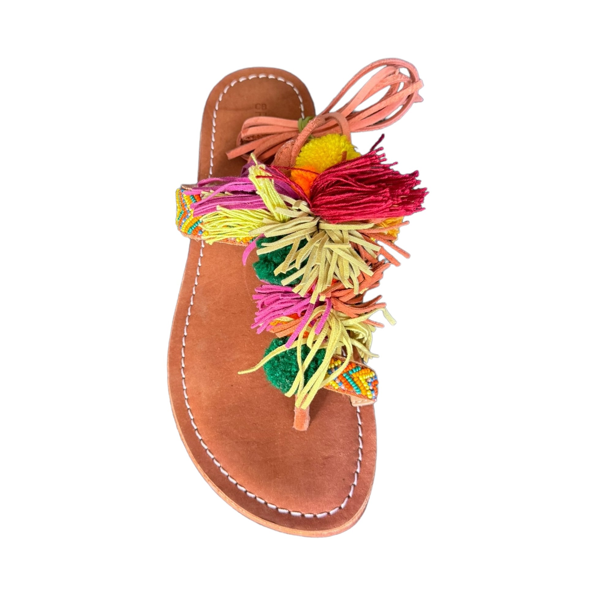 sandalo infradito in cuoio presenta un design allacciato, con cinturini che possono essere allacciati attorno alla caviglia o al polpaccio. Ha un mix di perline e nappine sul davanti multi color
