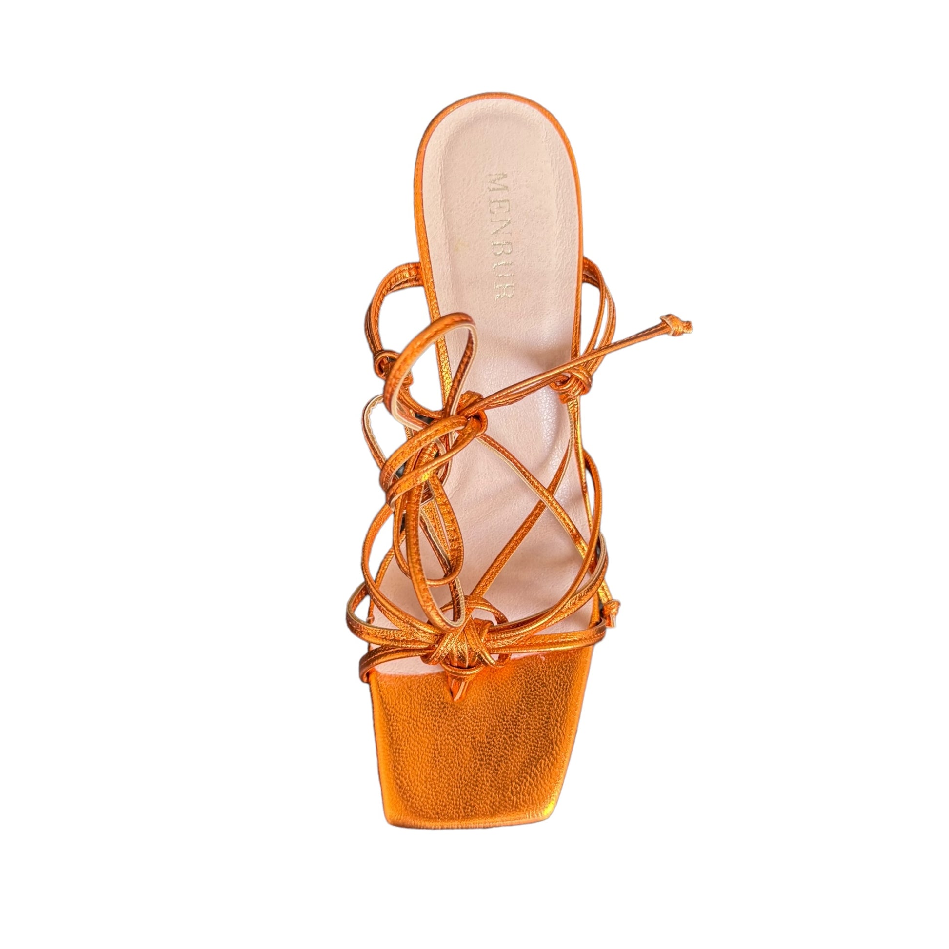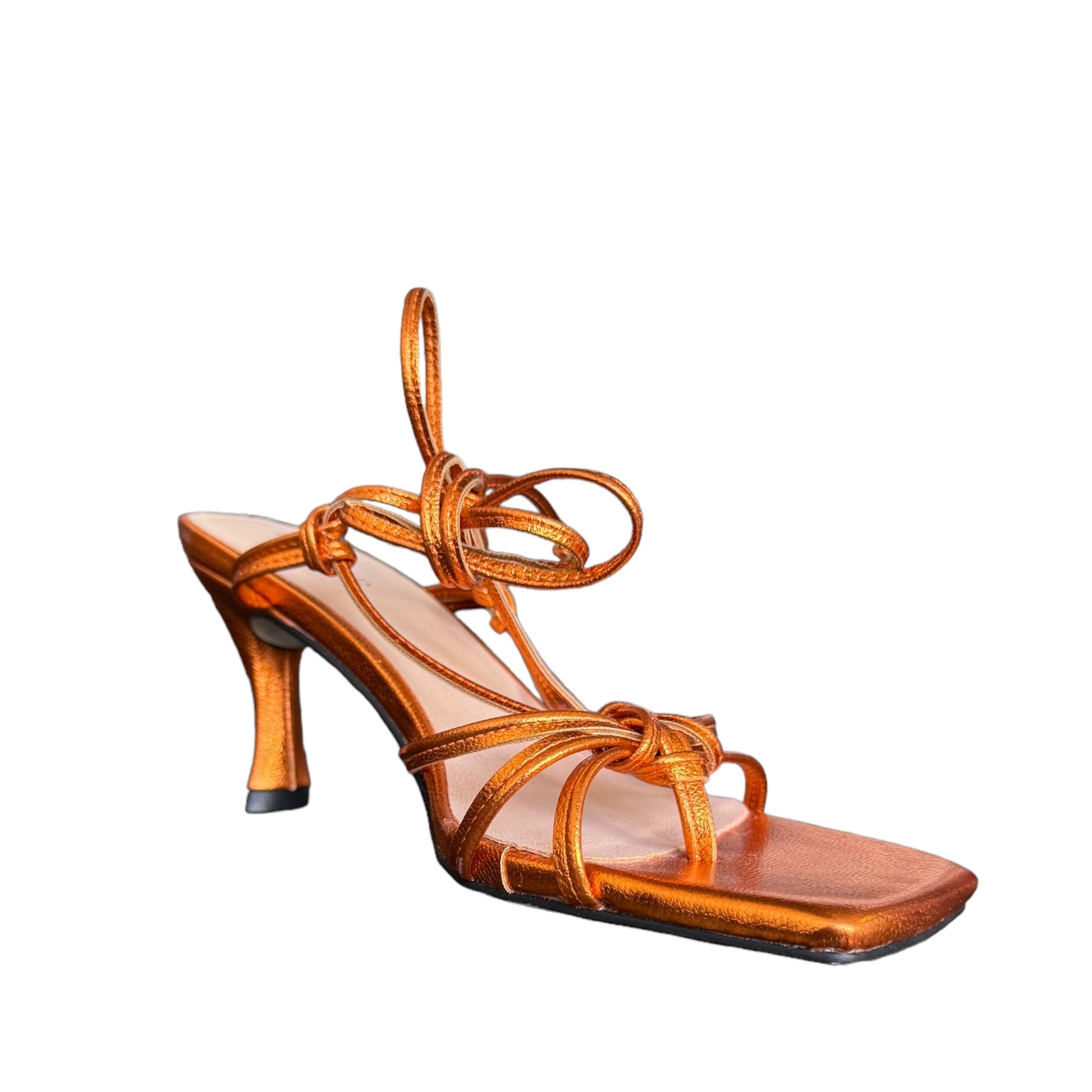 sandalo in simil pelle laminato arancione con cinturino da intrecciare alla caviglia