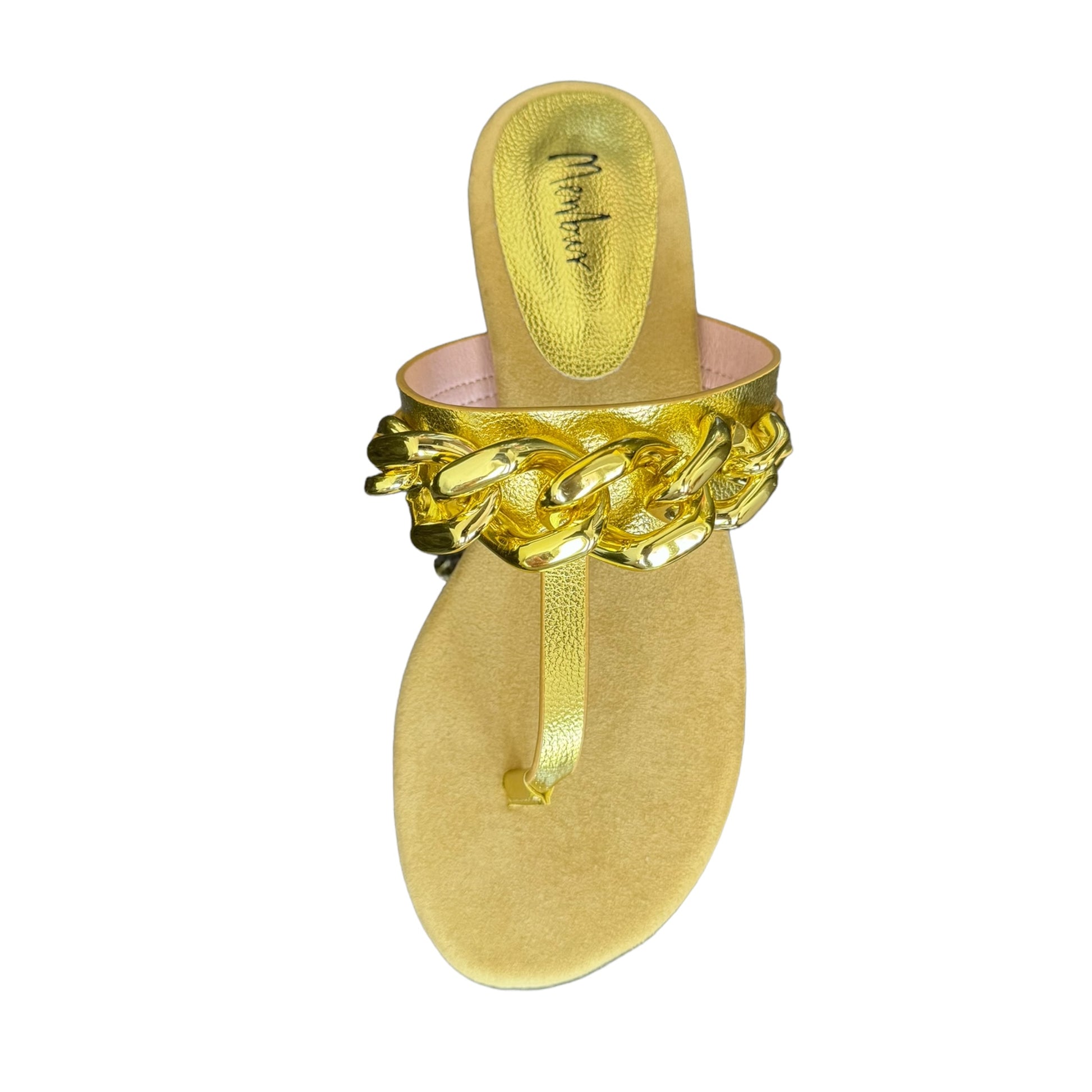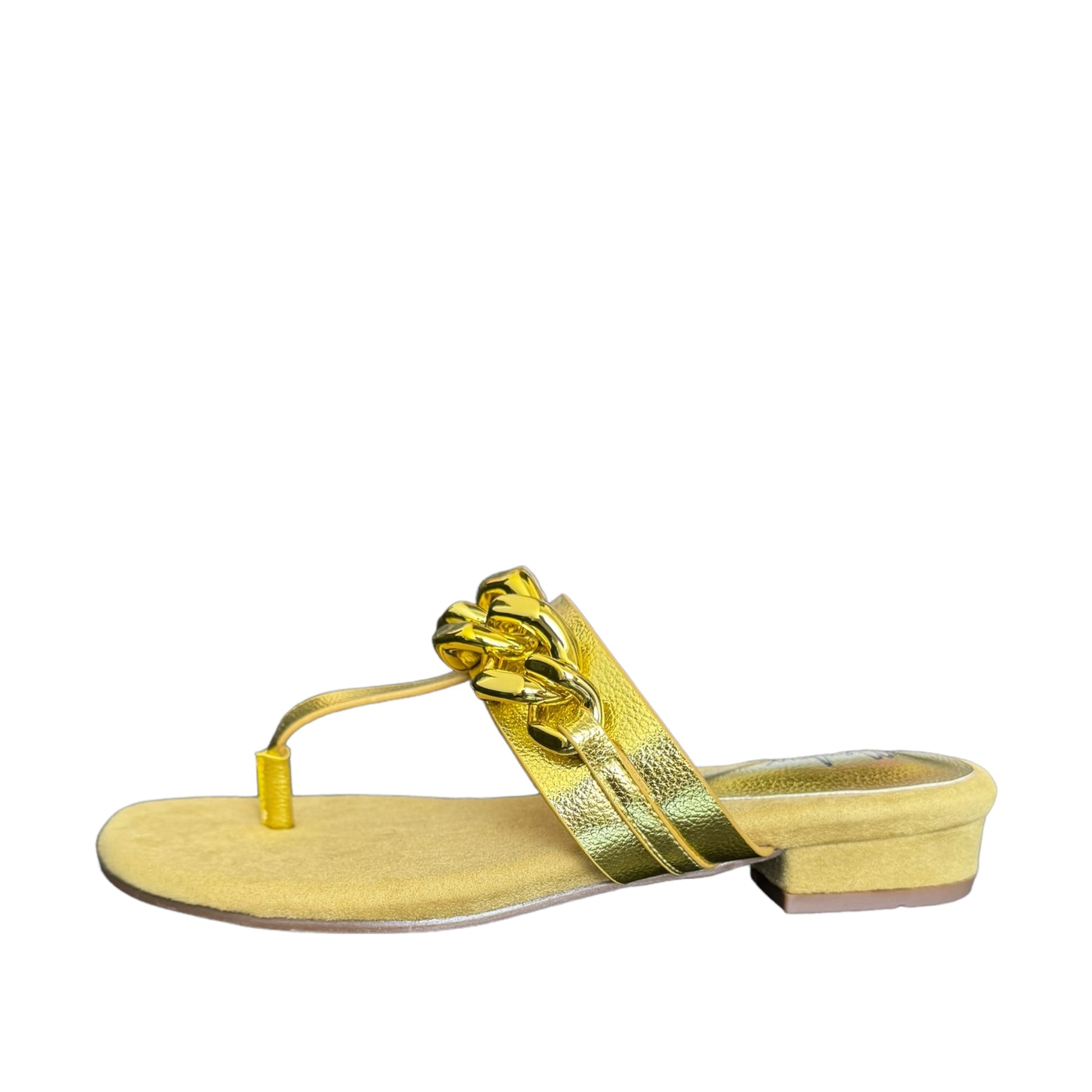 Sandalo basso infradito giallo in tessuto e cinturino in simil pelle laminato con dettaglio catena sul davanti
