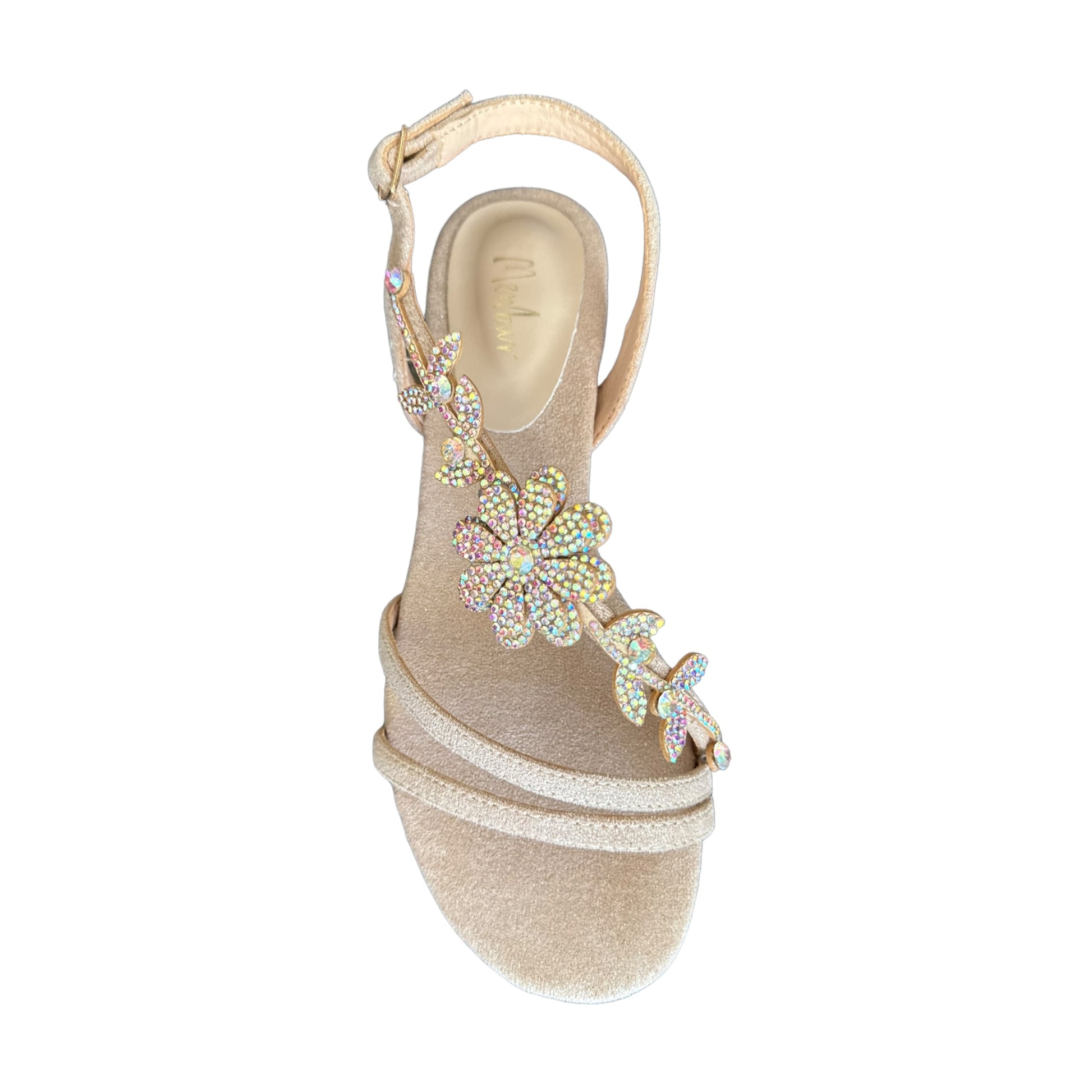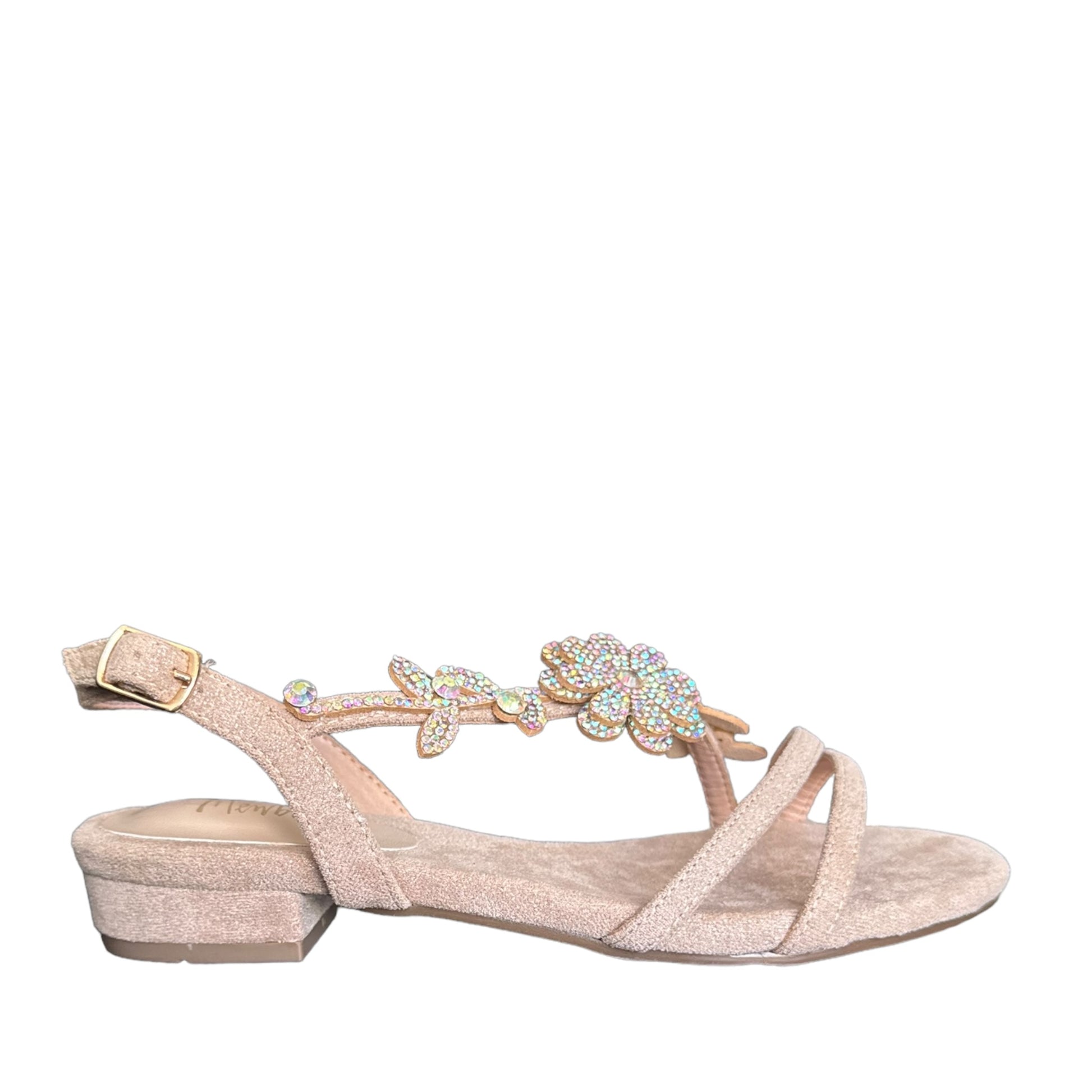 Sandalo basso in tessuto rosa cipria con decorazione floreale