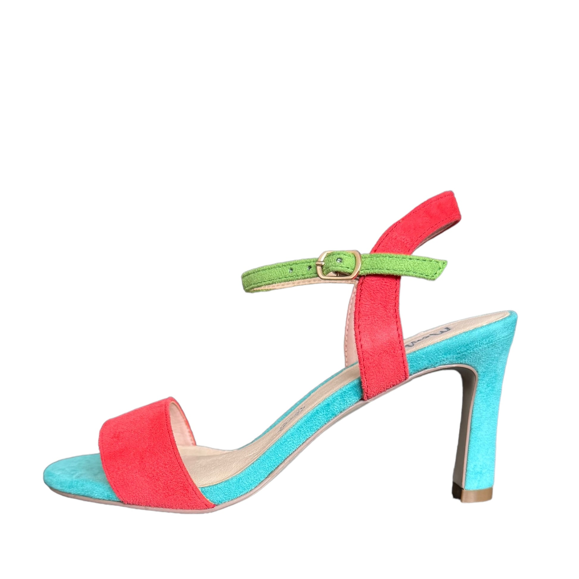 Sandalo in tessuto con suola turchese e cinturino corallo